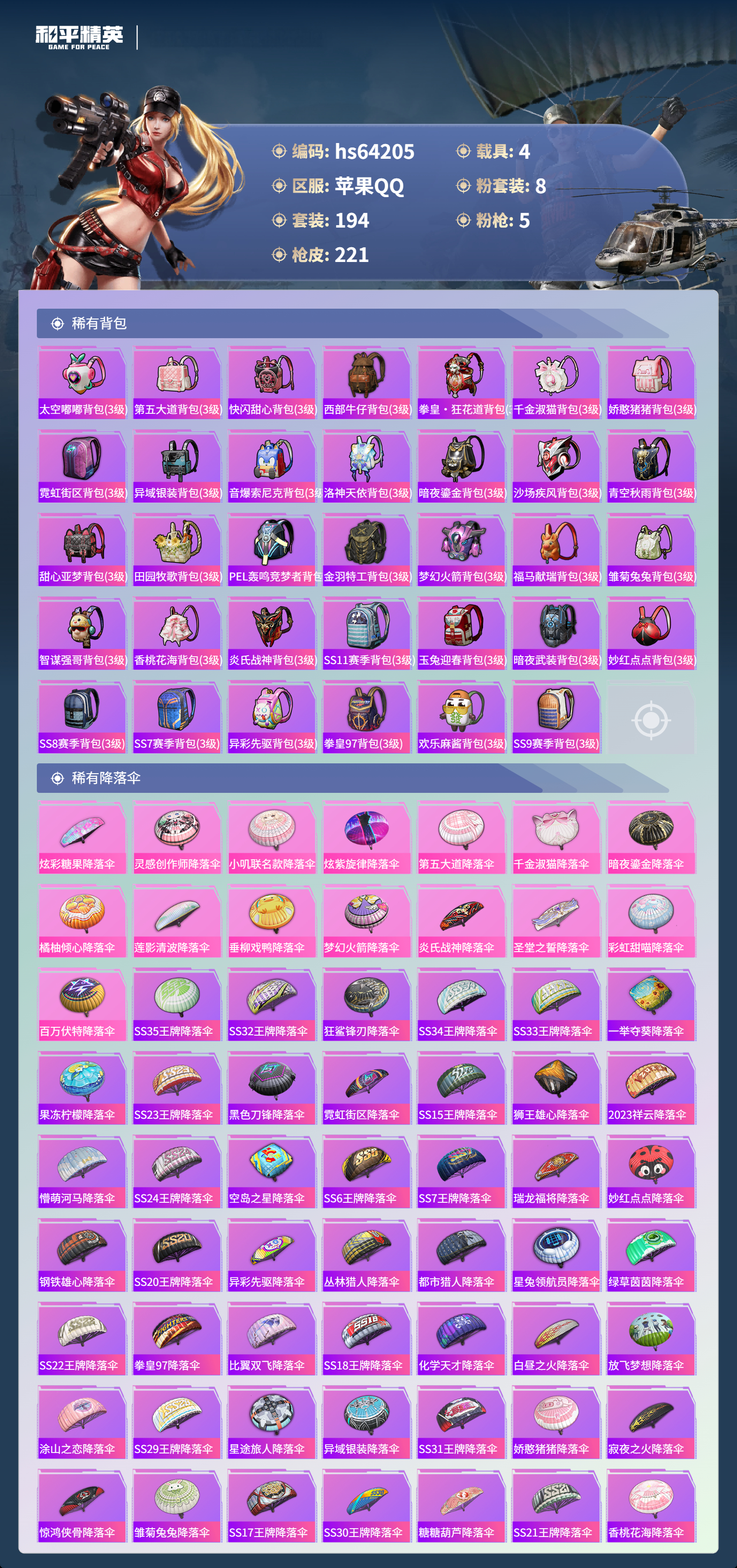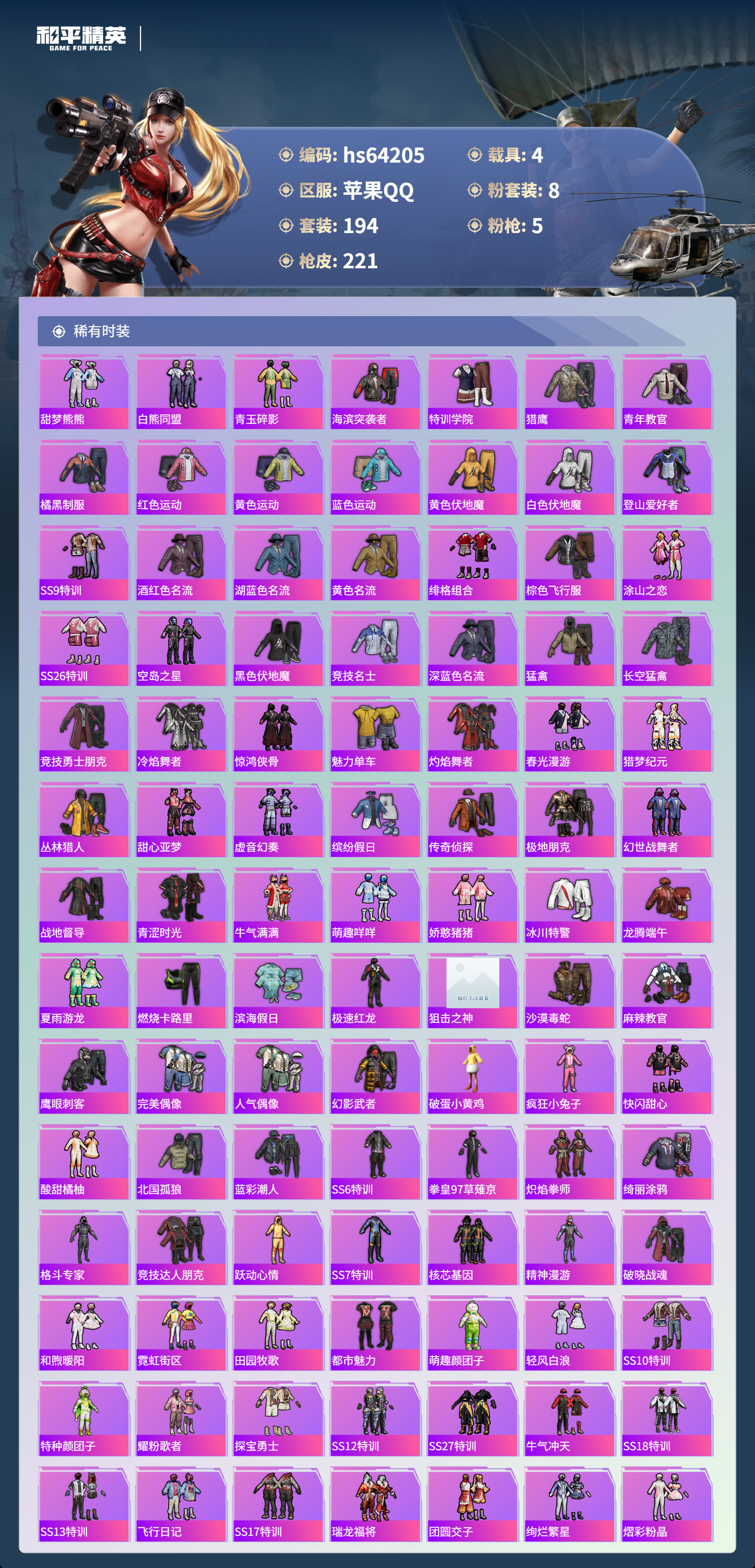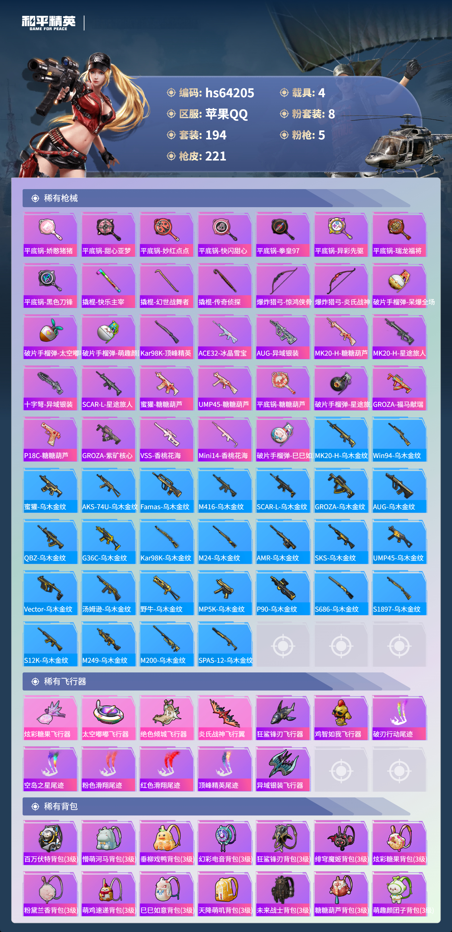 hs64205 苹果手Q-18王牌印记-8粉装-5特效枪-4载具-79323热力值-194套装-221枪皮-5卓越印记-3传奇印记