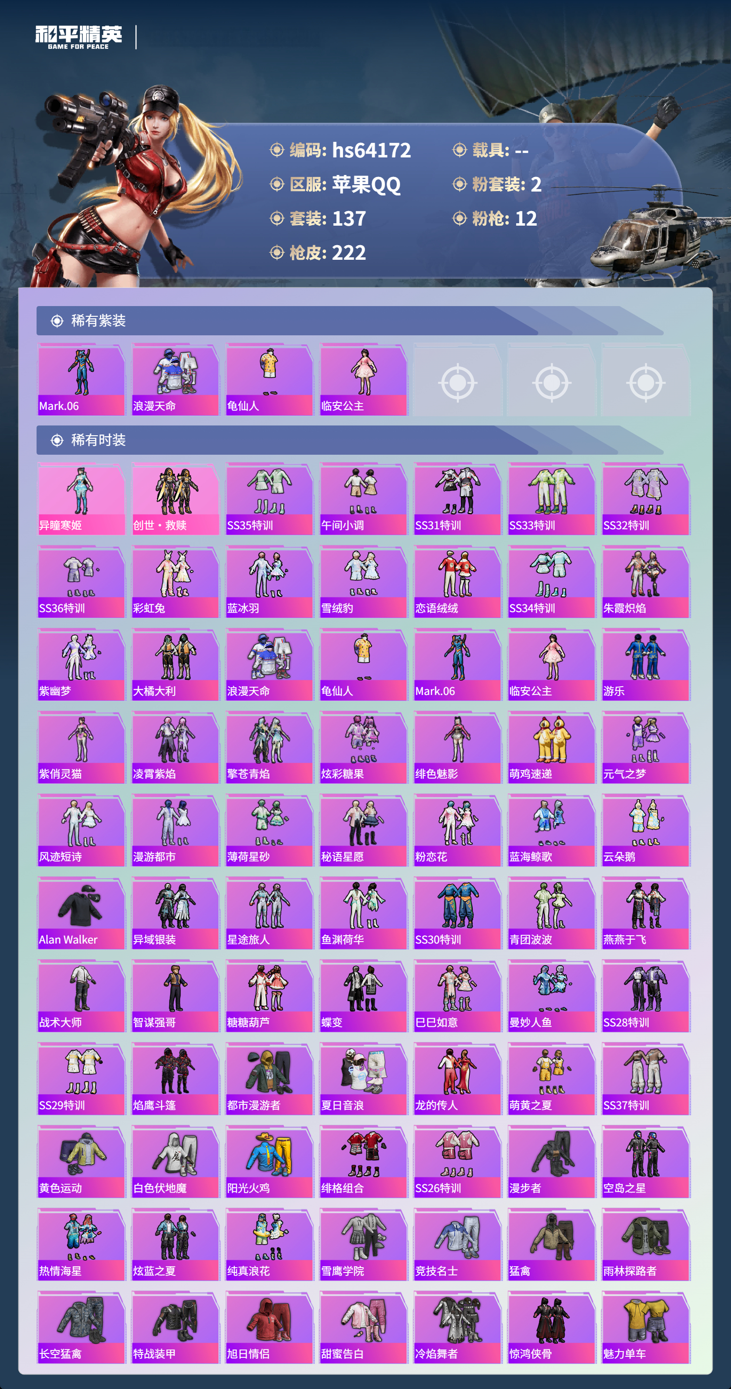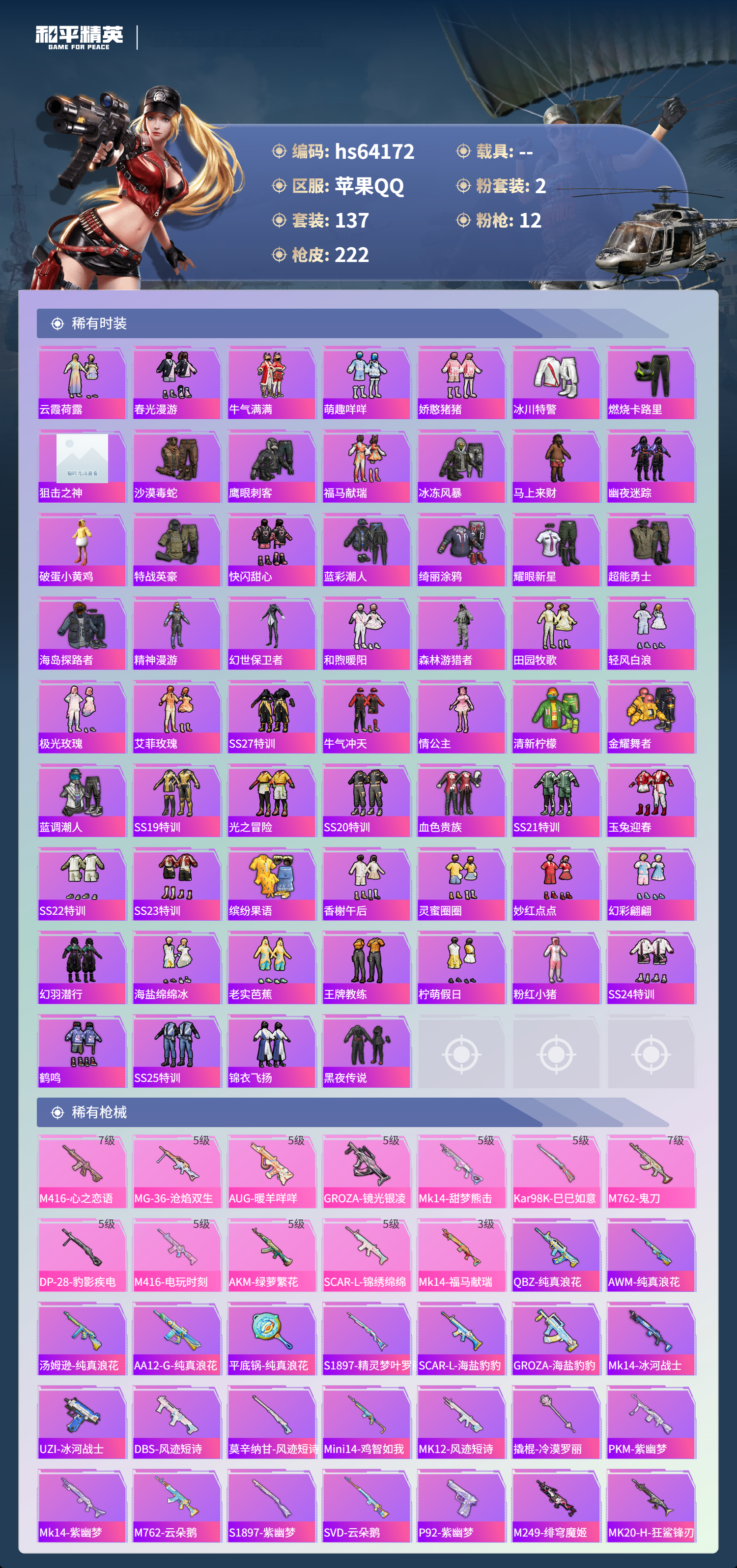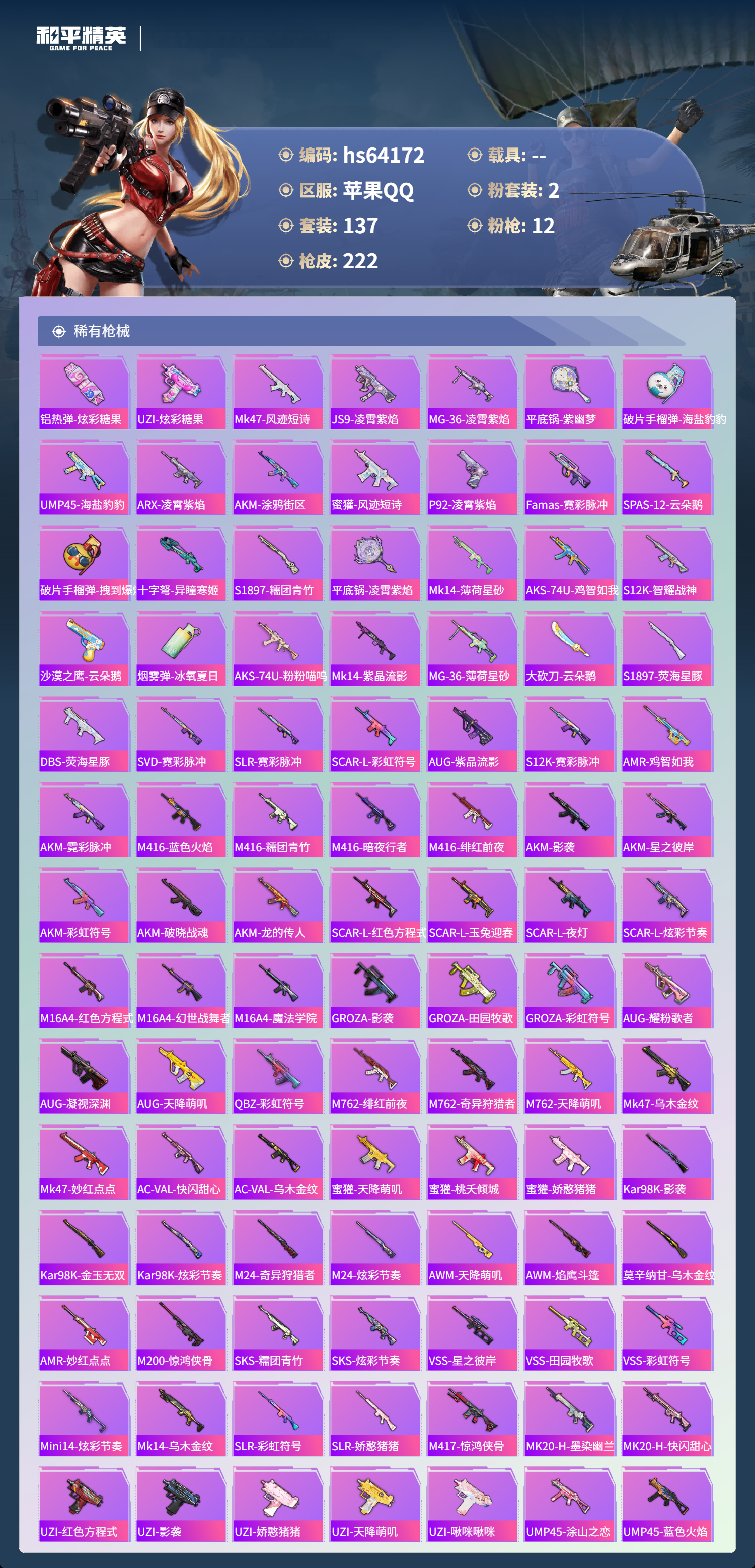 hs64172 苹果手Q-17王牌印记-2粉装-12特效枪-62728热力值-137套装-222枪皮-4卓越印记-4传奇印记