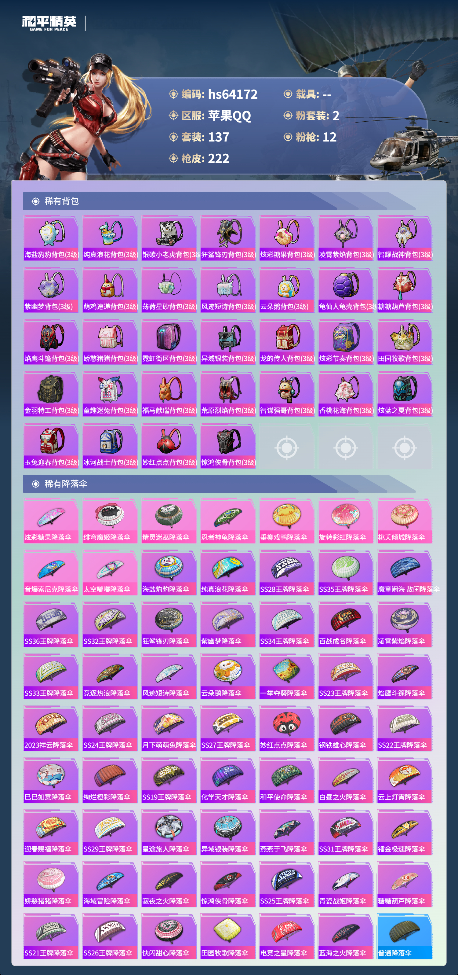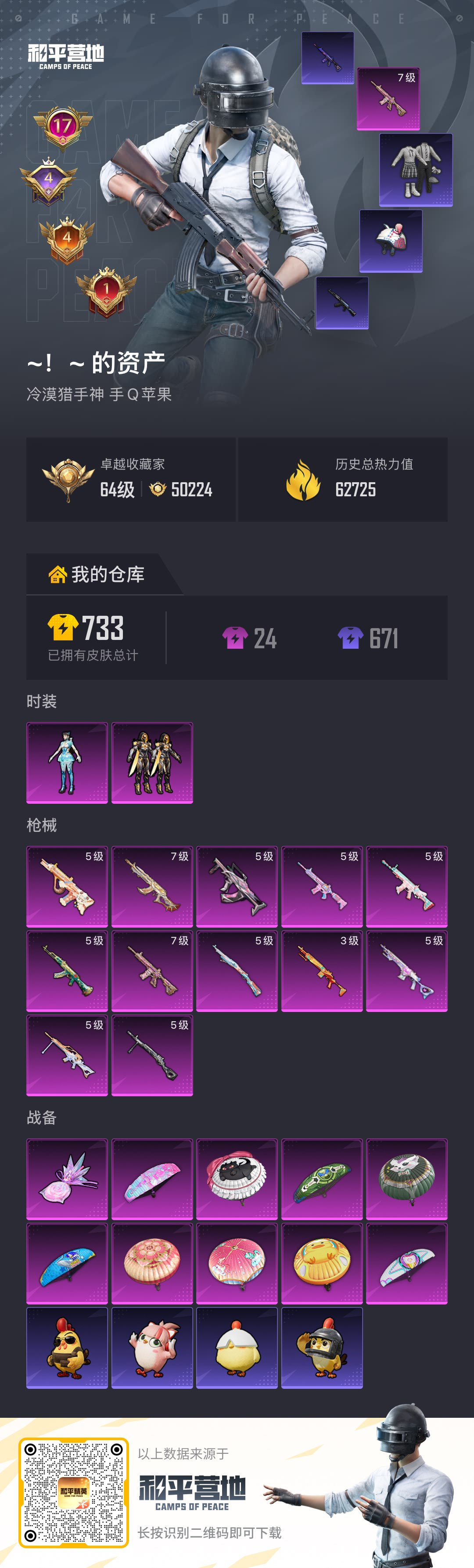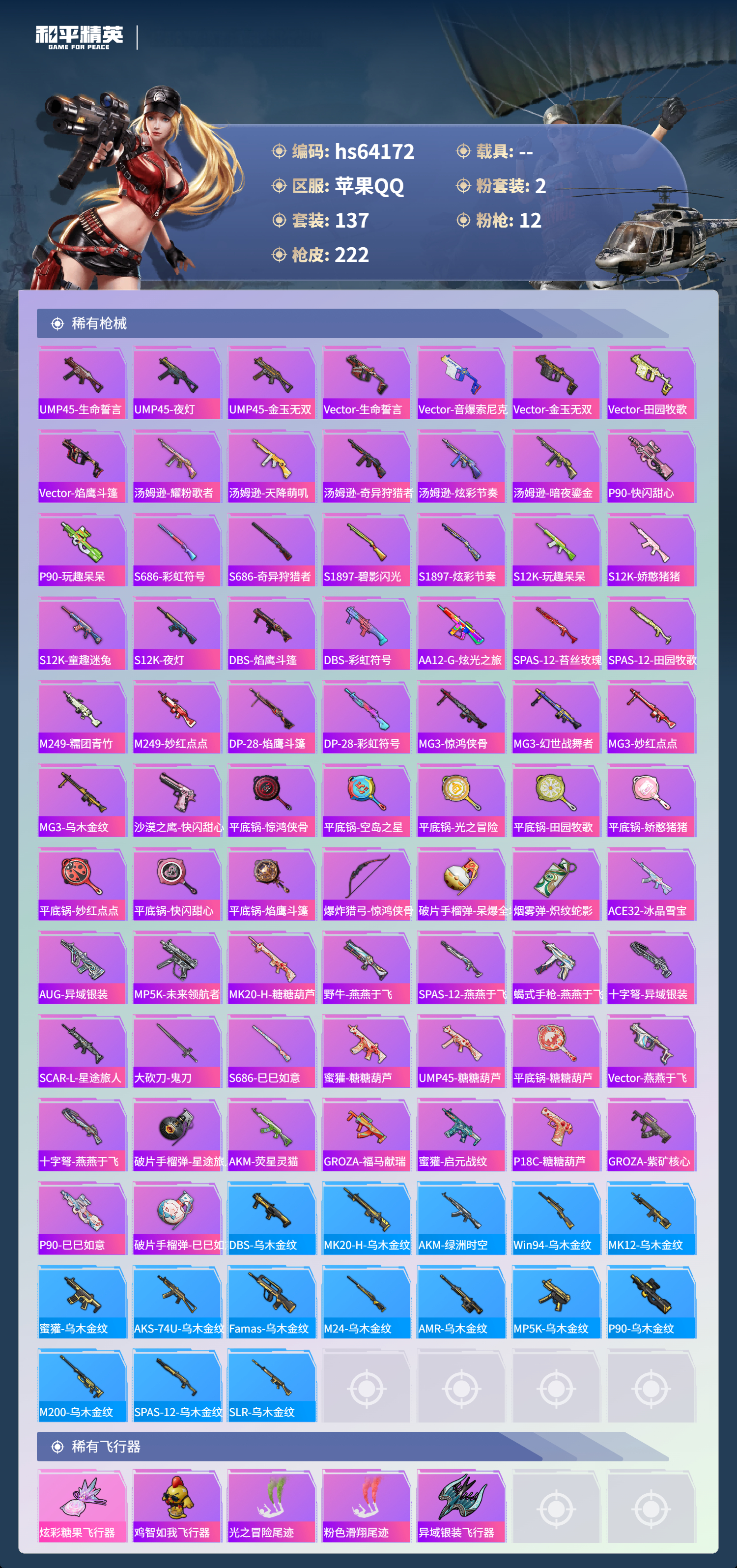 hs64172 苹果手Q-17王牌印记-2粉装-12特效枪-62728热力值-137套装-222枪皮-4卓越印记-4传奇印记