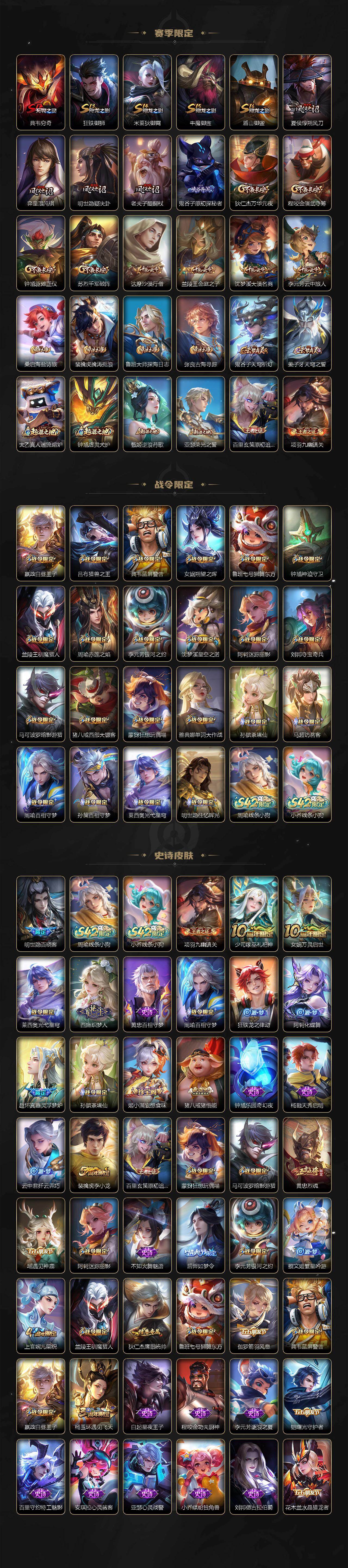 【传说皮肤】:朵莉亚神骥鸣幻洲,后羿神树通天,桑启鸣野蒿,东皇太一灼幽烈阳,干将莫邪久胜战神,百里玄策白虎志,梦奇胖达荣荣,后羿黄金射手座,貂蝉仲夏夜之梦,孙尚香末日机甲,宫本武藏地狱之眼,孙悟空地狱火