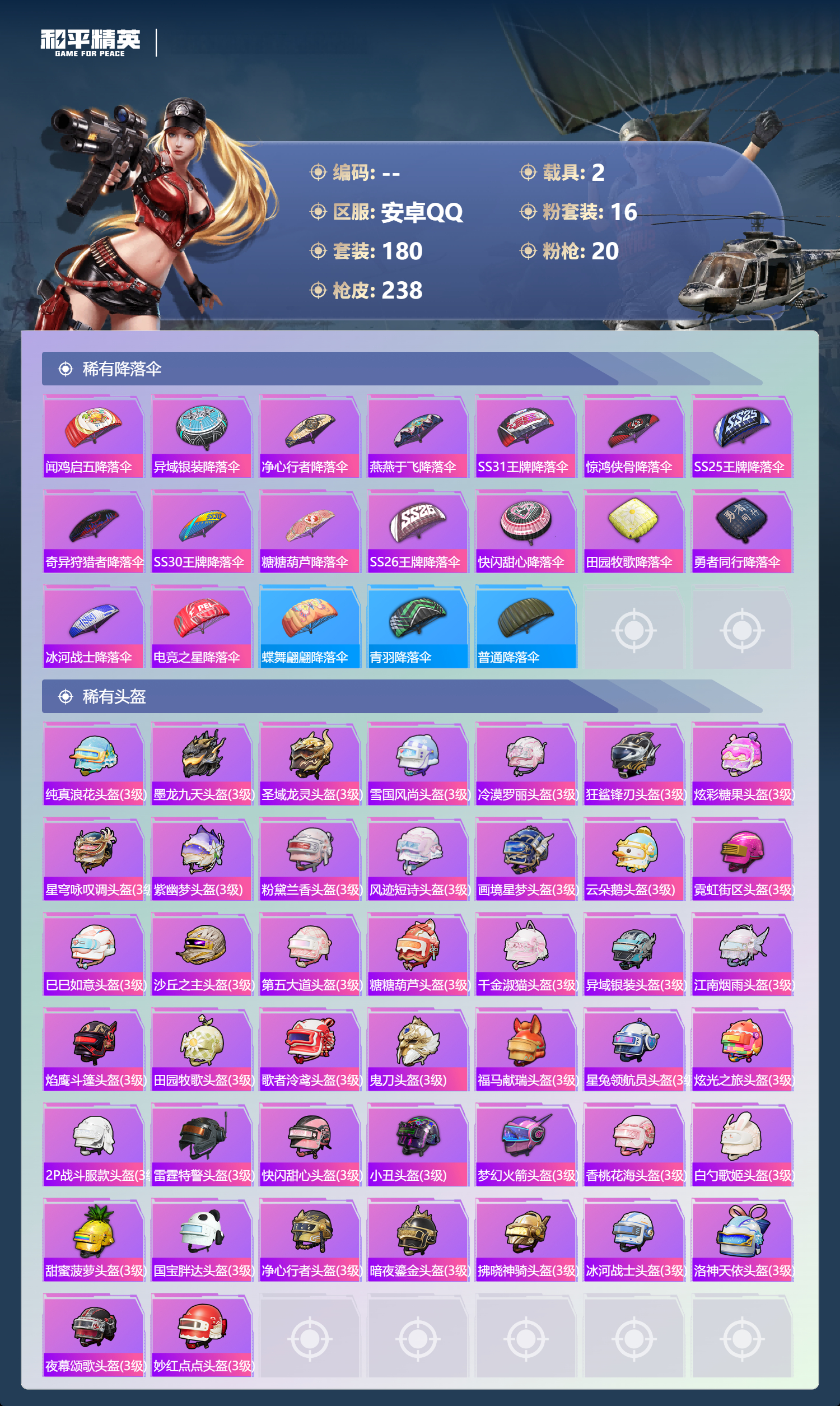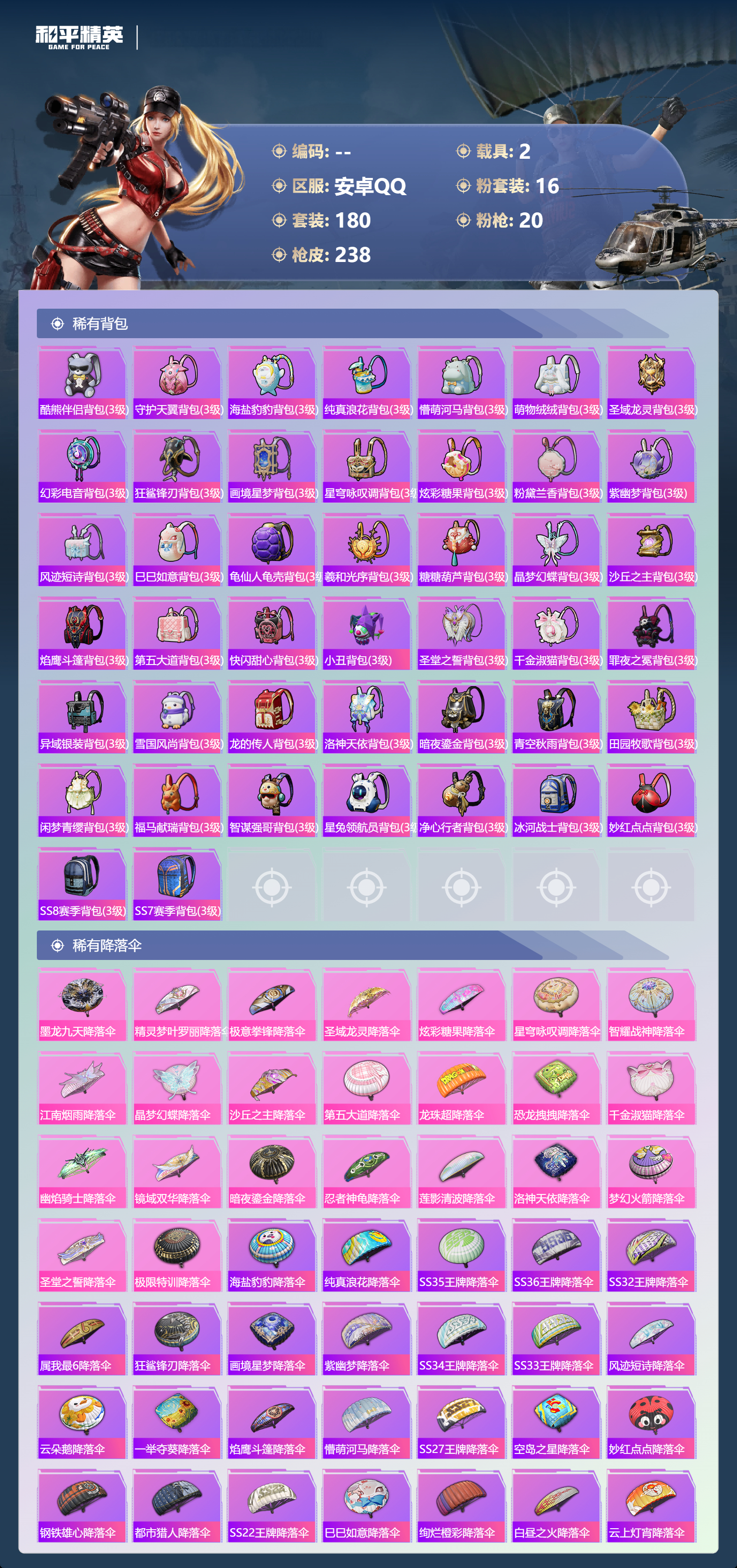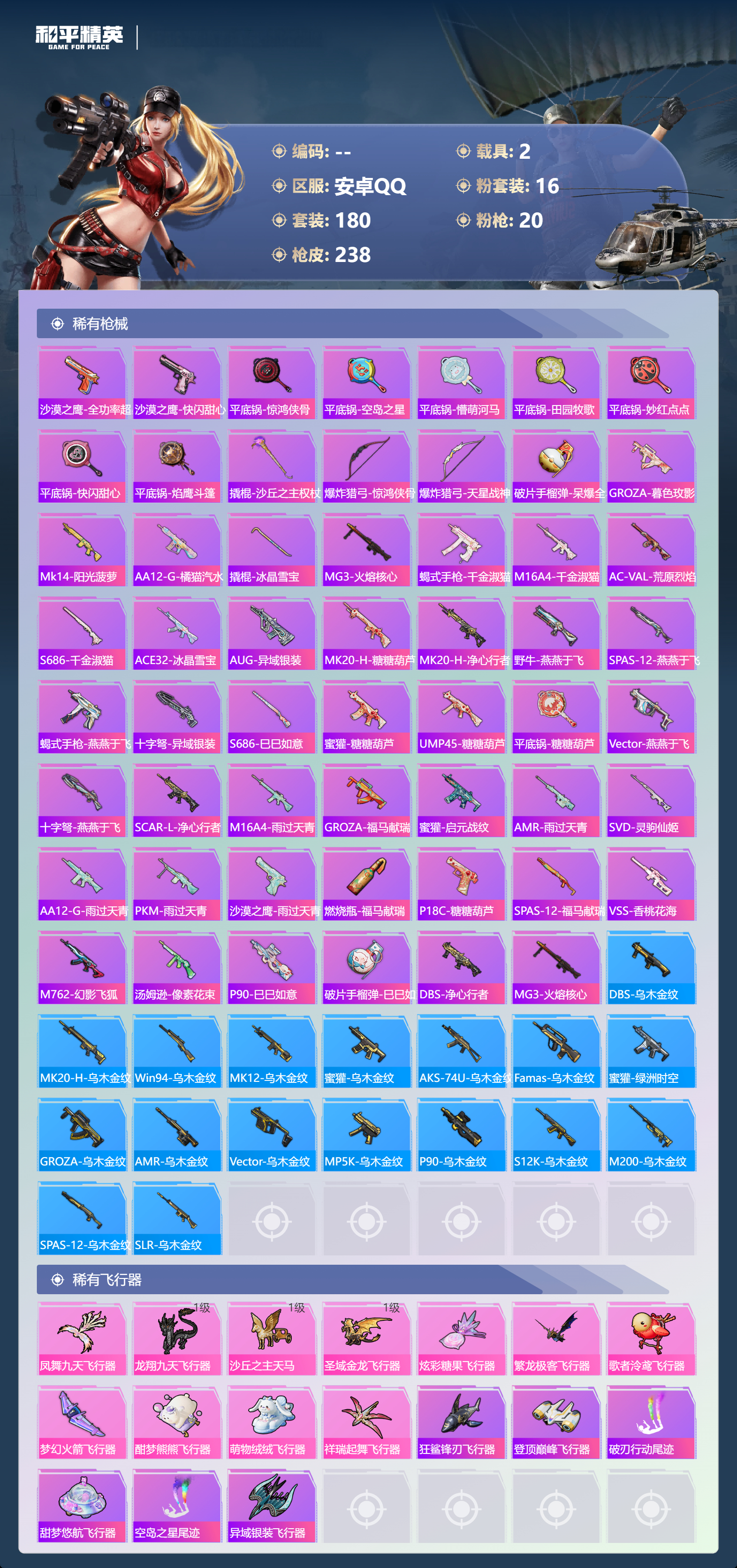 hs64104 安卓手Q-13王牌印记-1红装-16粉装-20特效枪-2载具-93424热力值-180套装-238枪皮-5卓越印记-3传奇印记
