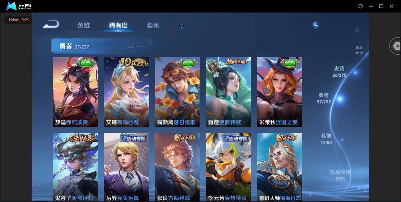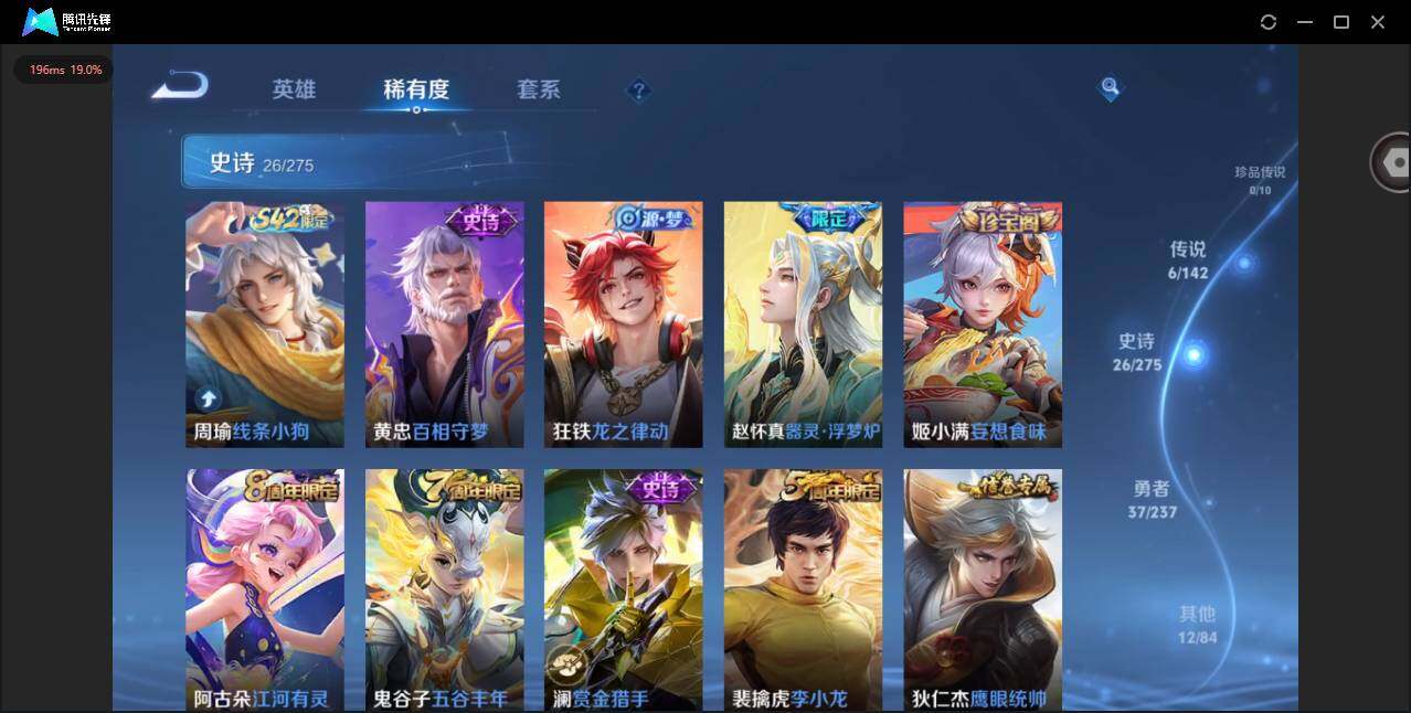 实名: 可修改 贵族等级: V4 英雄数: 109 皮肤数: 81 星传说:
