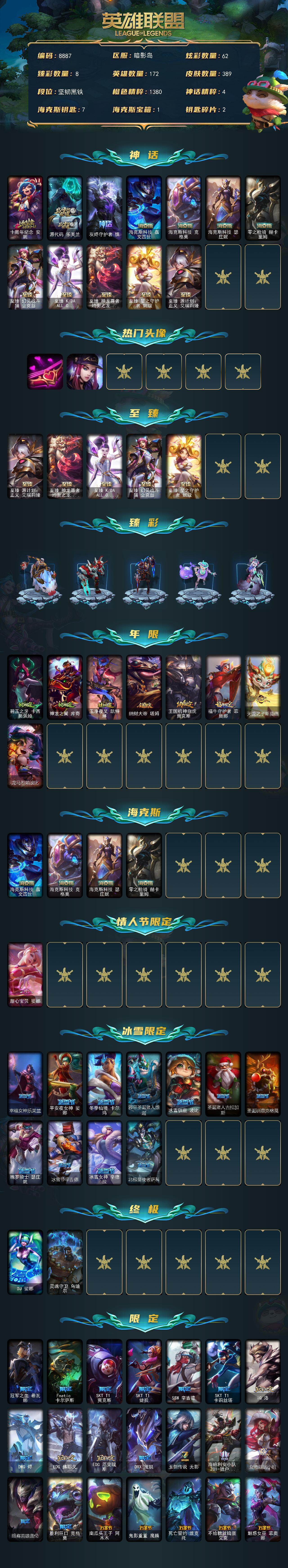 未定级段位-172英雄-389皮肤-62炫彩-2终极-12神话-54限定-51传说-81史诗