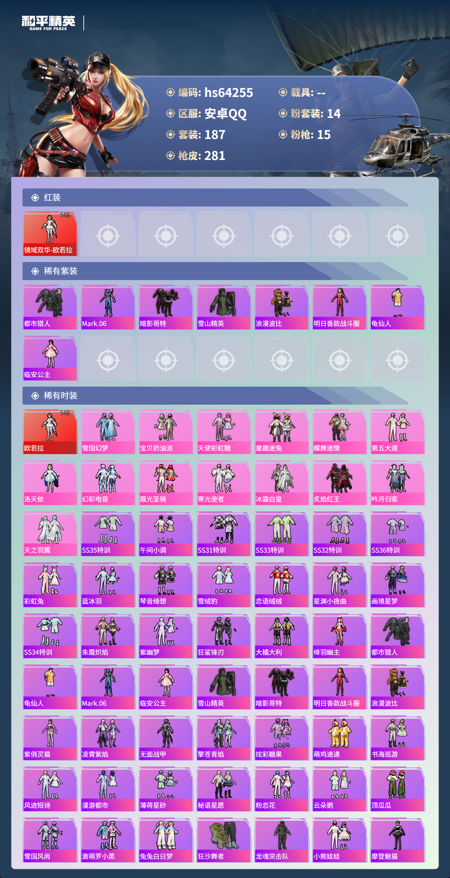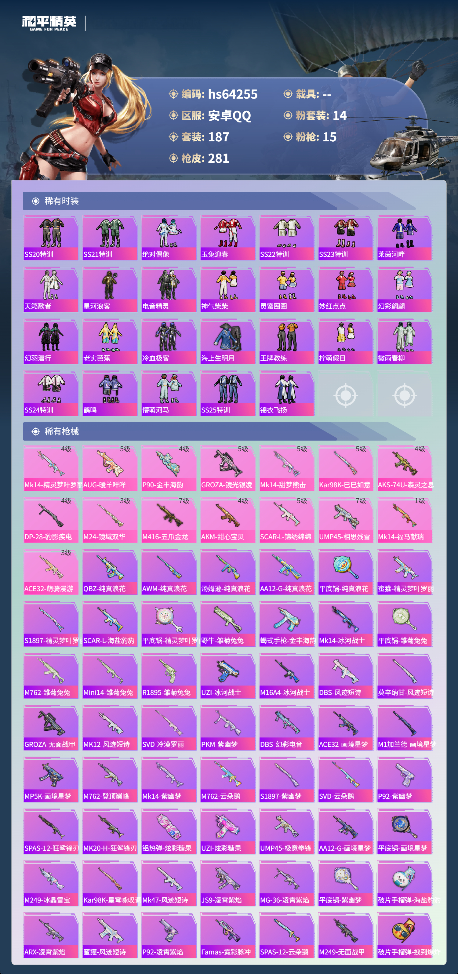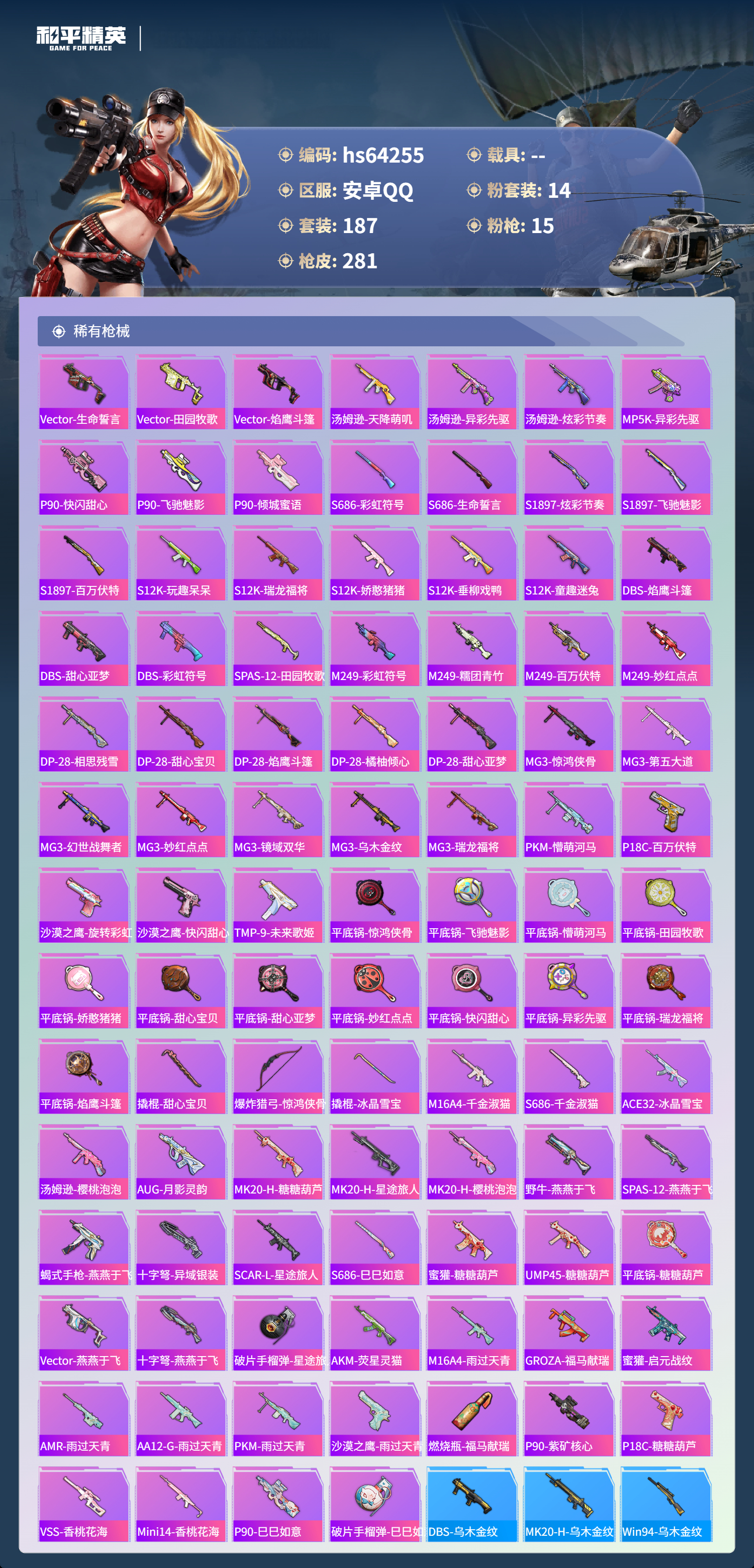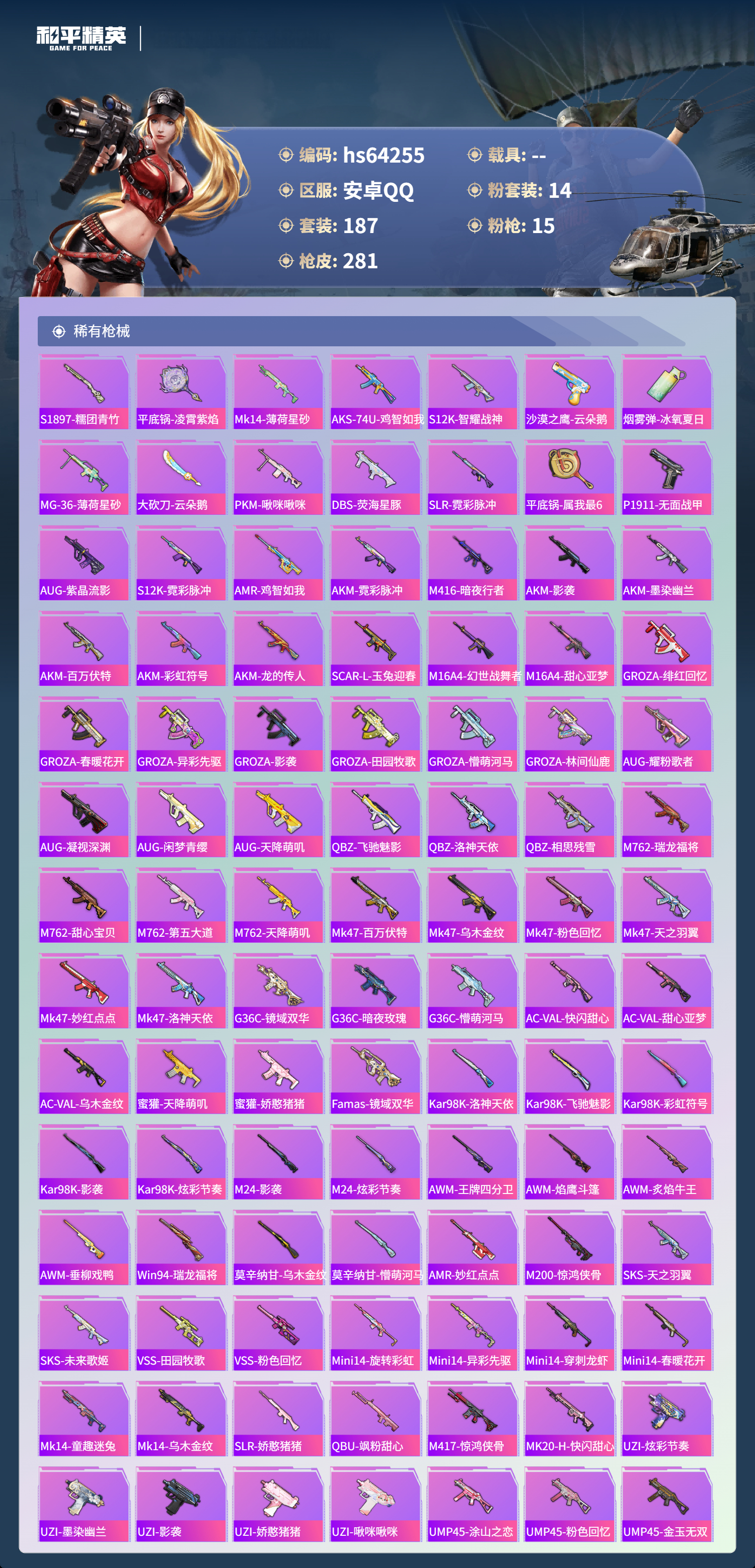 hs64255 安卓手Q-20王牌印记-有战神框-1红装-14粉装-15特效枪-98648热力值-187套装-281枪皮-4卓越印记-4传奇印记