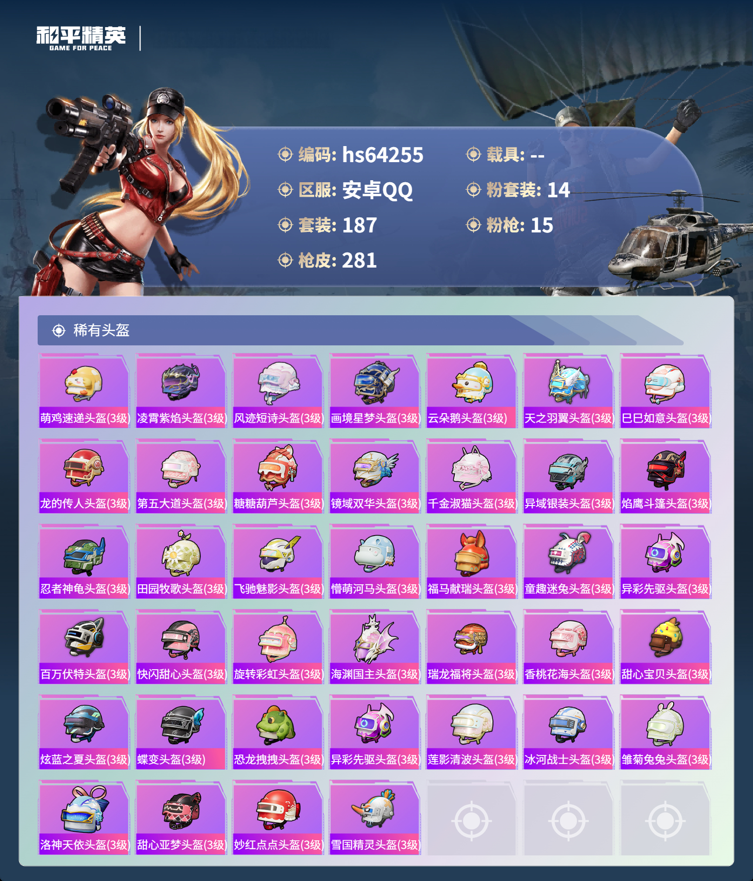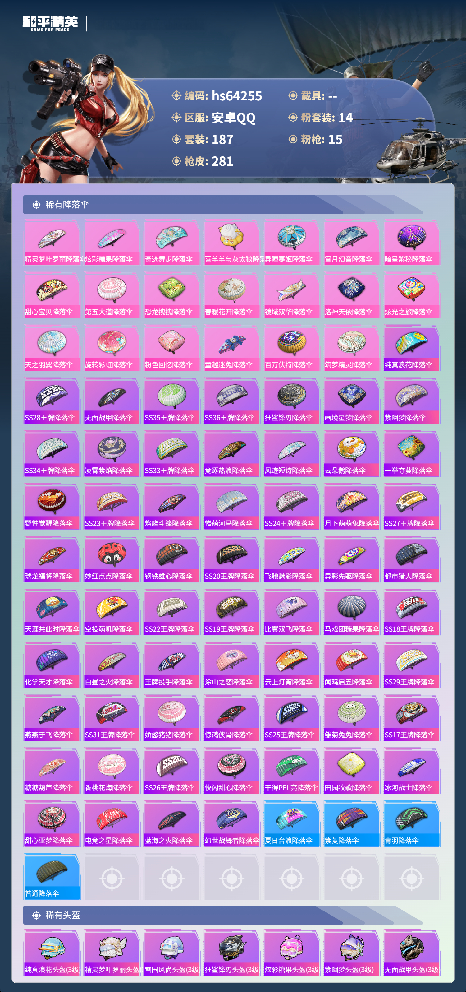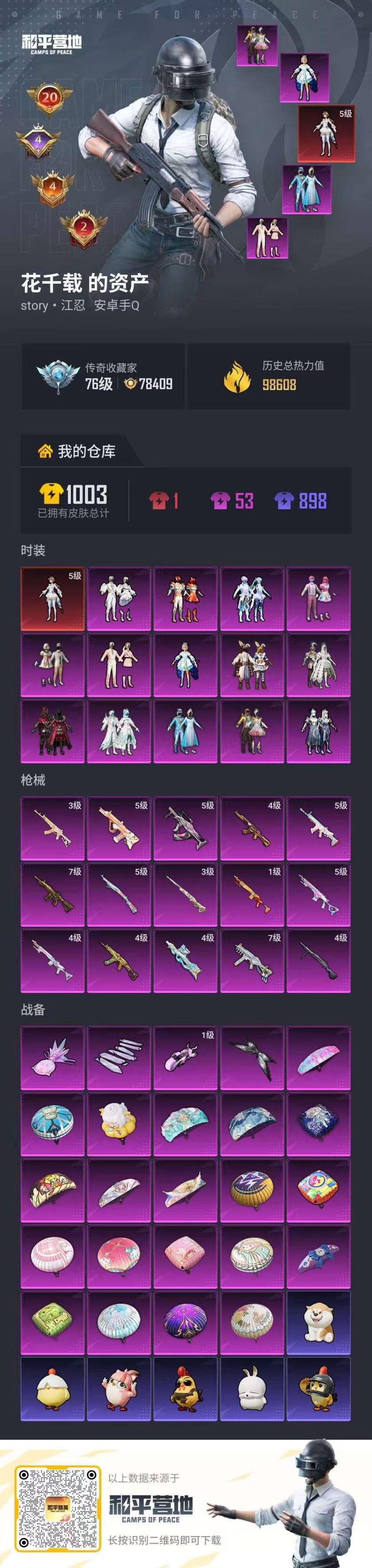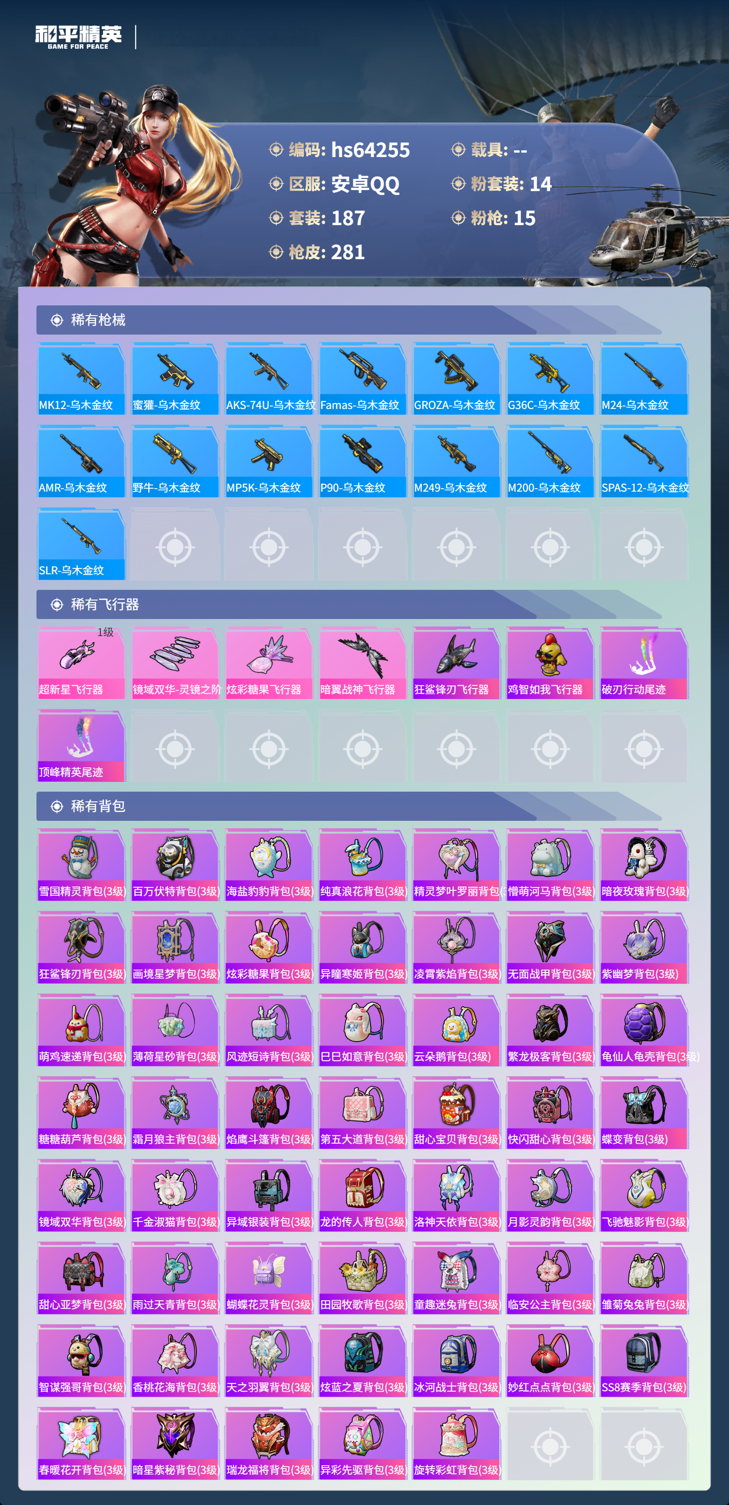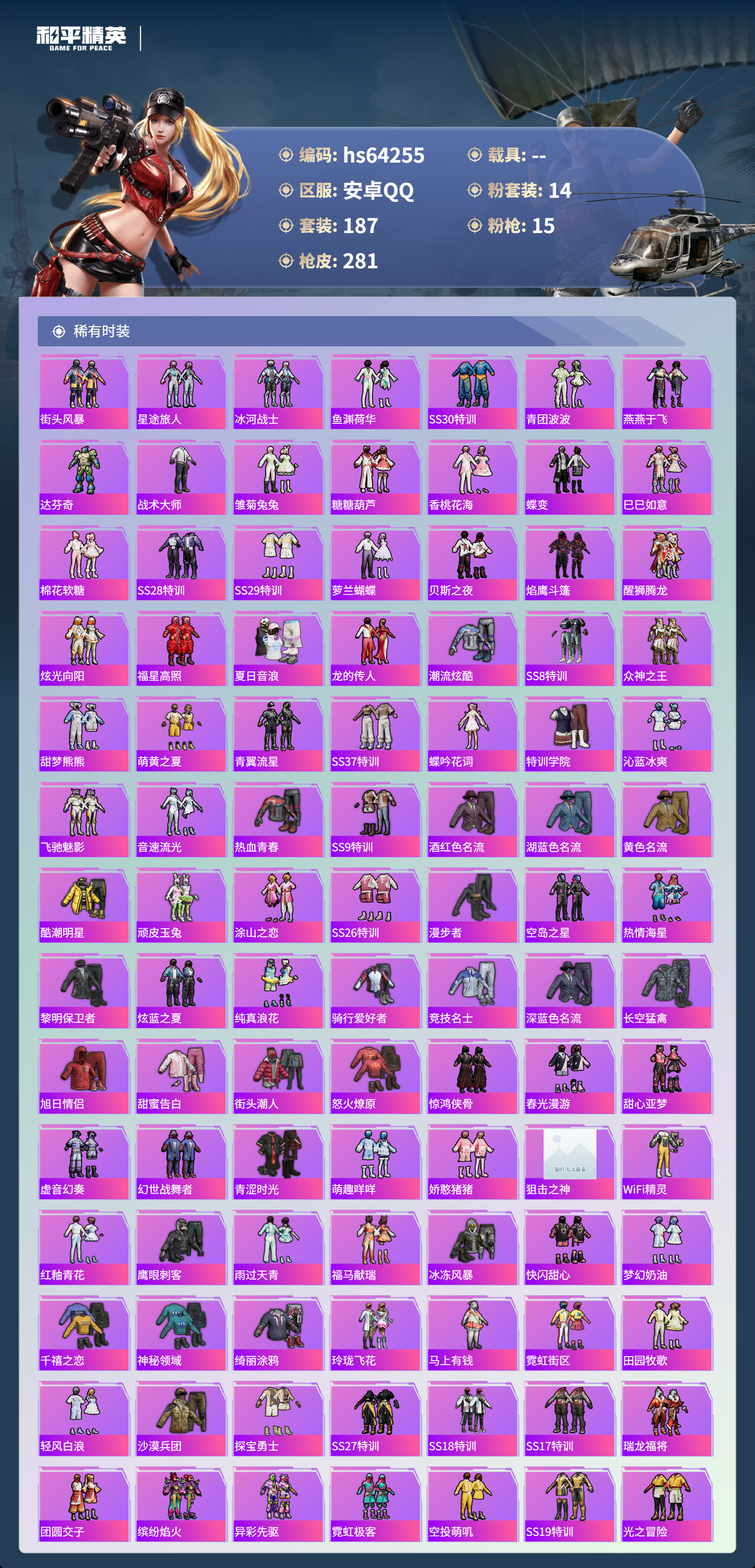 hs64255 安卓手Q-20王牌印记-有战神框-1红装-14粉装-15特效枪-98648热力值-187套装-281枪皮-4卓越印记-4传奇印记