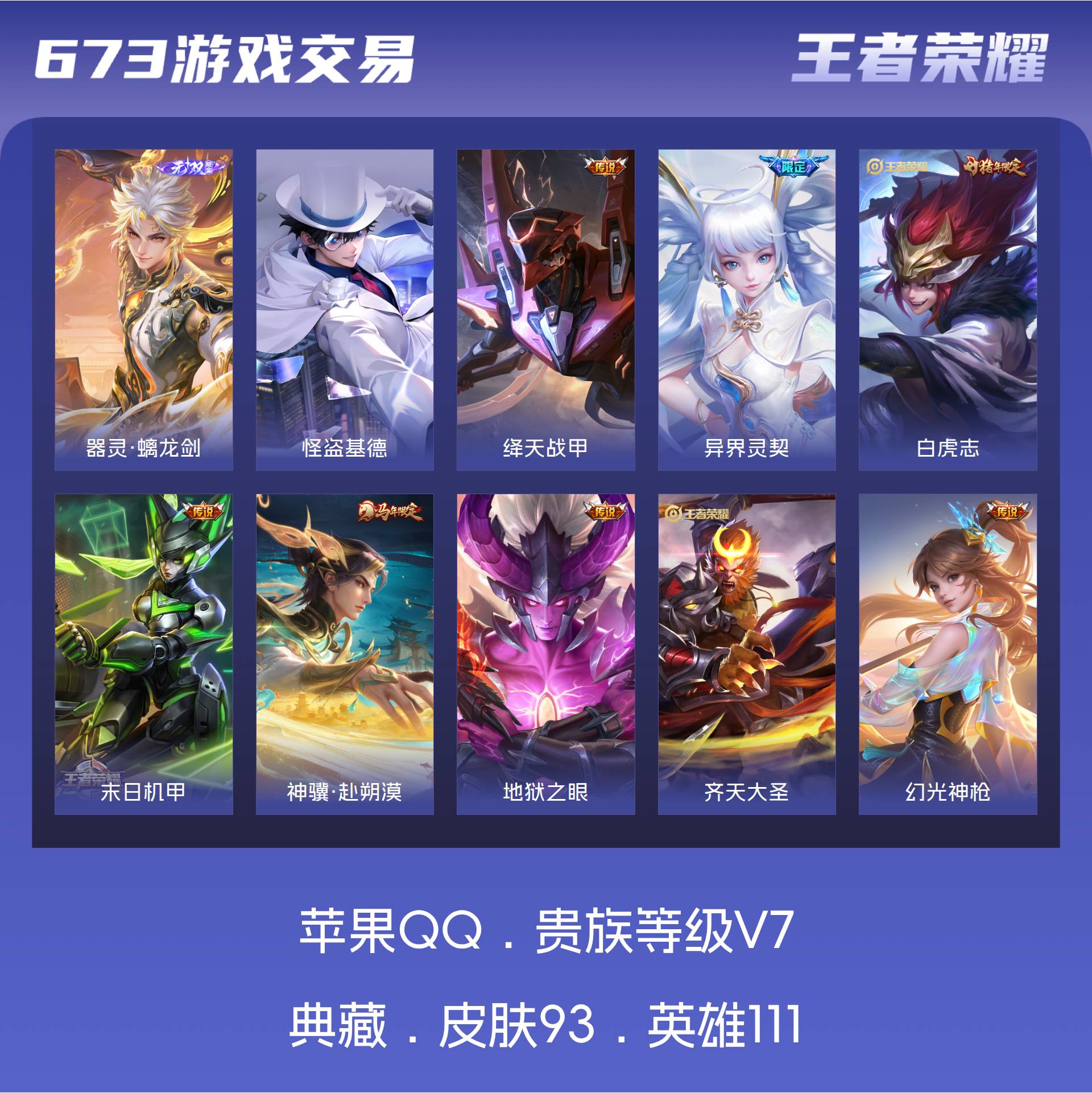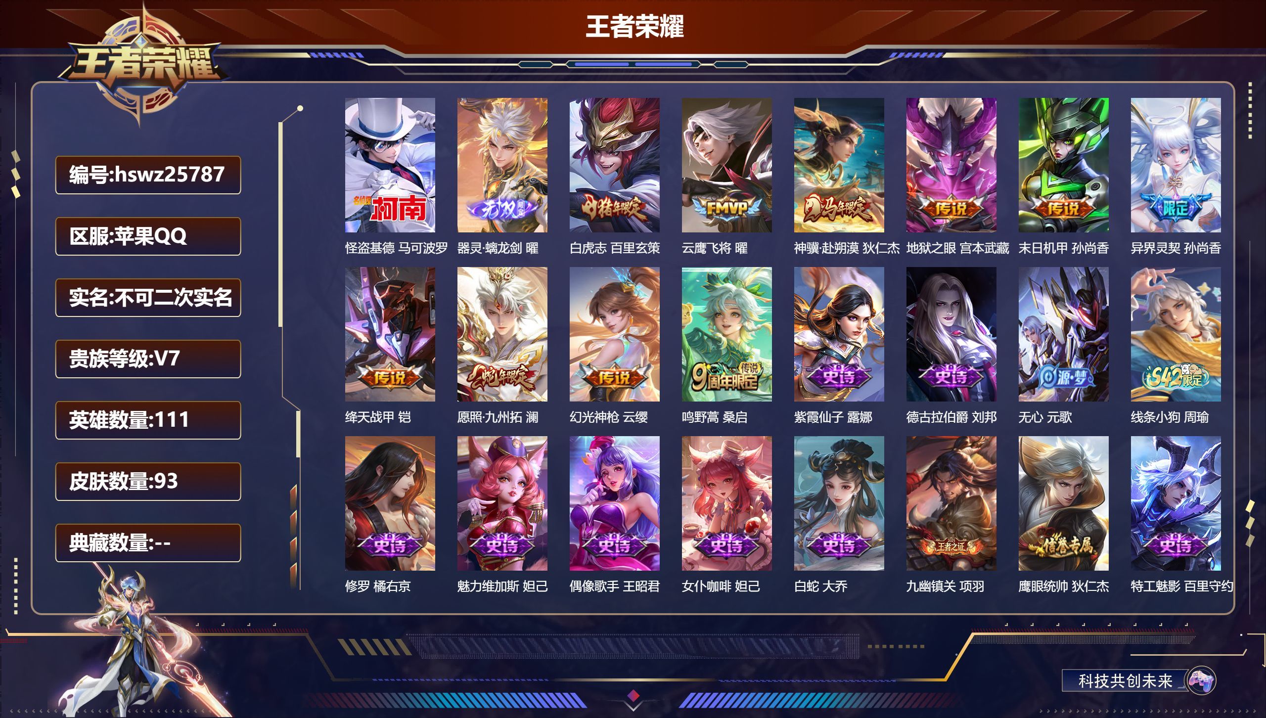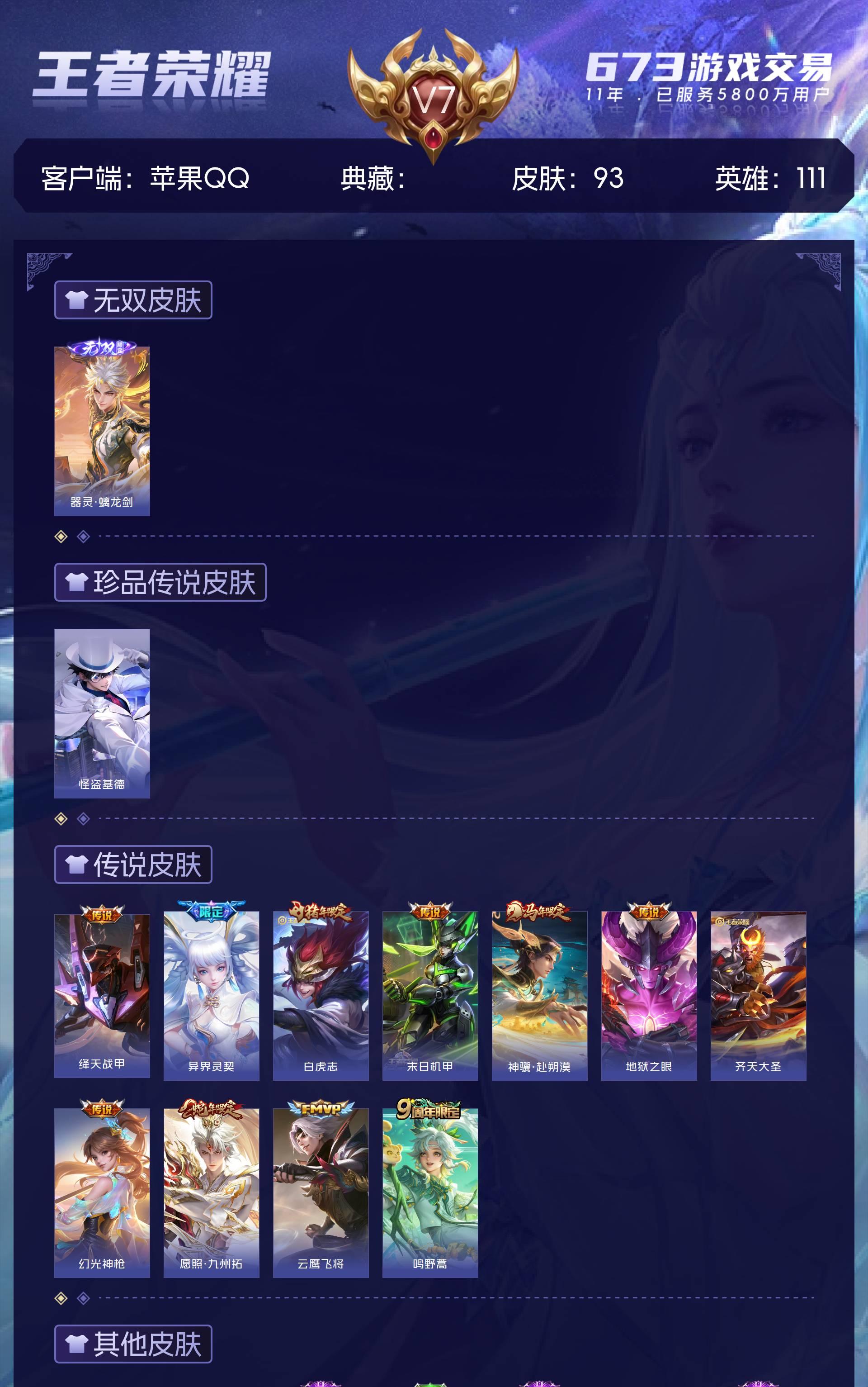 苹果QQ/荣耀王者/93皮肤/111英雄/0典藏/0珍品无双/1无双/1珍品传说/10传说/26史诗