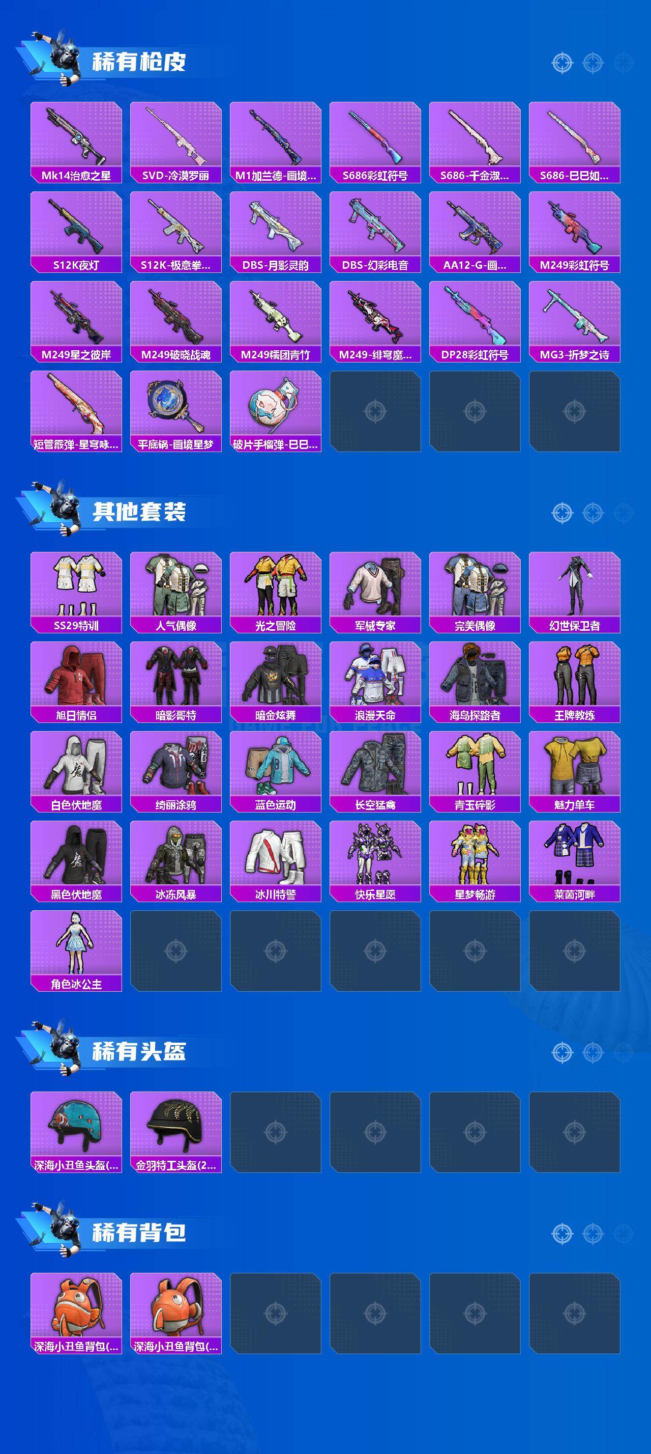 【粉色枪皮等级】:GROZA-镜光银凌(五级),AUG-星之彼岸(四级),AUG-暖羊咩咩(四级),M762-青锋波束(五级),ACE32-萌骑漫游(四级),AKS-74U-森灵之息(五级),Kar98K-巳巳如意(五级),Mk14-甜梦熊击(五级),Mk14-福马献瑞(