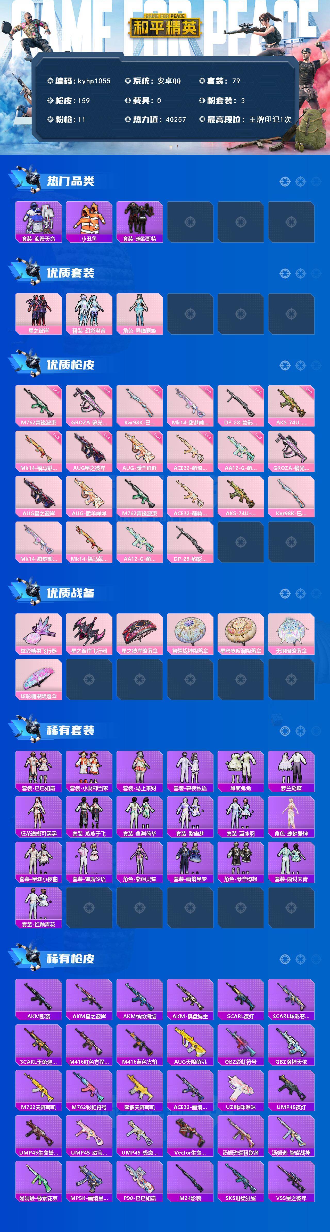 安卓 手Q-3粉装-11特效枪-0载具-2粉色飞行器-40257热力值-1王牌印记-79套装-159枪皮