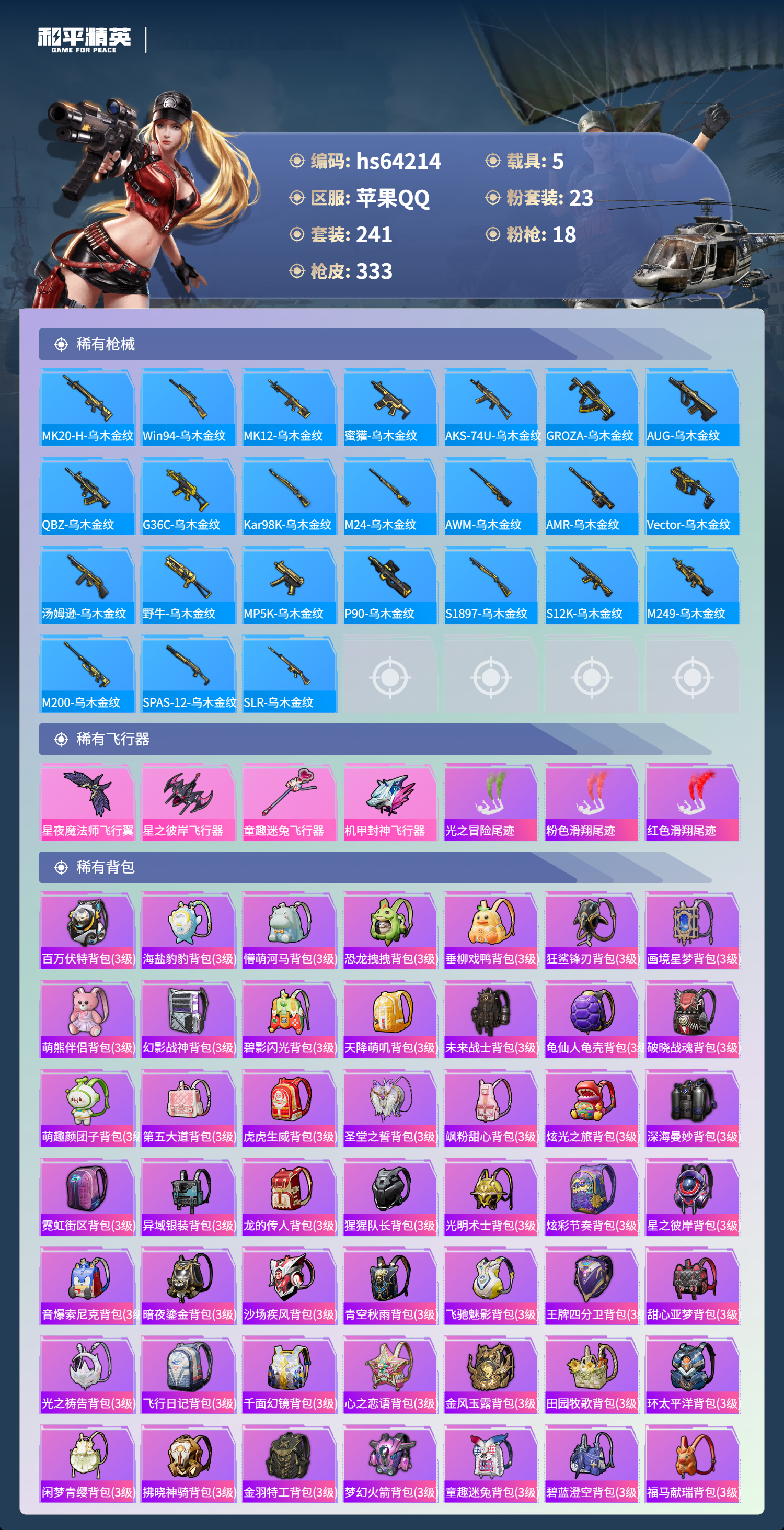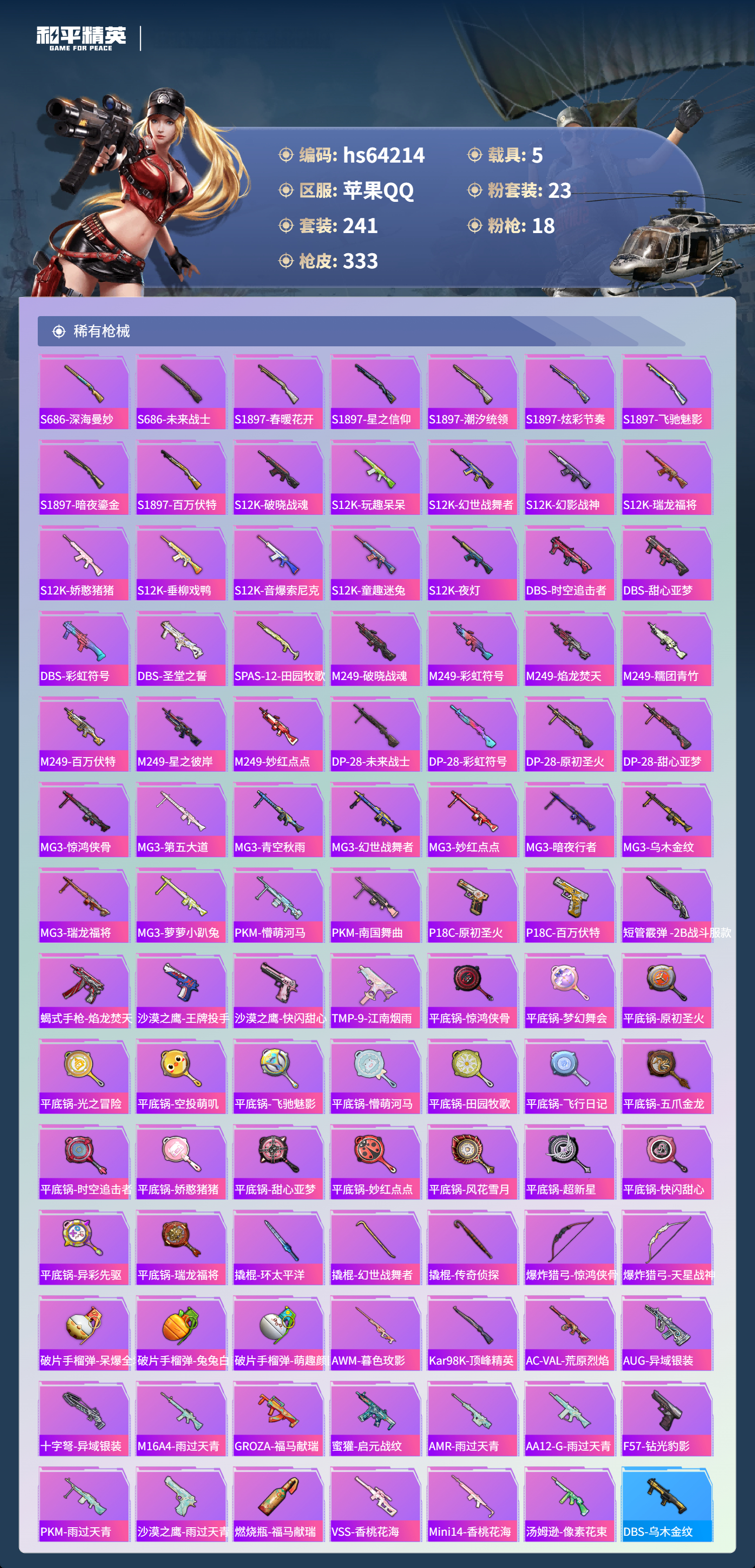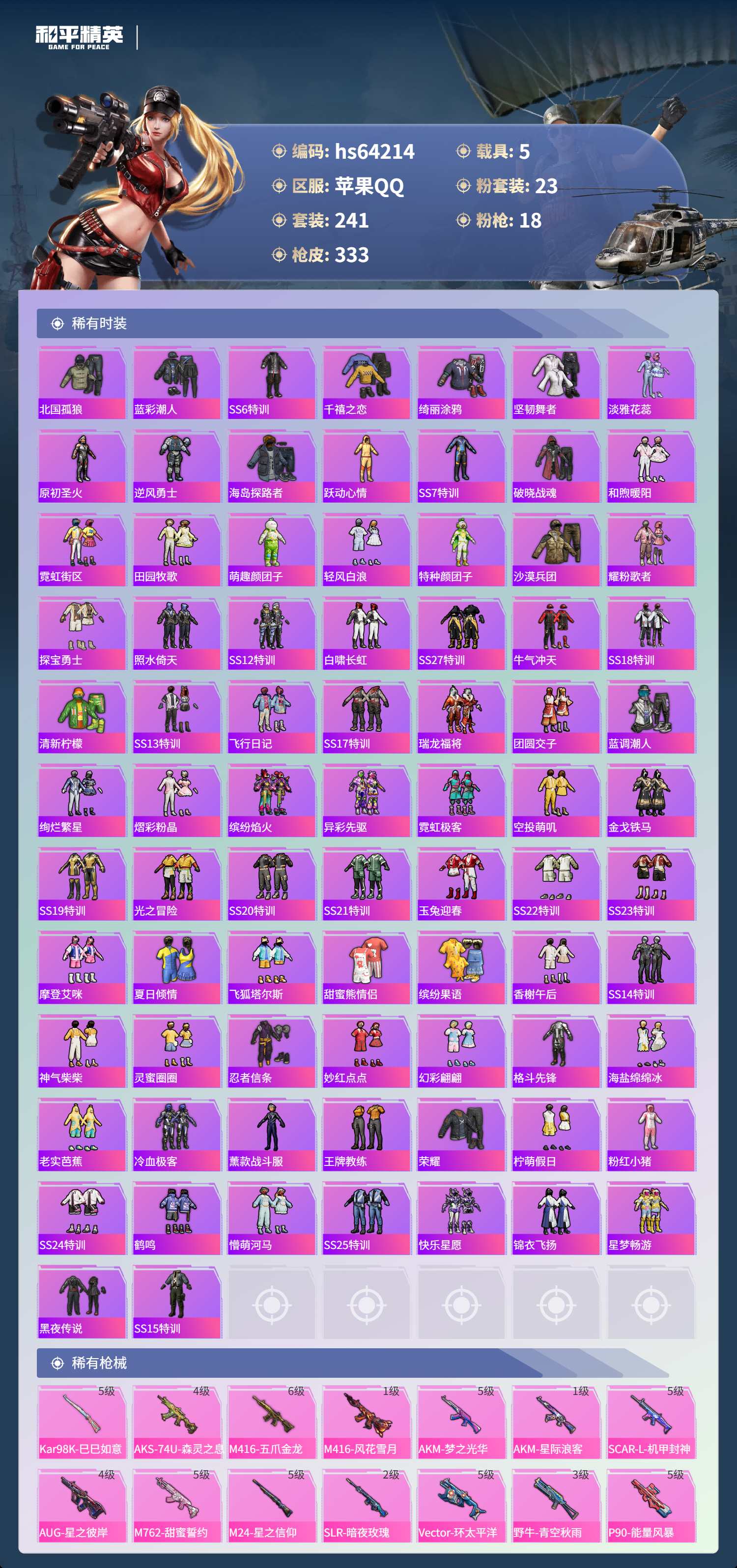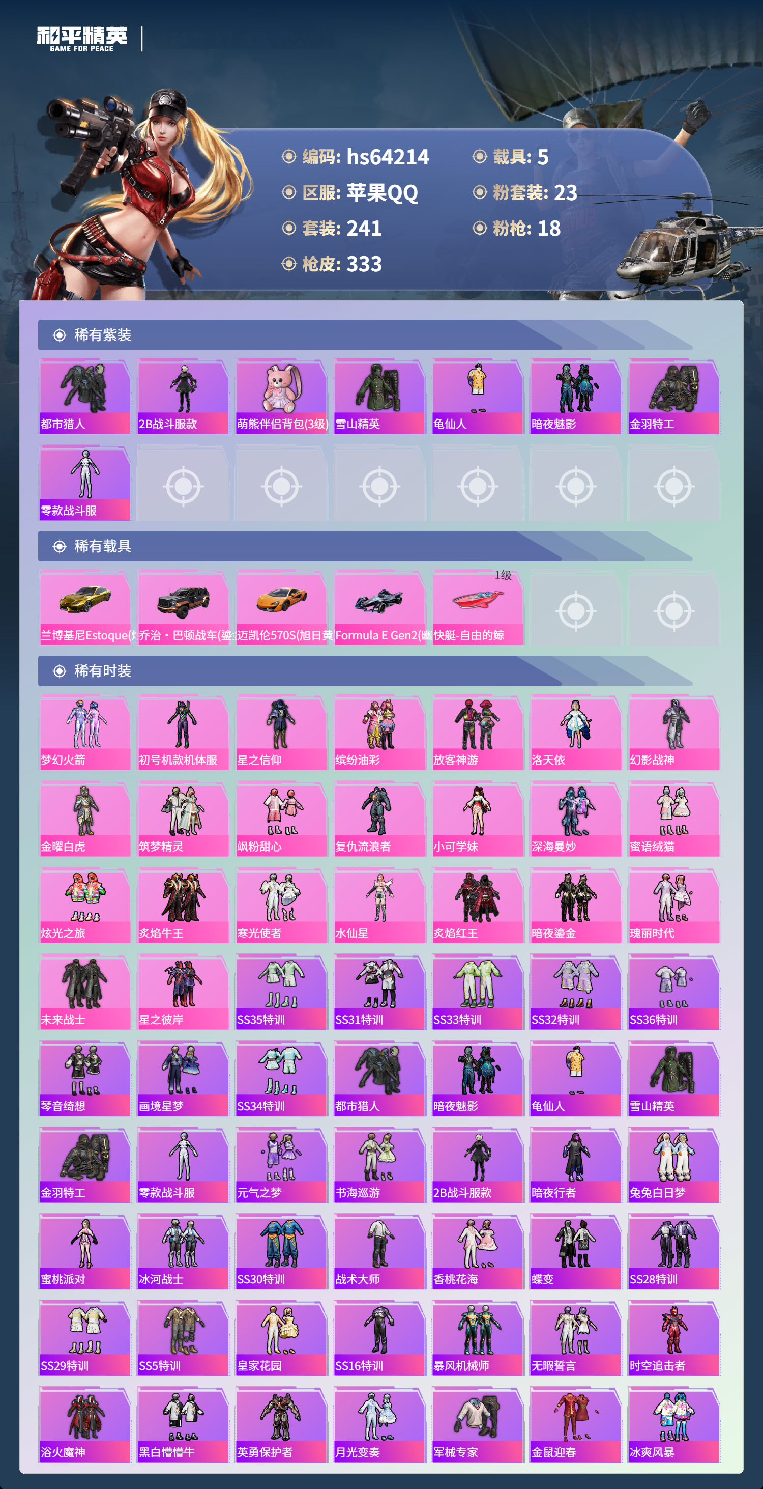 hs64214 苹果手Q-25王牌印记-23粉装-18特效枪-5载具-热力值-241套装-333枪皮-1卓越印记