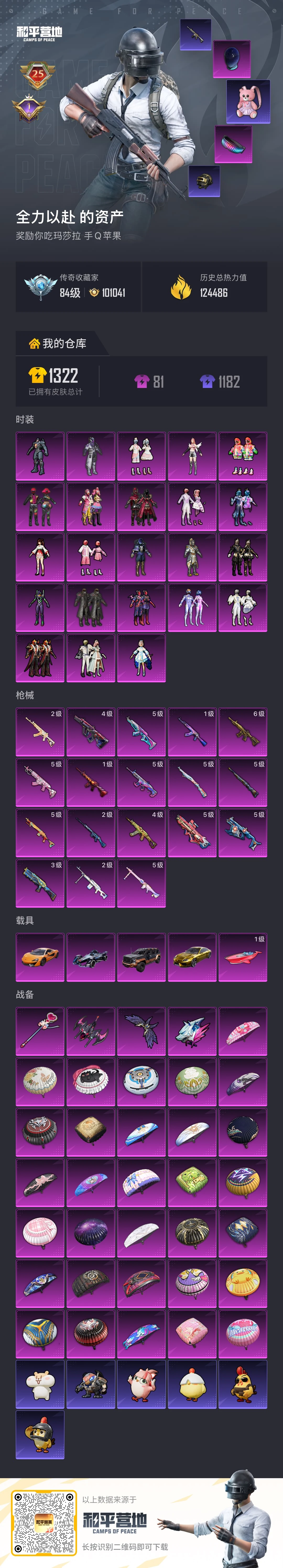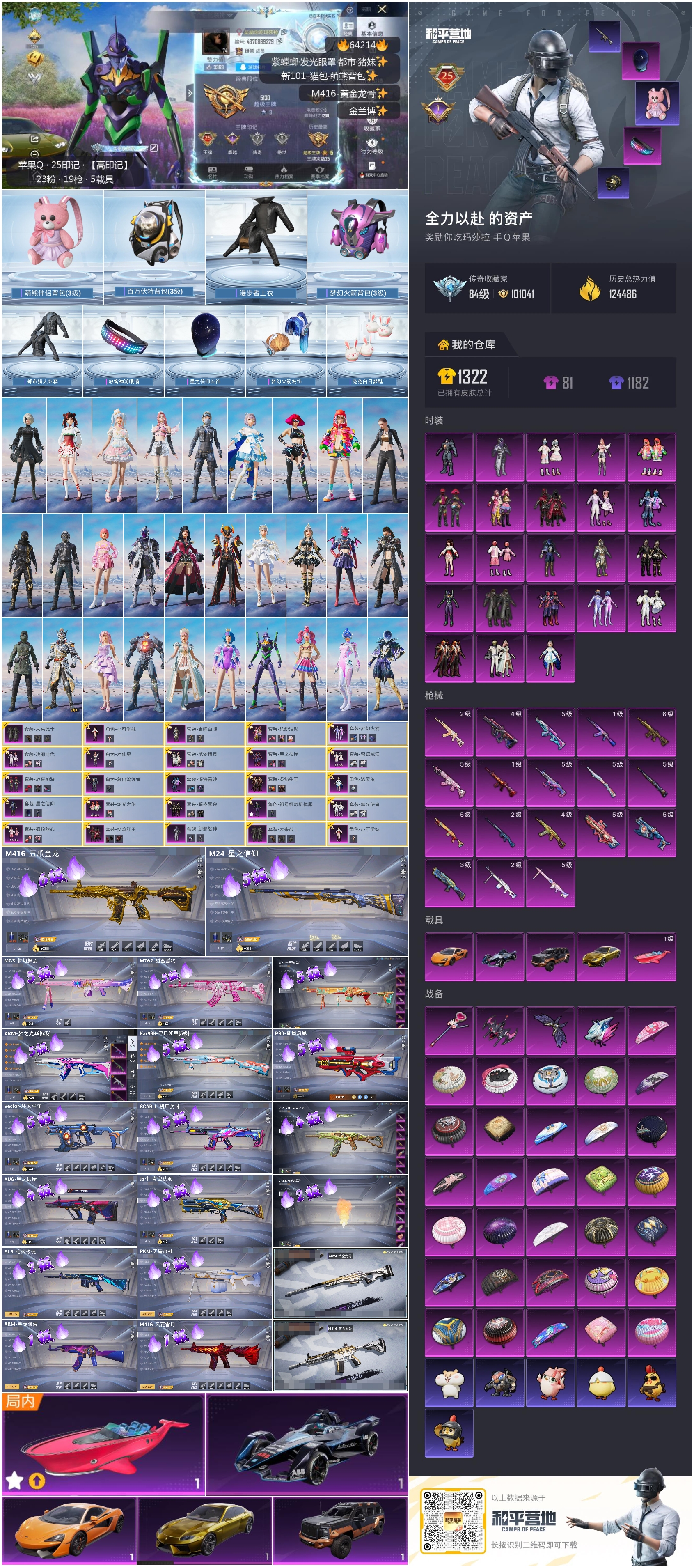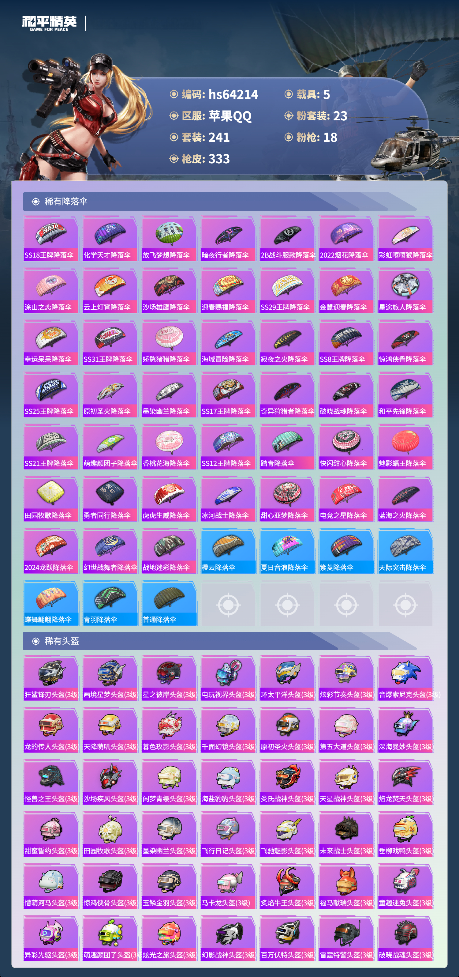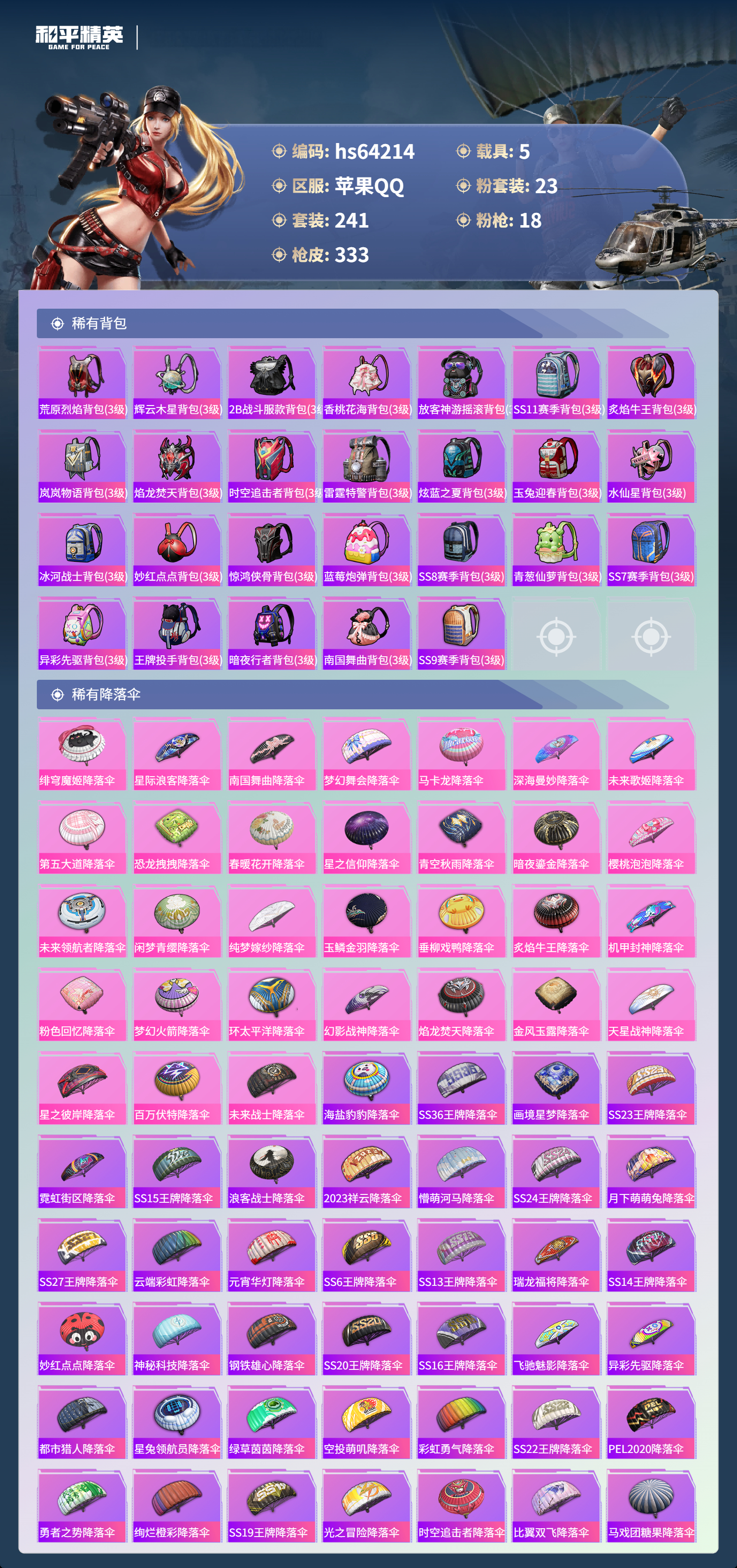 hs64214 苹果手Q-25王牌印记-23粉装-18特效枪-5载具-热力值-241套装-333枪皮-1卓越印记