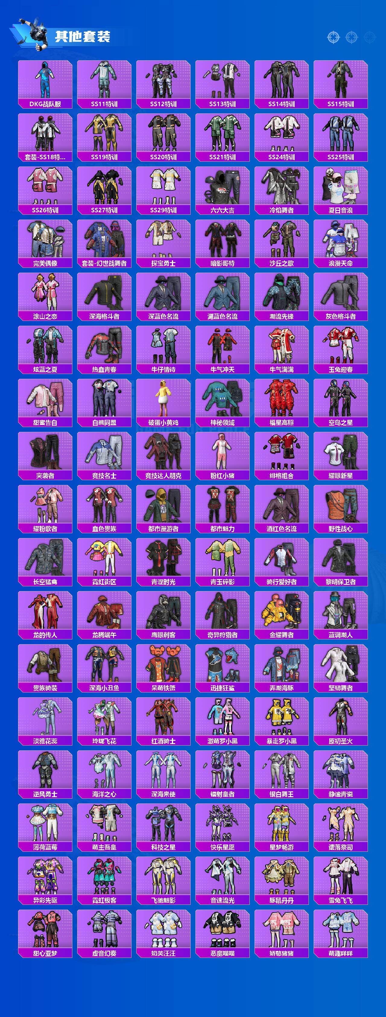 【粉色套装】:粉装-蝶舞迷情,粉装-梦幻火箭,粉装-炙焰红王,粉装-星之彼岸,粉装-碧影闪光,粉装-恐龙拽拽,粉装-傲雪凌霜,角色-白勺歌姬,角色-呆萌星弥,角色-小可学妹,粉装-未来歌姬