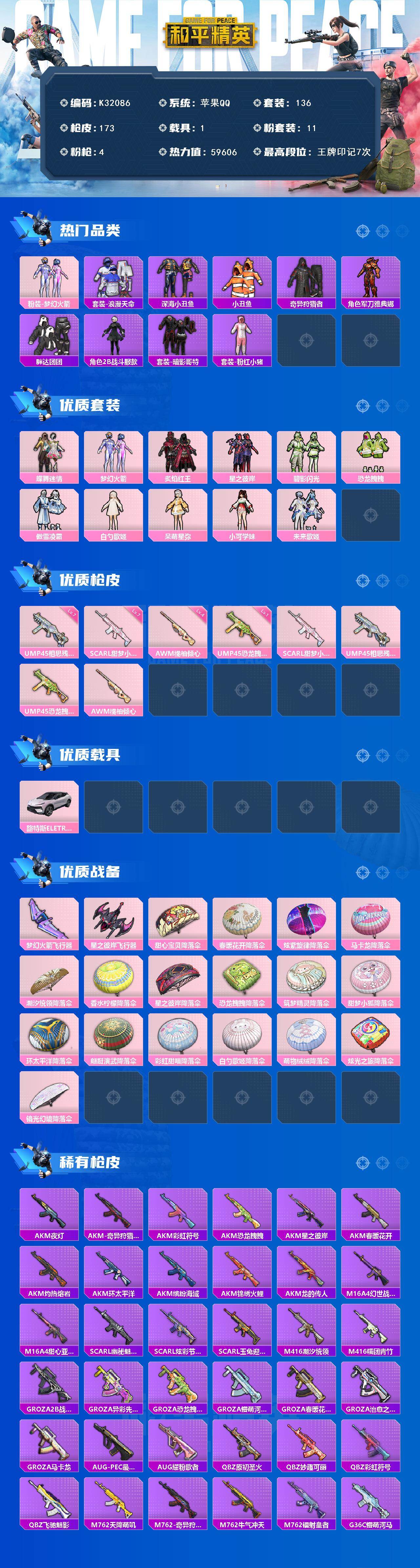 苹果 手Q-11粉装-4特效枪-1载具-2粉色飞行器-59606热力值-7王牌印记-136套装-173枪皮