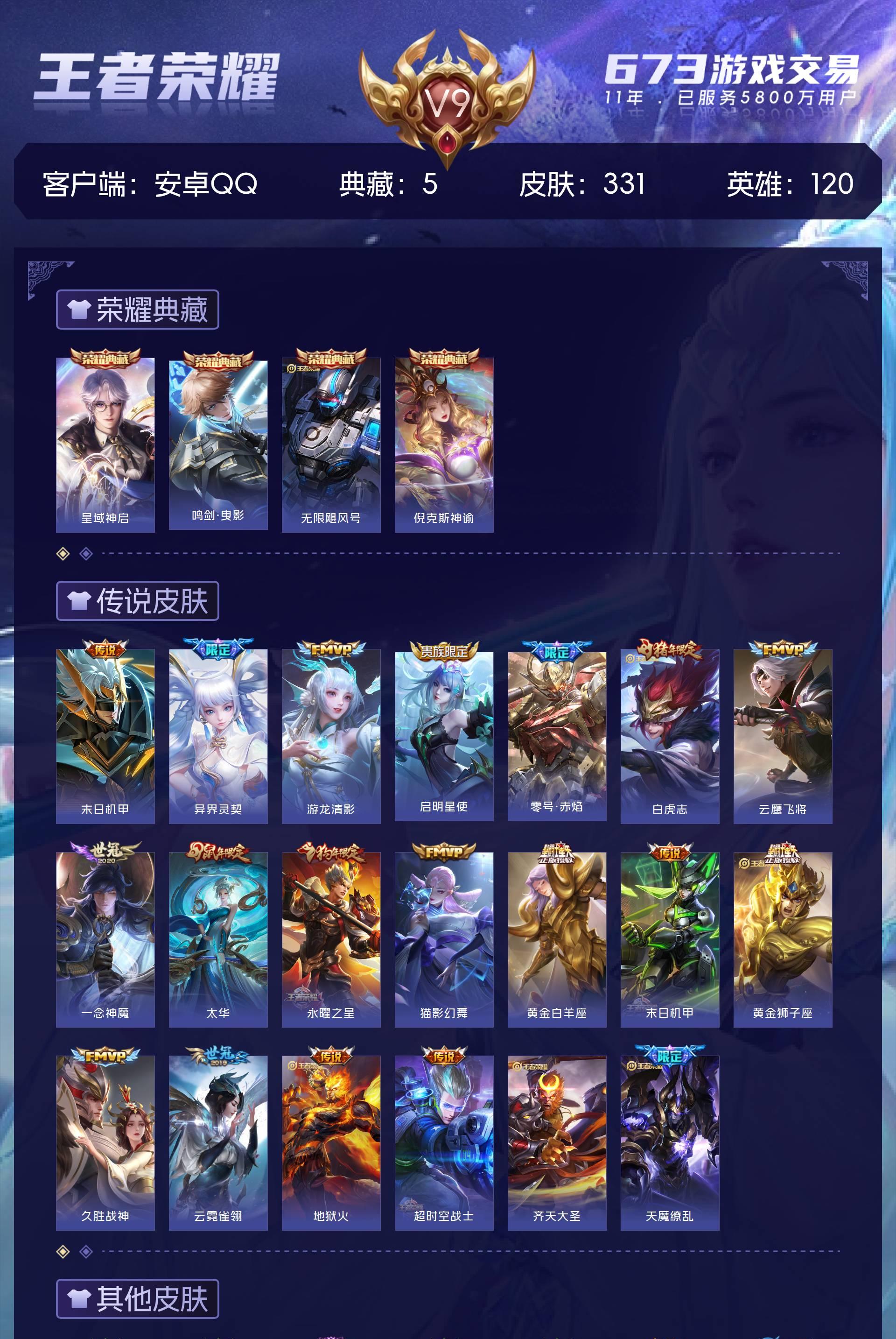 V9 皮肤331 英雄120 永恒钻石 荣耀典藏5 传说20 其他皮肤314