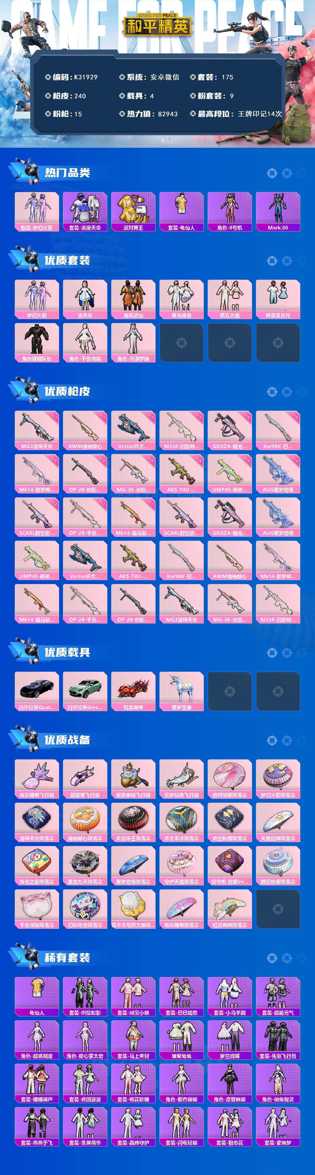 安卓 微信-9粉装-15特效枪-4载具-4粉色飞行器-82943热力值-14王牌印记-175套装-240枪皮