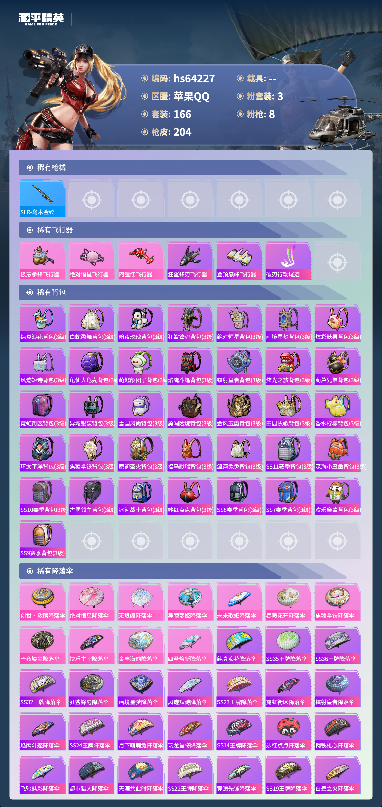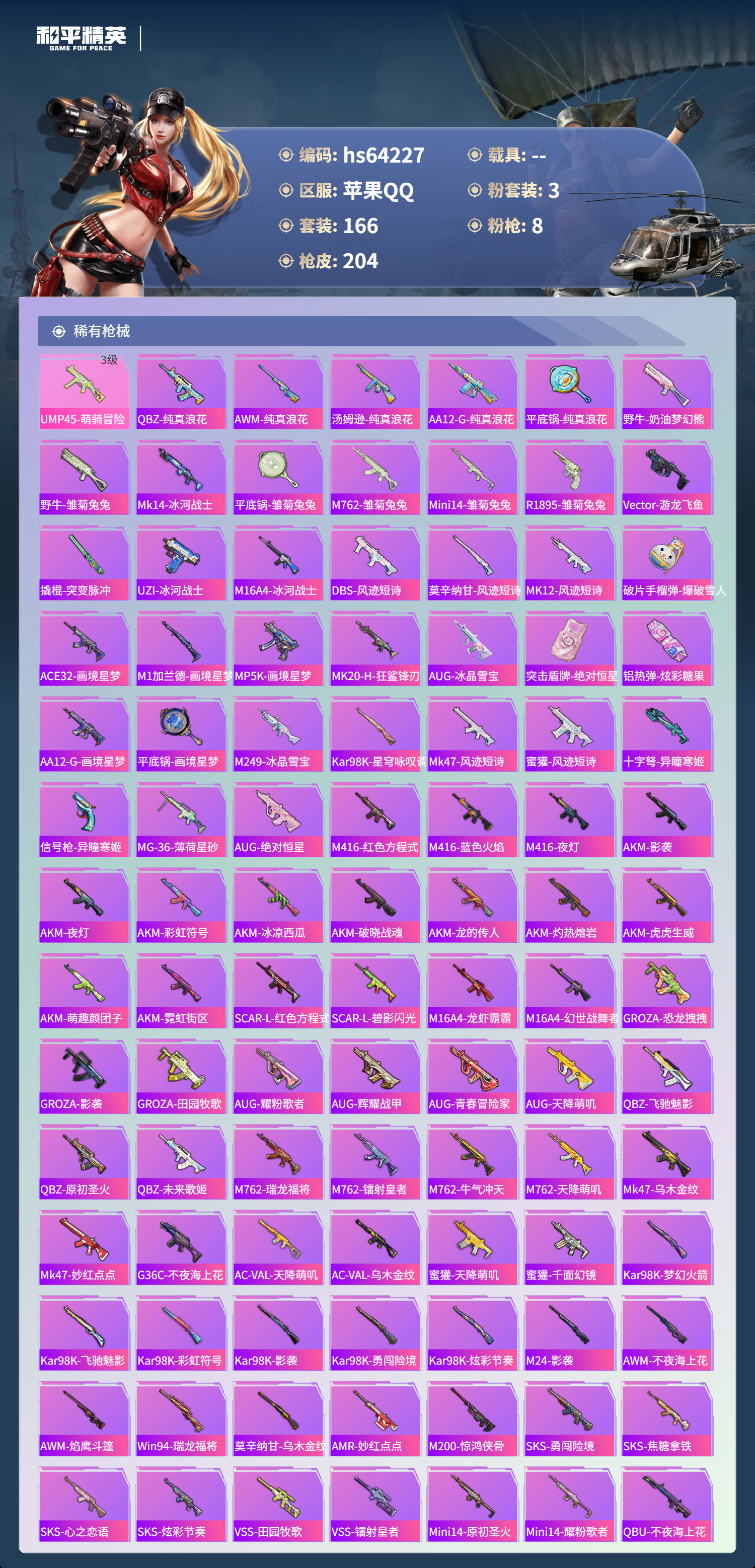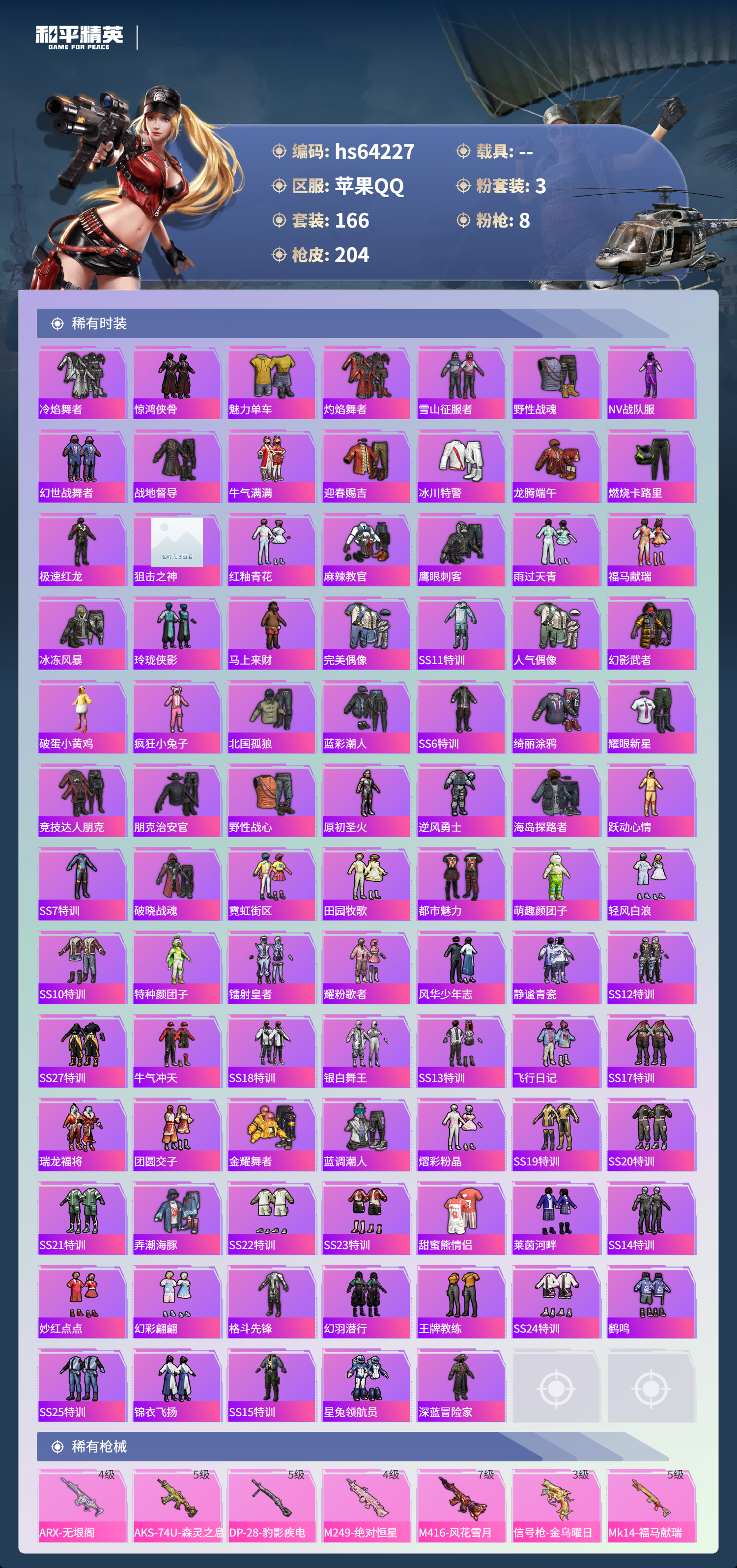 hs64227 苹果手Q-10王牌印记-3粉装-8特效枪-65048热力值-166套装-204枪皮-2卓越印记