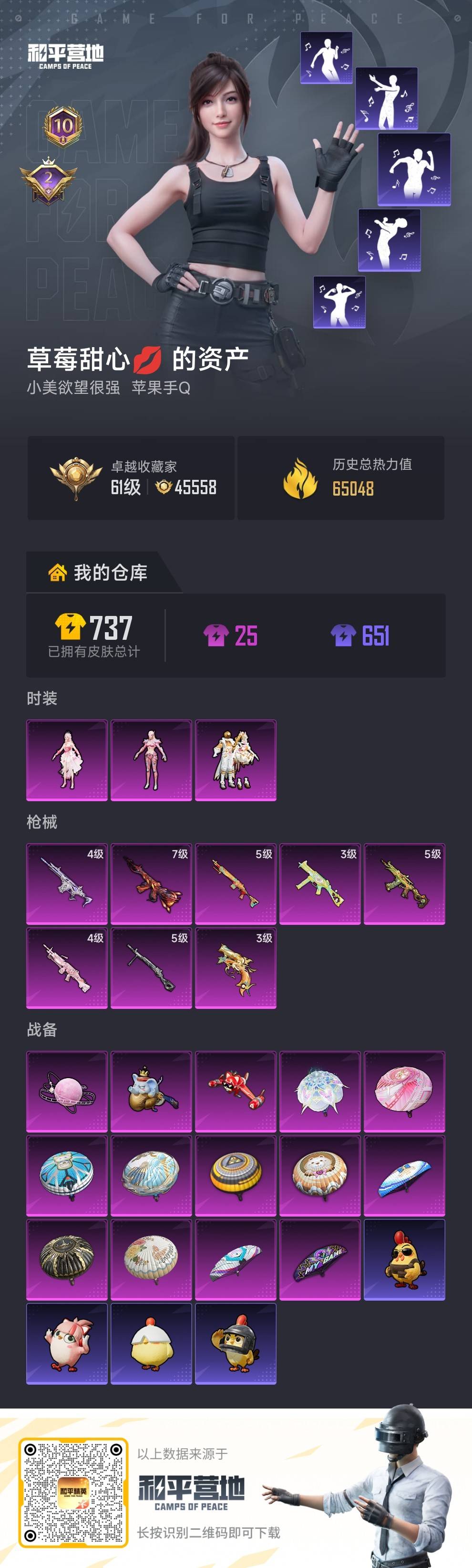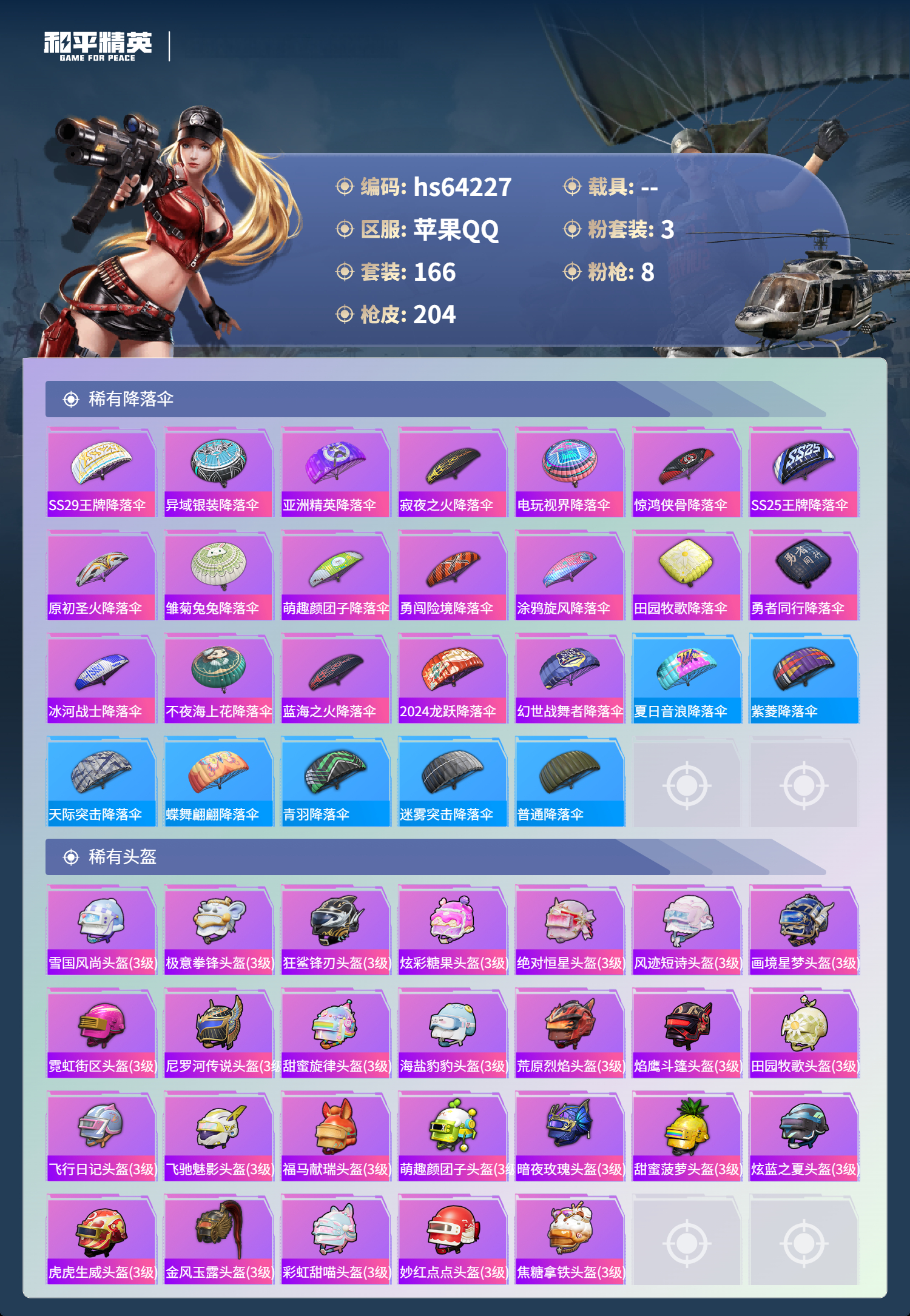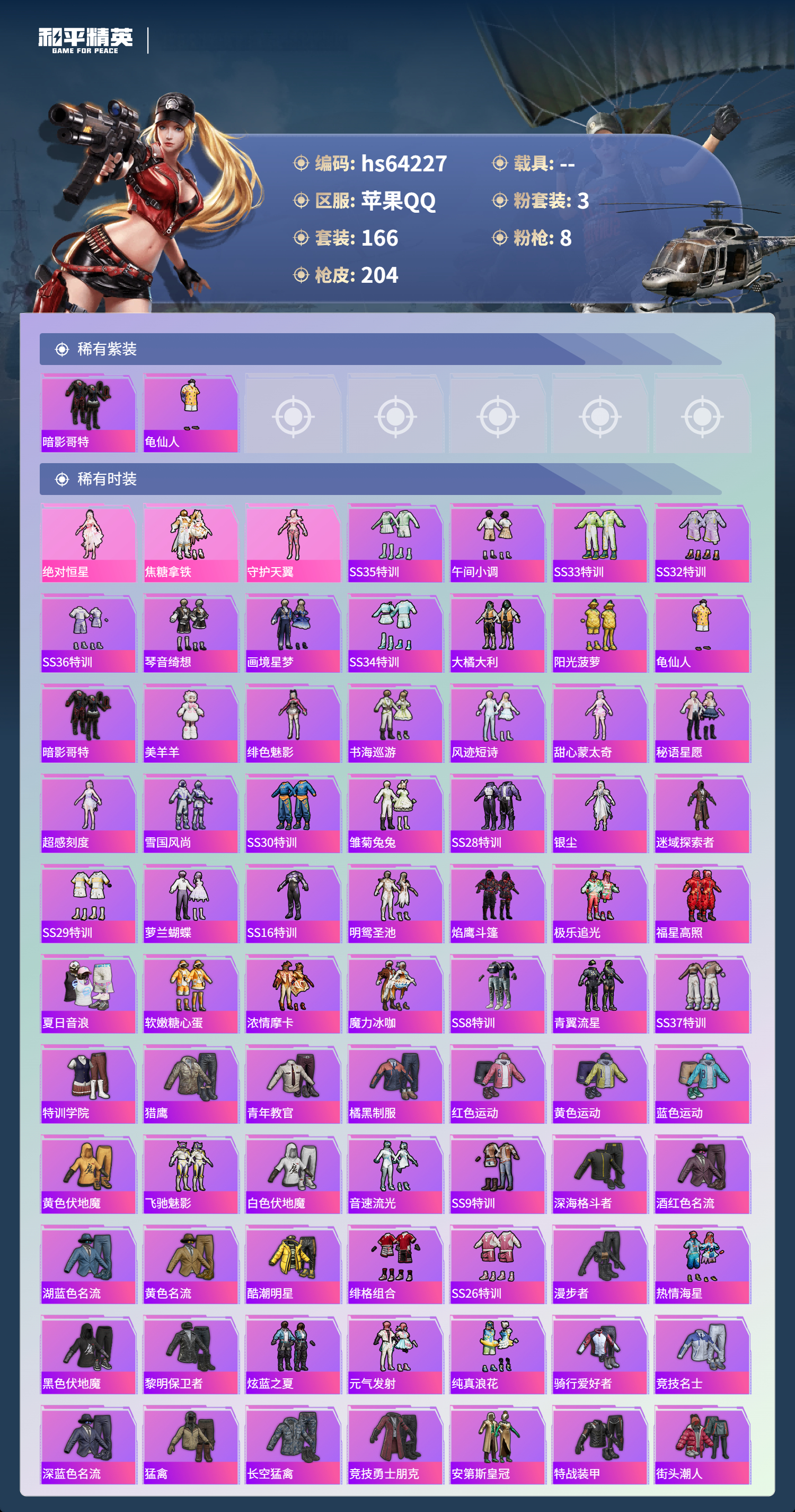 hs64227 苹果手Q-10王牌印记-3粉装-8特效枪-65048热力值-166套装-204枪皮-2卓越印记