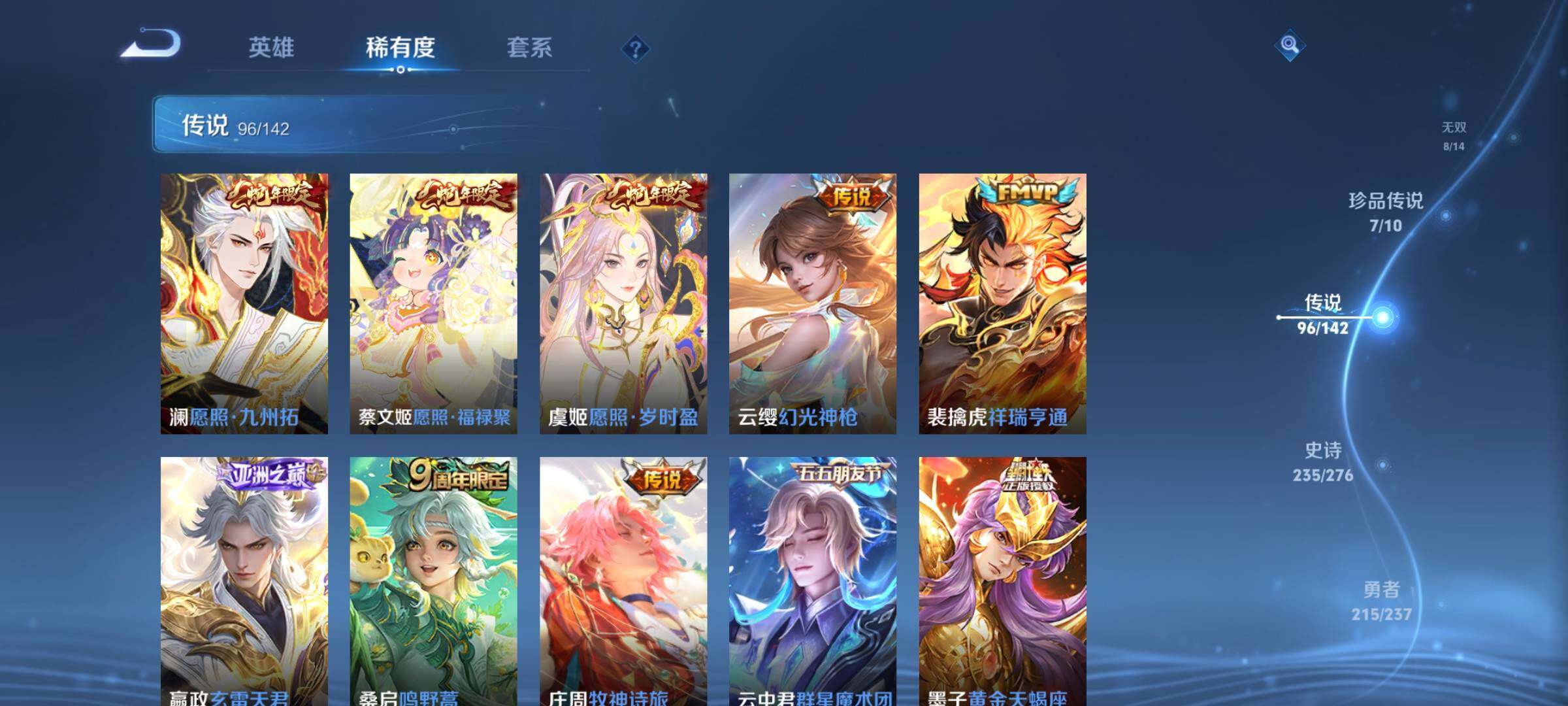 V10-646皮肤-5典藏皮肤-1典藏英雄-8无双-7珍品传说-96传说-233史诗