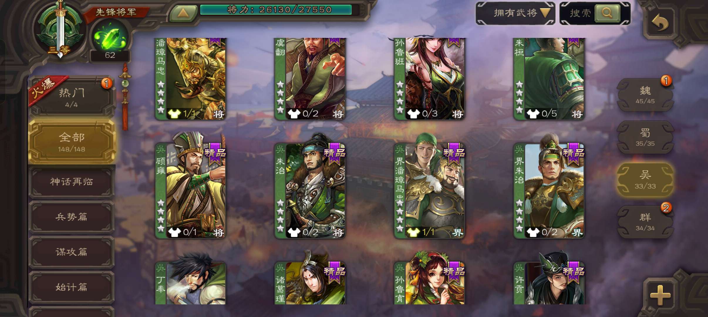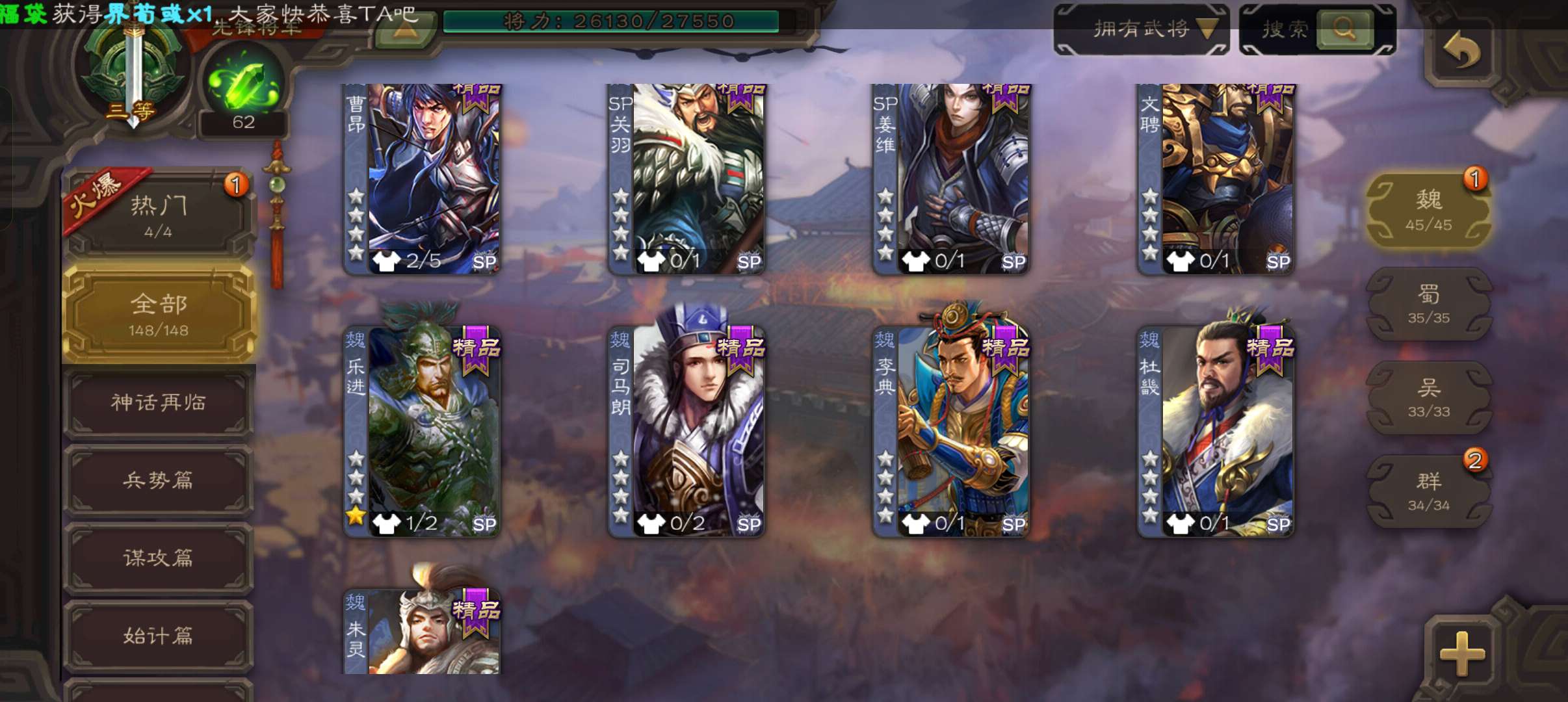先锋将军,4.5万羽毛5万豆,回廊动白马sp甄姬神吕布嵇康4史诗,甘夫人桥公崔琰界荀彧148将