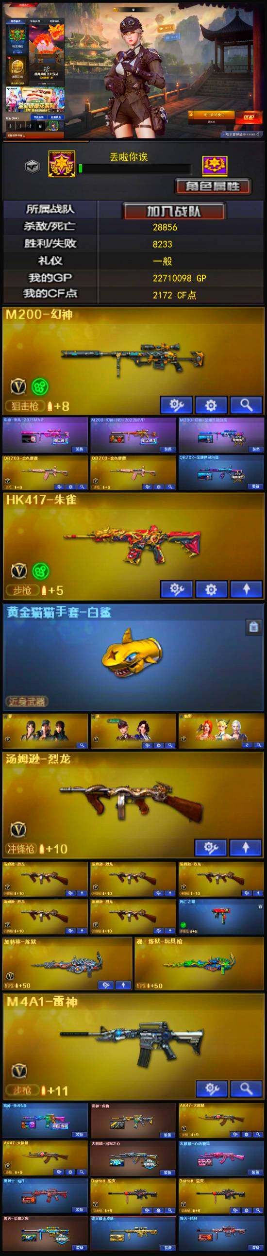 【穿越火线CF-3206】江苏一区-33V-6王者-0炫金【热门武器】:QBZ03-金色蔷薇*2,HK417-朱雀,M200-幻神,死亡之眼,Cat-刀锋,汤姆逊-烈龙*6,加特林-炼狱,火麒麟-绝迹,COP-白鲨*2,沙鹰-修罗*2,黄金猫猫手套-白鲨【王者炫金武器】:王者玉锋【音效卡】:加特林-炼狱音效卡【皮肤】:幻神-宠儿-2021MVP,M200-幻神-荣耀世冠白鲨,M200-幻神-N9-2022MVP,QBZ03-荣耀世冠白鲨,雷神-虎将,雷神-传奇N9,火麒麟-冠军之心,火麒麟-心动