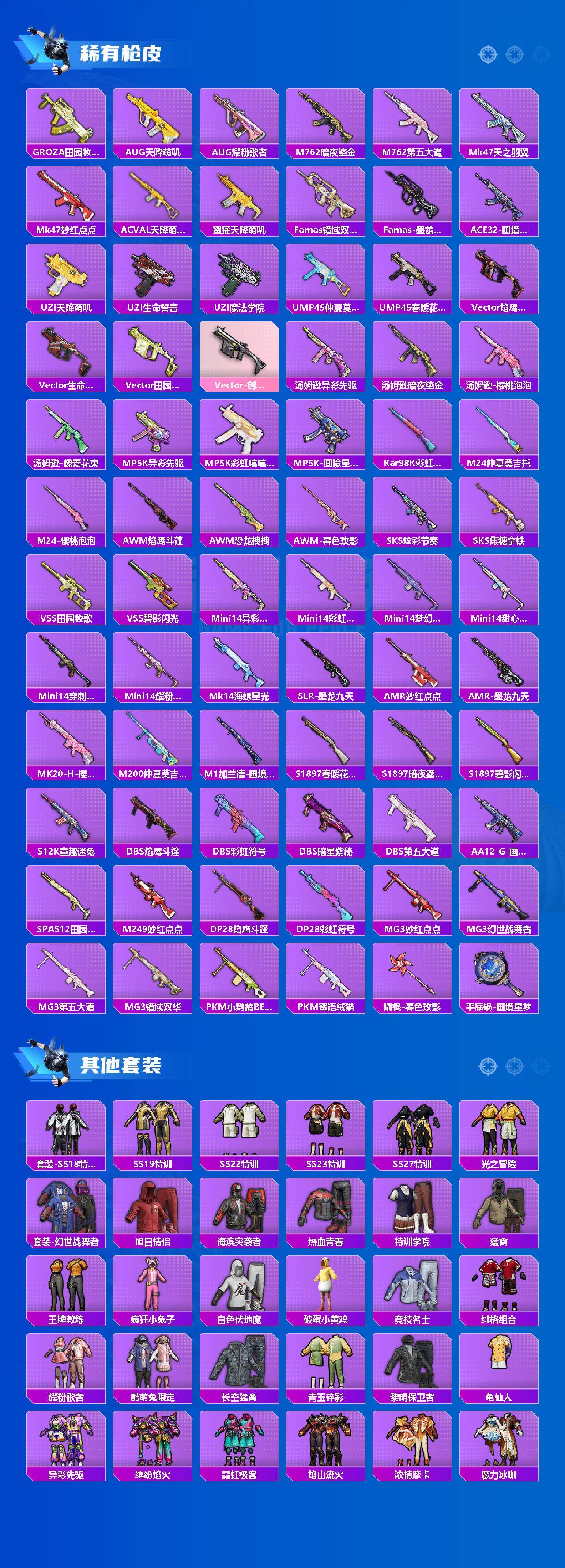 【粉色套装】:粉装-梦幻火箭,粉装-冰霜白皇,粉装-幻情紫藤,粉装-酣梦娃娃,粉装-天之羽翼,粉装-霞光圣骑,粉装-寒光使者,粉装-第五大道,粉装-心之回忆,角色-烟云彩露,角色-小蓝,角色-电磁星,套装-创世
