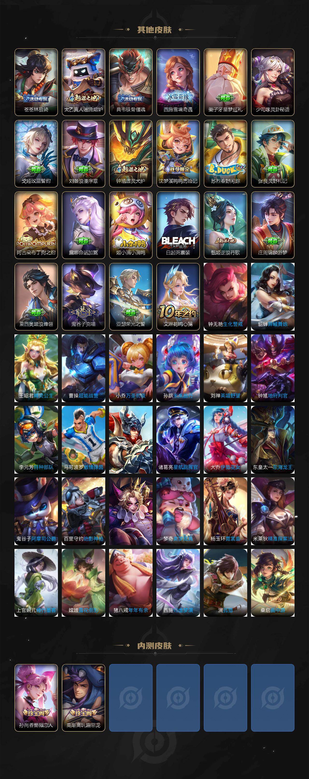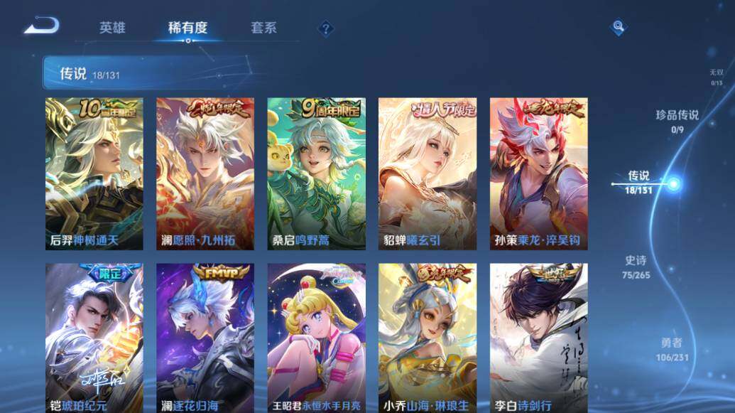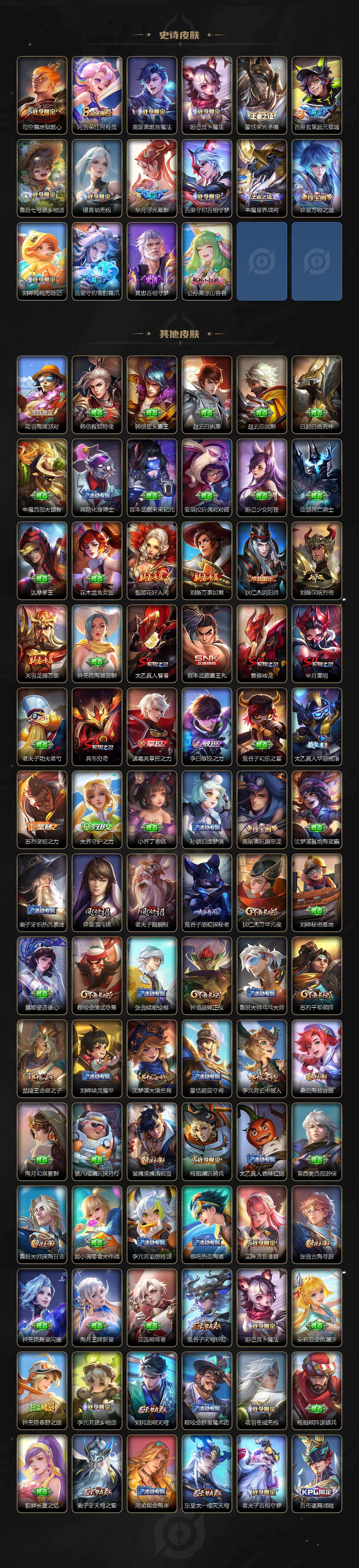【传说皮肤】:后羿神树通天,澜愿照九州拓,桑启鸣野蒿,貂蝉曦玄引,孙策乘龙淬吴钩,铠琥珀纪元,澜逐花归海,王昭君永恒水手月亮,小乔山海琳琅生,李白诗剑行,王昭君乞巧织情,李元芳飞鸢探春,兰陵王默契交锋,铠绛天战甲,曜云鹰飞将,貂蝉猫影幻舞,达摩黄金狮子座,貂蝉仲夏夜之梦