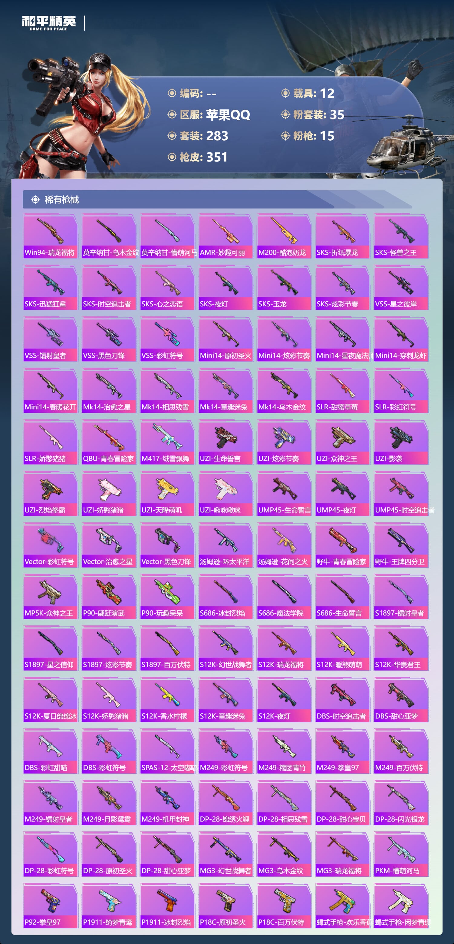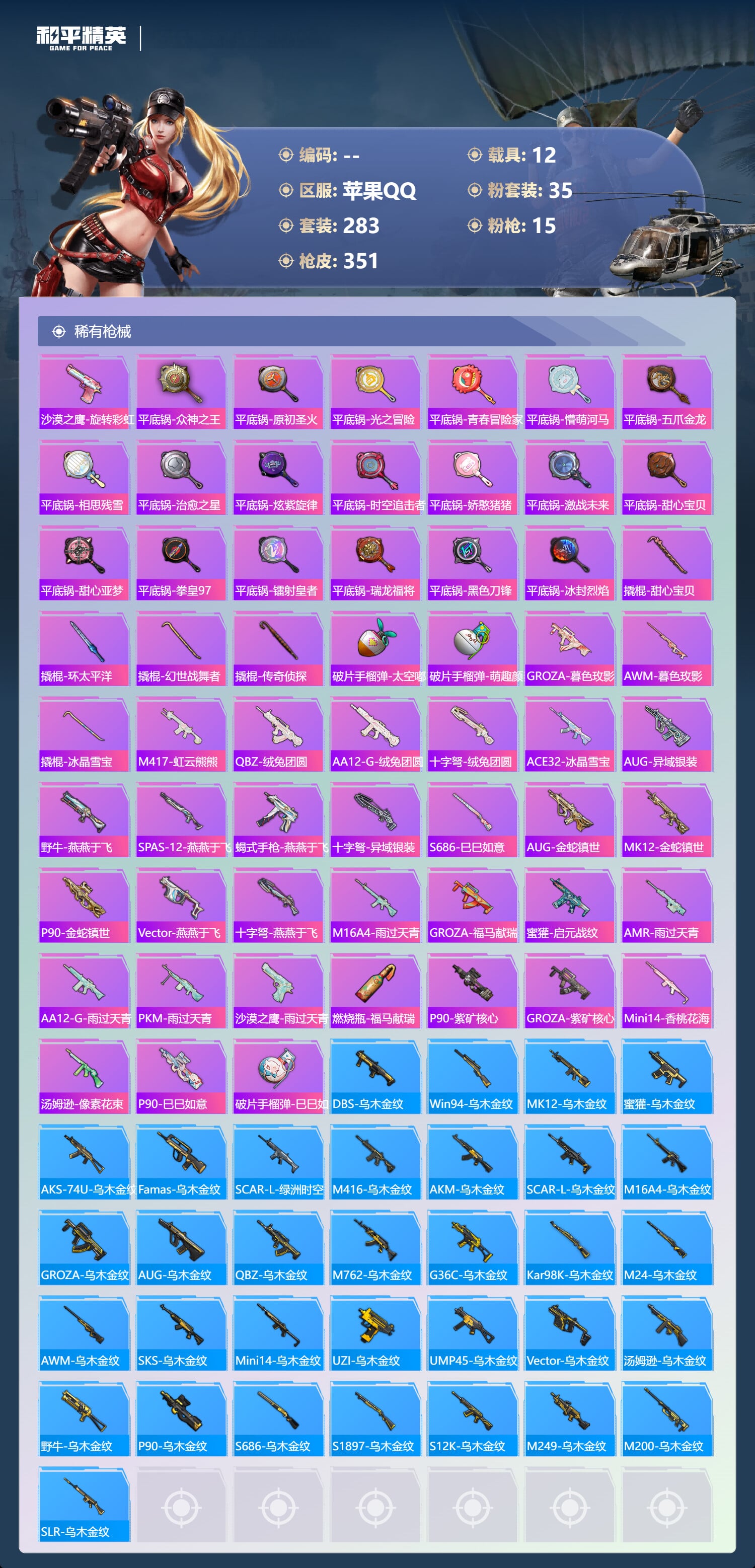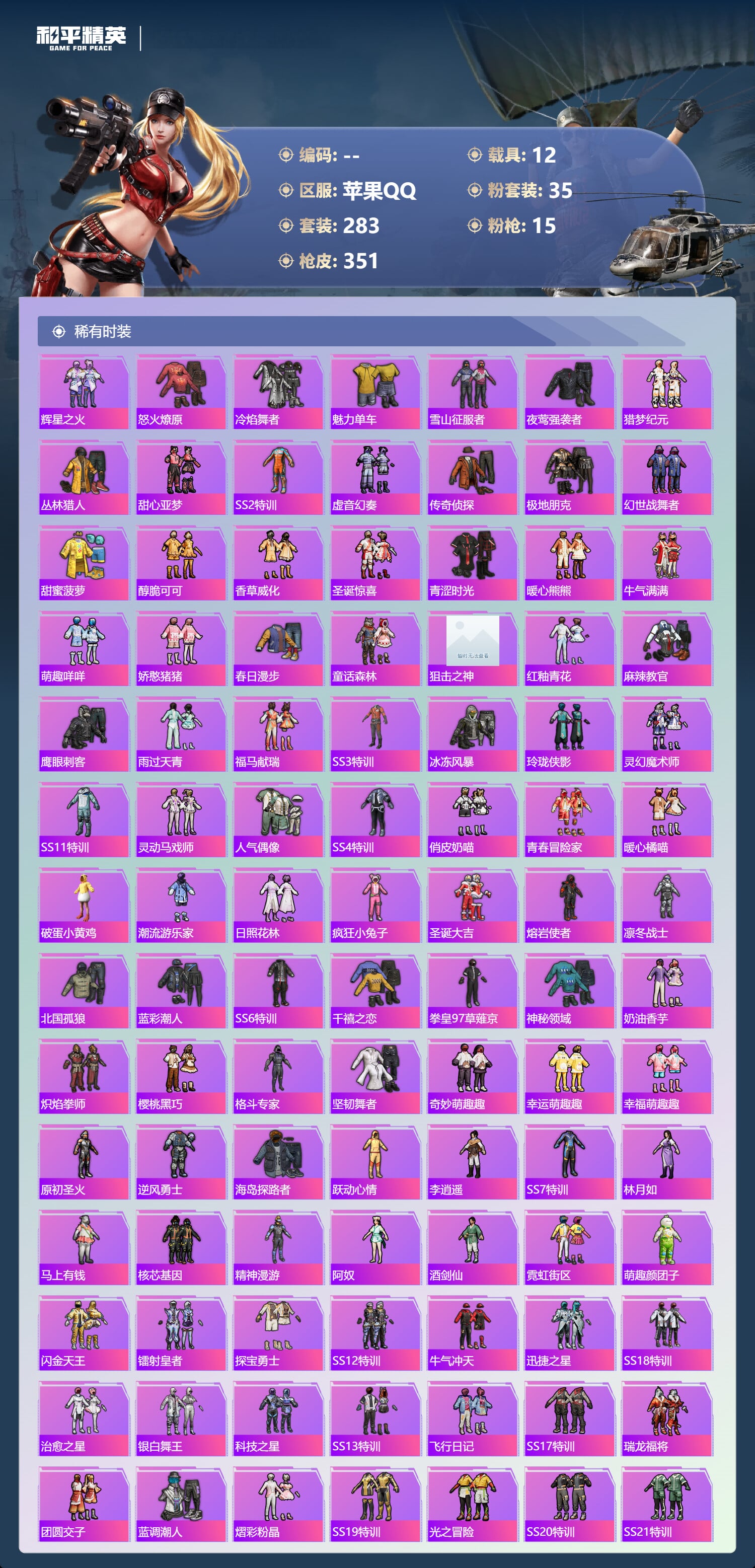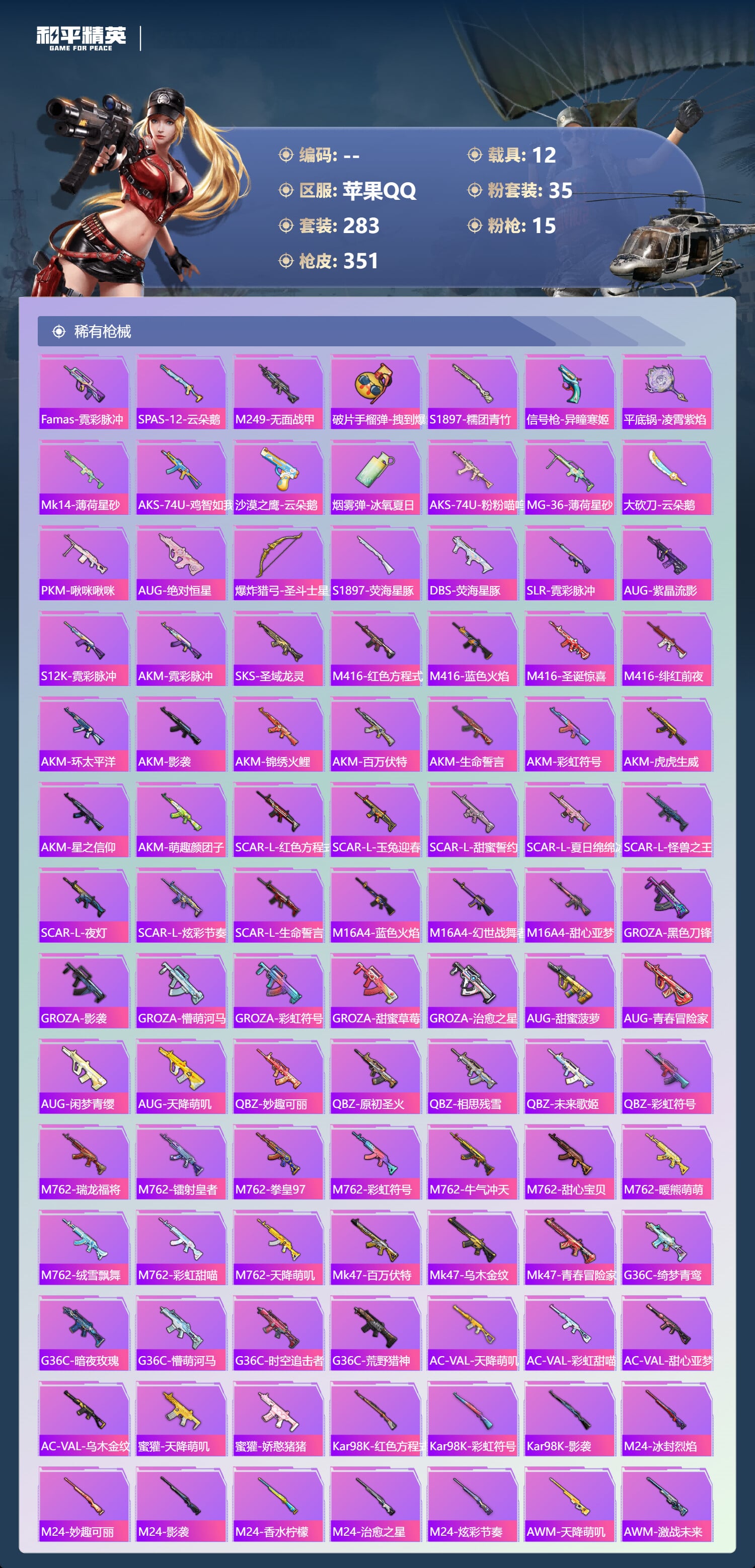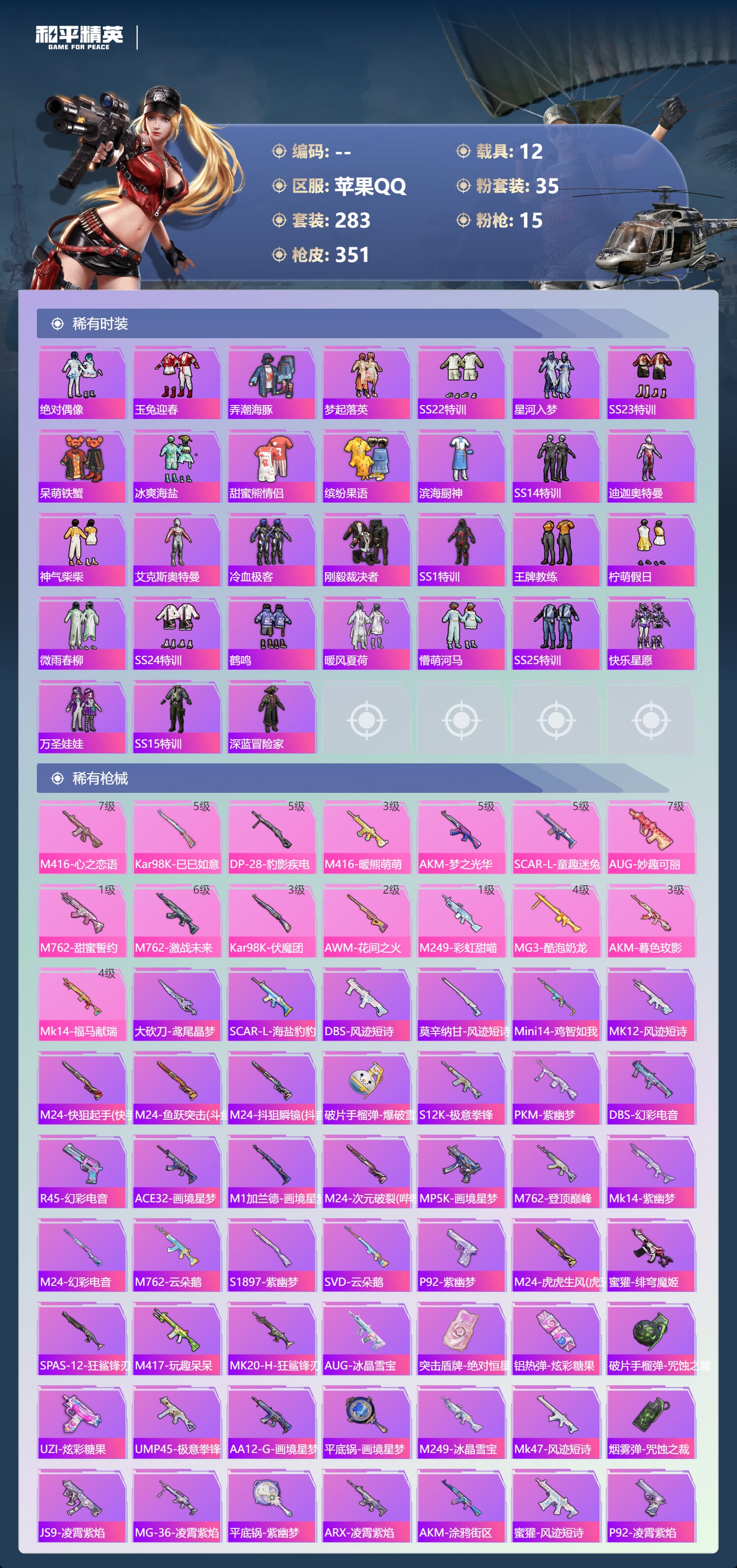 a4317/苹果QQ/21王牌印记-有战神框-35粉装-15特效枪-12载具-143523热力值-2
