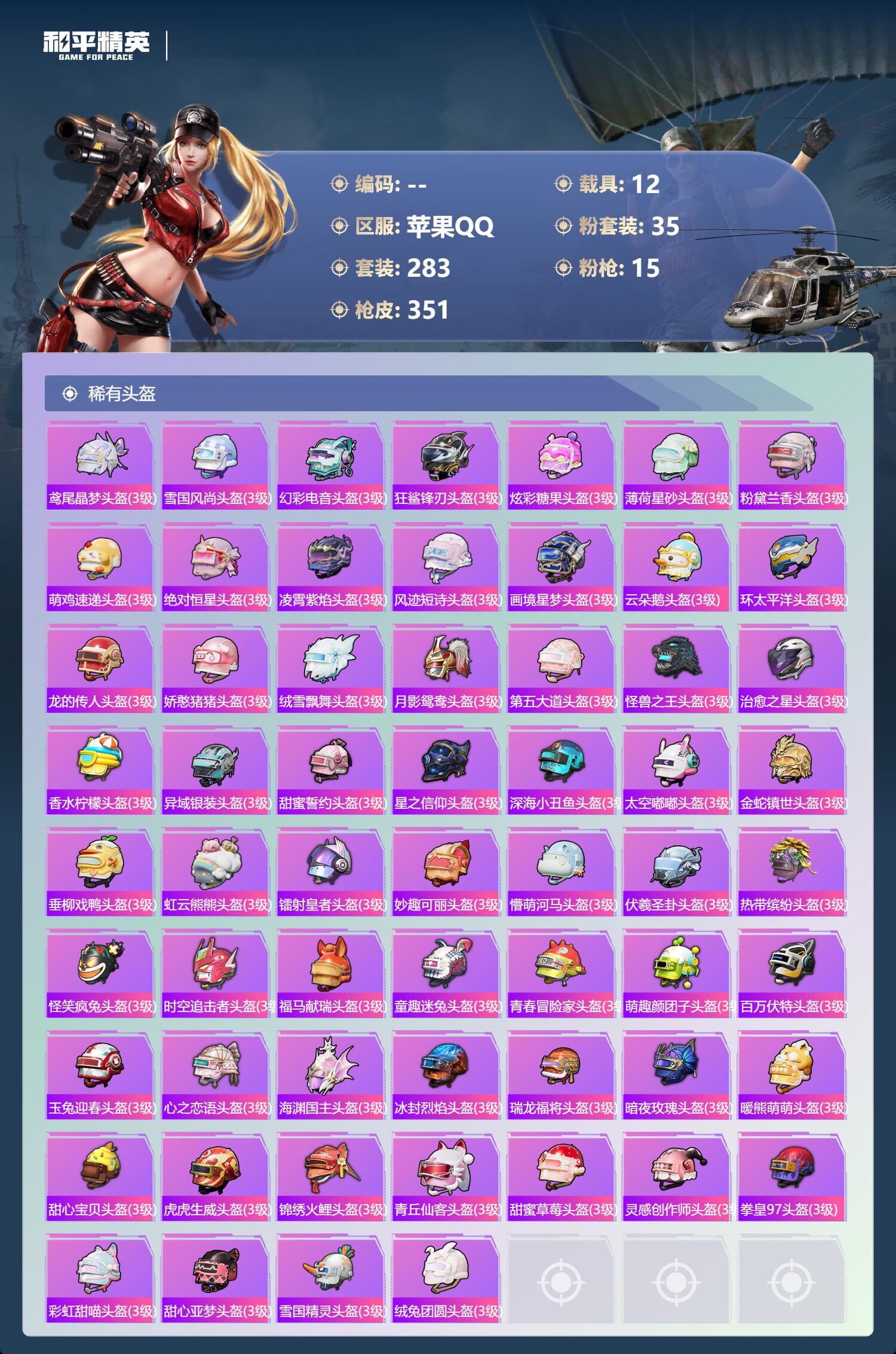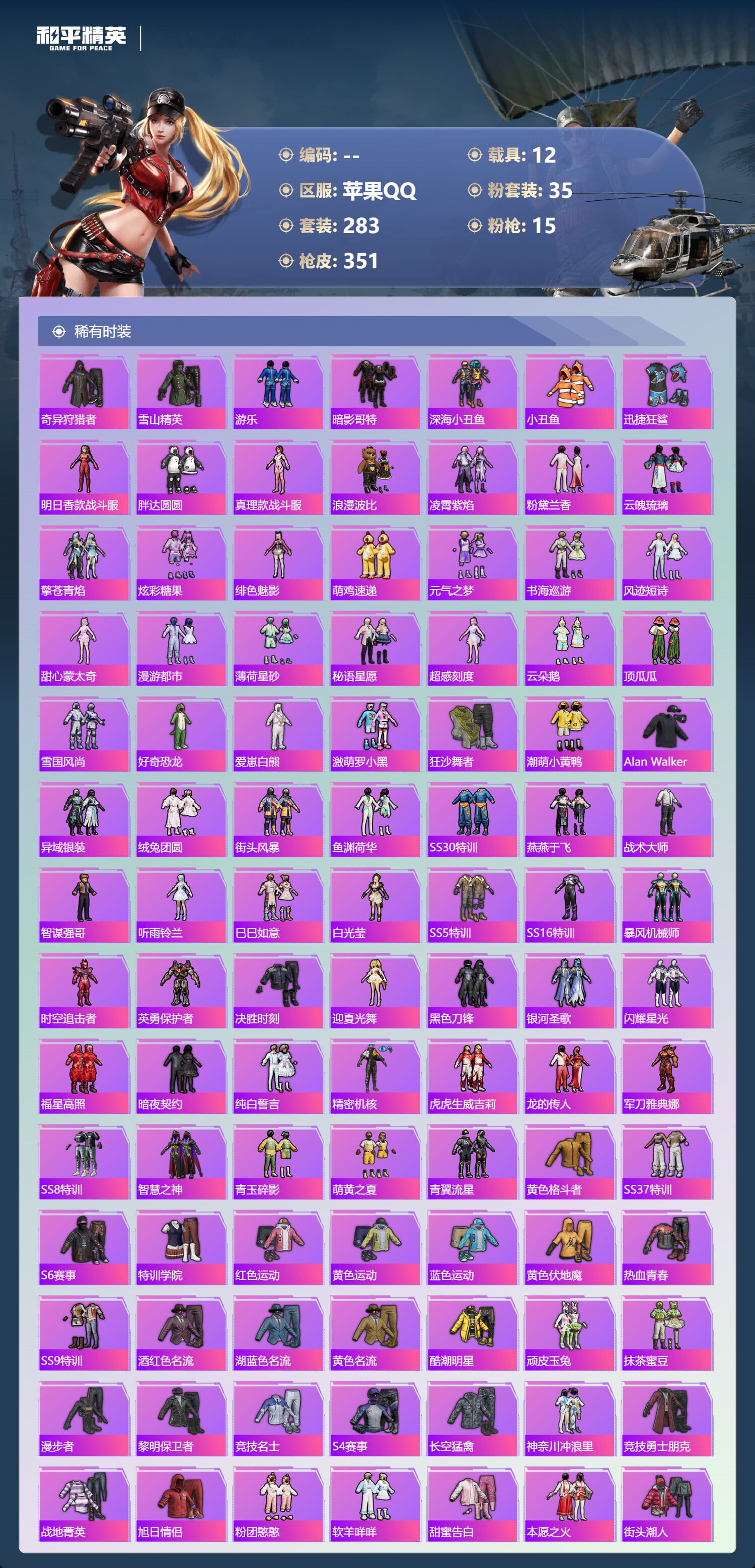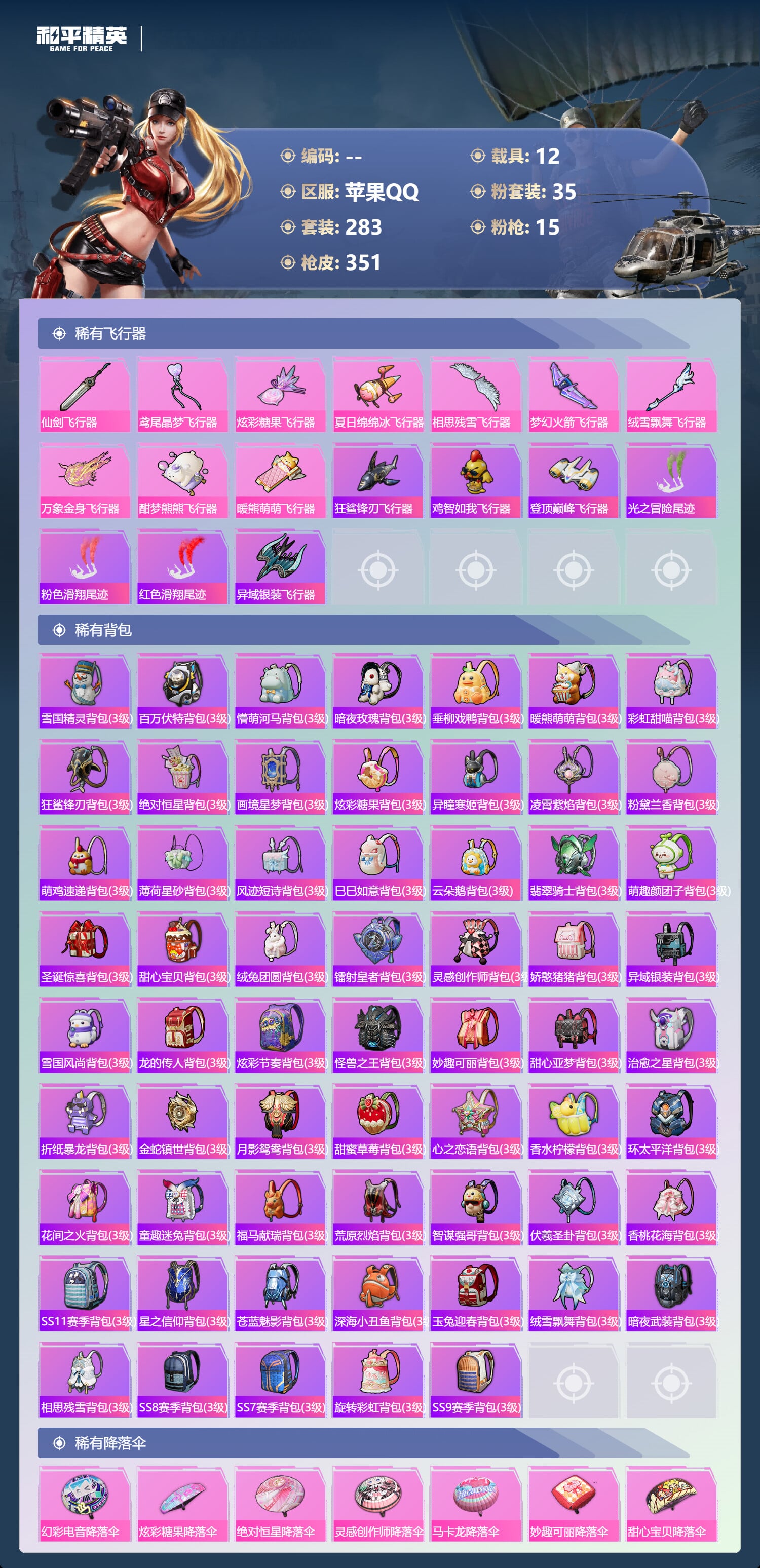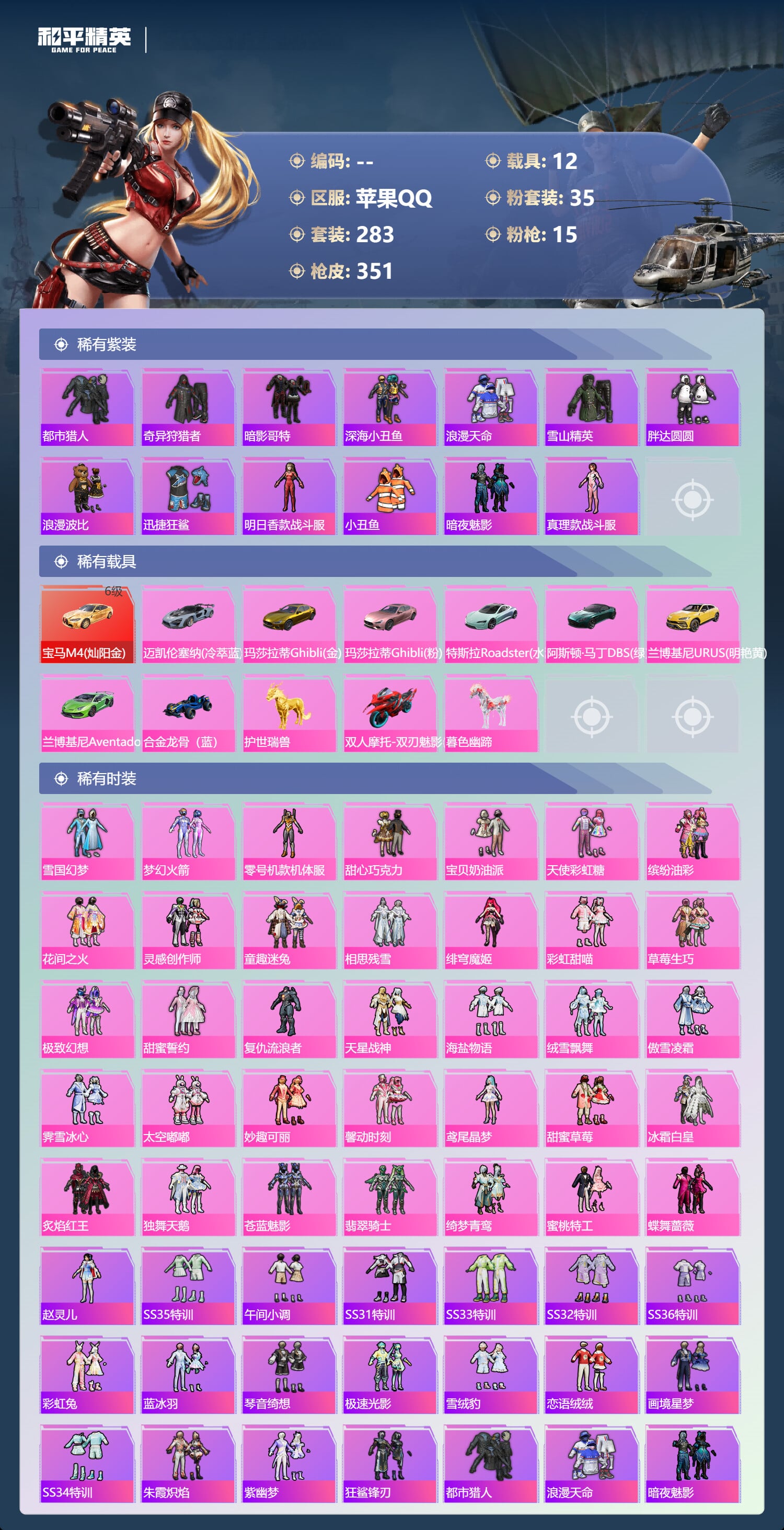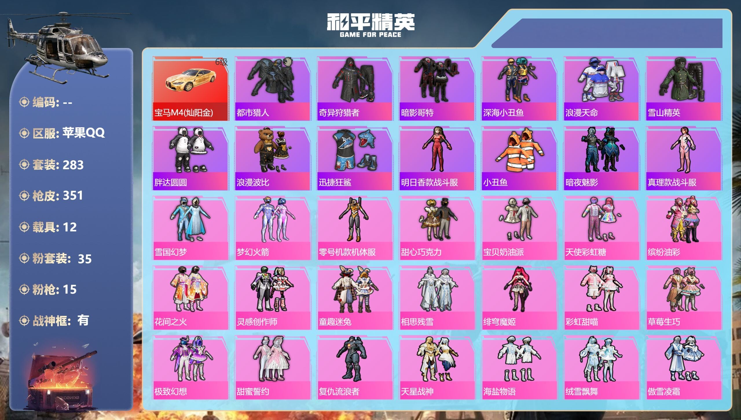 a4317/苹果QQ/21王牌印记-有战神框-35粉装-15特效枪-12载具-143523热力值-2