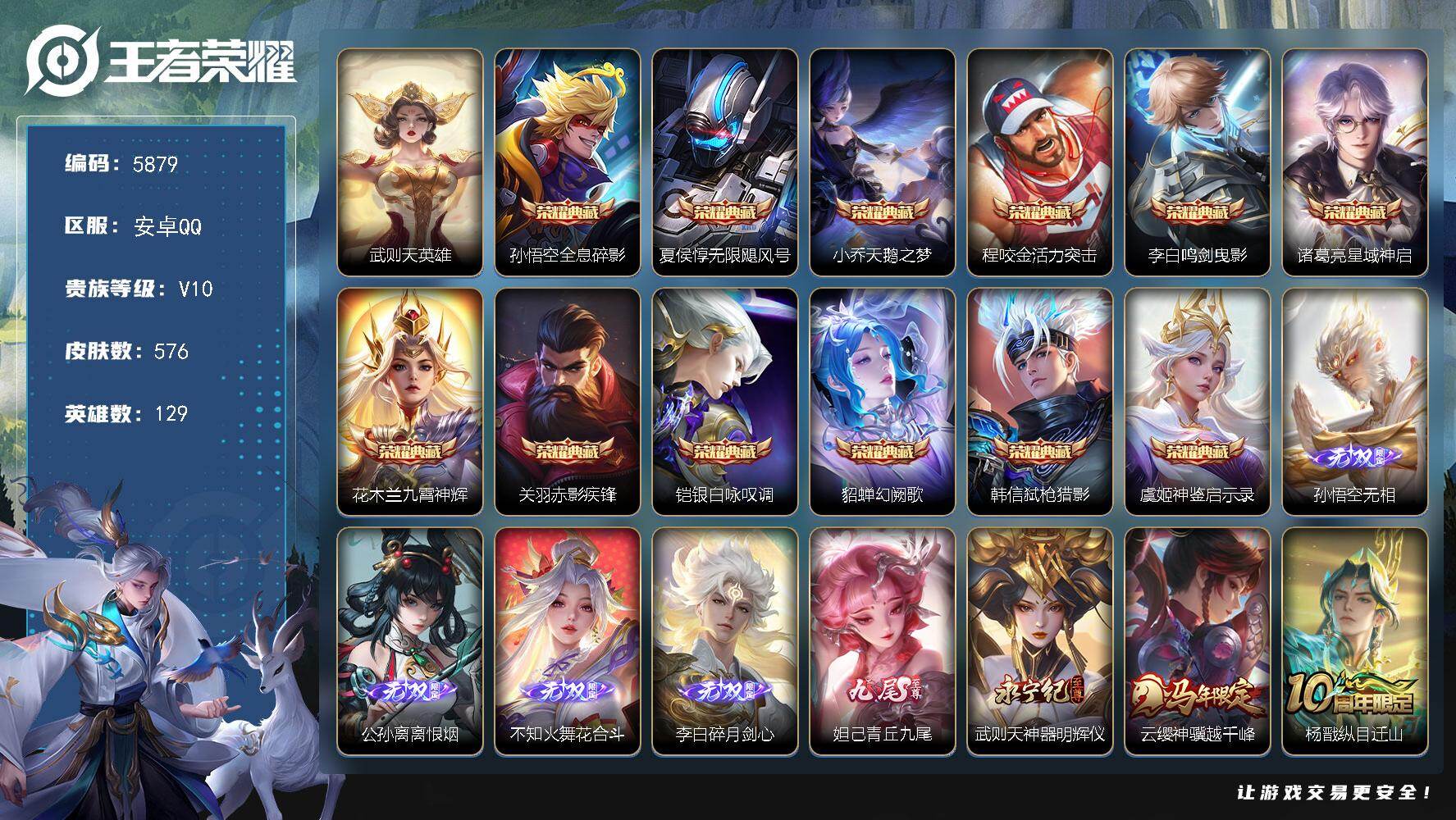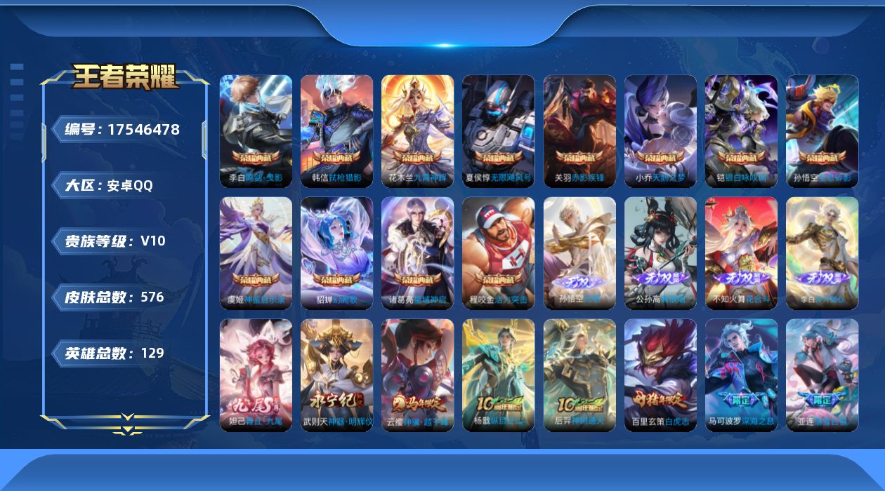834-[17546478]一梦云烟天幕 花朝天幕 皇冠号 贵族10-流光积分19126-贵族积分325194-576皮12典藏73传说6无双 安卓手Q98区 营地ID364728518无双王者【无双皮肤】:离恨烟,无相,花合斗,青丘·九尾,碎月剑心,神器·明辉仪【荣耀典藏】:赤影疾锋,弑枪猎影,神鉴启示录,幻阙歌,银白咏叹调,九霄神辉,活力突击,星域神启,鸣剑·曳影,天鹅之梦,无限飓风号,全息碎影【优质限定皮肤】:白虎志,至美·乘鲤谣,至尊宝,山海·苍雷引,山海·炽霜斩,天魔缭乱,无双飞将,
