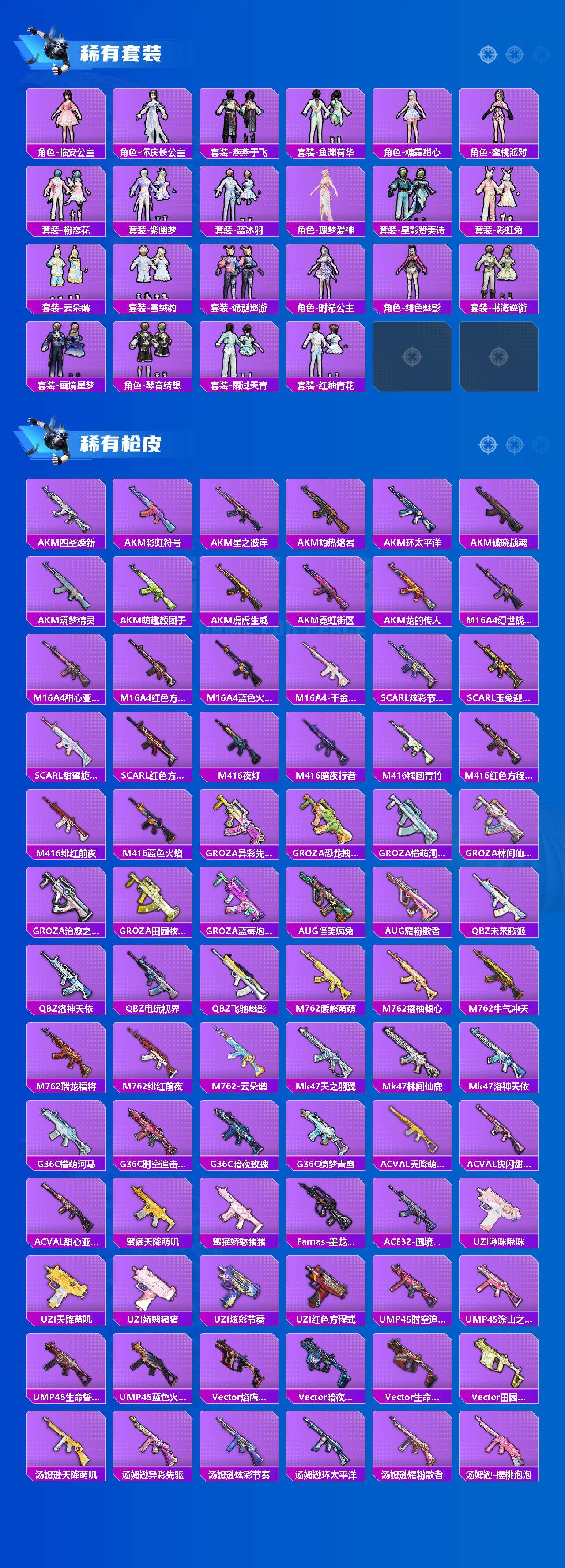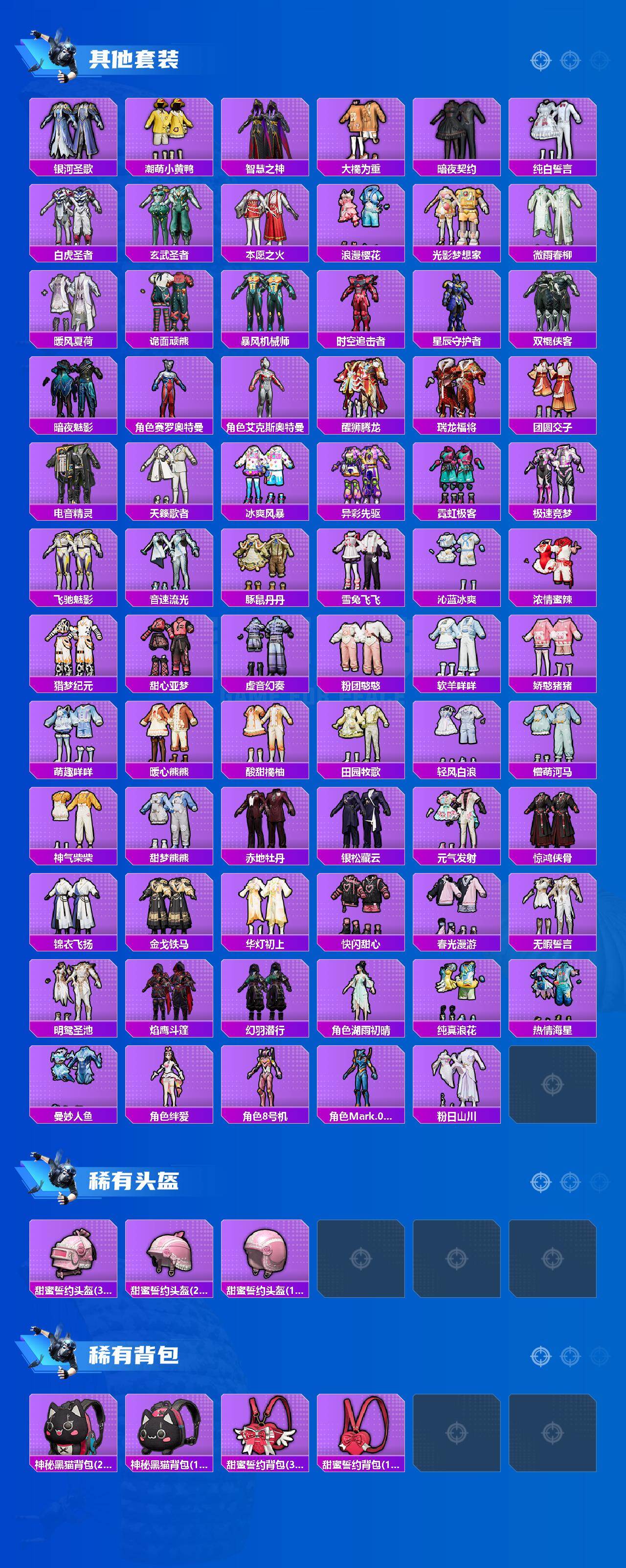 【粉色套装】:粉装-蝶舞蔷薇,粉装-暗夜玫瑰,粉装-彩虹鹿灵,粉装-山涧鹿灵,角色-洛天依,粉装-蓝莓炮弹,粉装-筑梦精灵,粉装-飒粉甜心,角色-呆萌星弥,粉装-闲梦青缨,角色-千金淑猫,粉装-星穹咏叹调,角色-狂魇小丑,角色-异瞳寒姬
