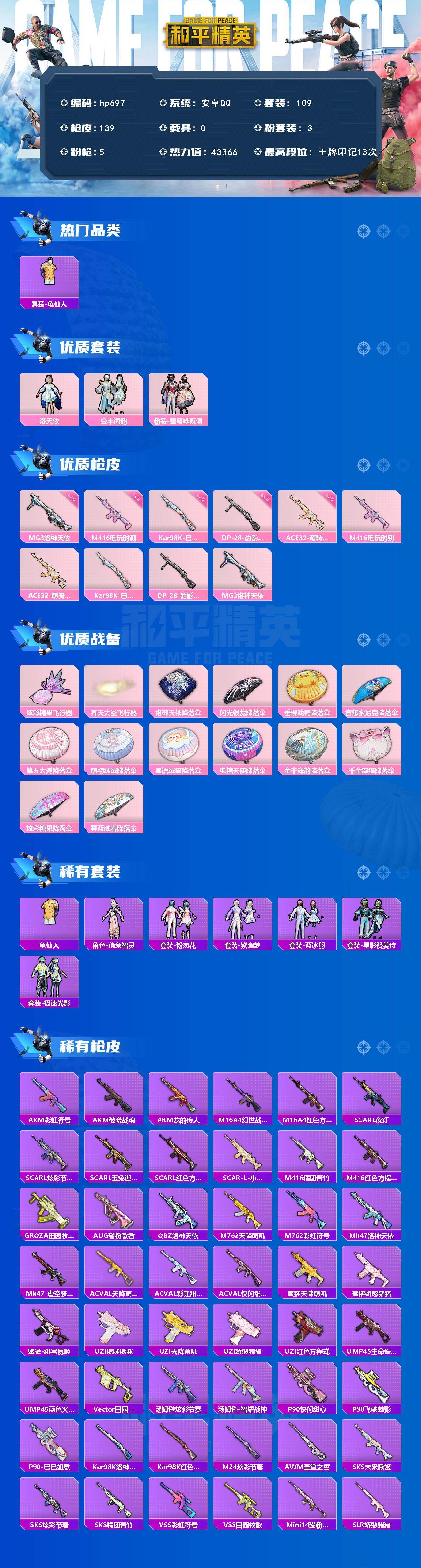 安卓 手Q-3粉装-5特效枪-0载具-3粉色飞行器-43366热力值-13王牌印记-109套装-139枪皮