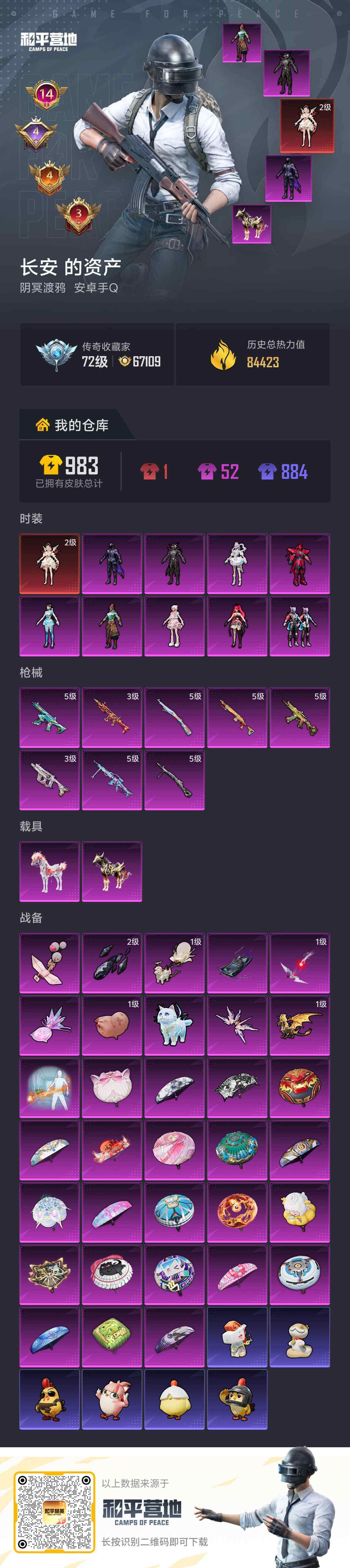 安卓 手Q-1神装-9粉装-8特效枪-2载具-10粉色飞行器-84447热力值-14王牌印记-206套装-238枪皮
