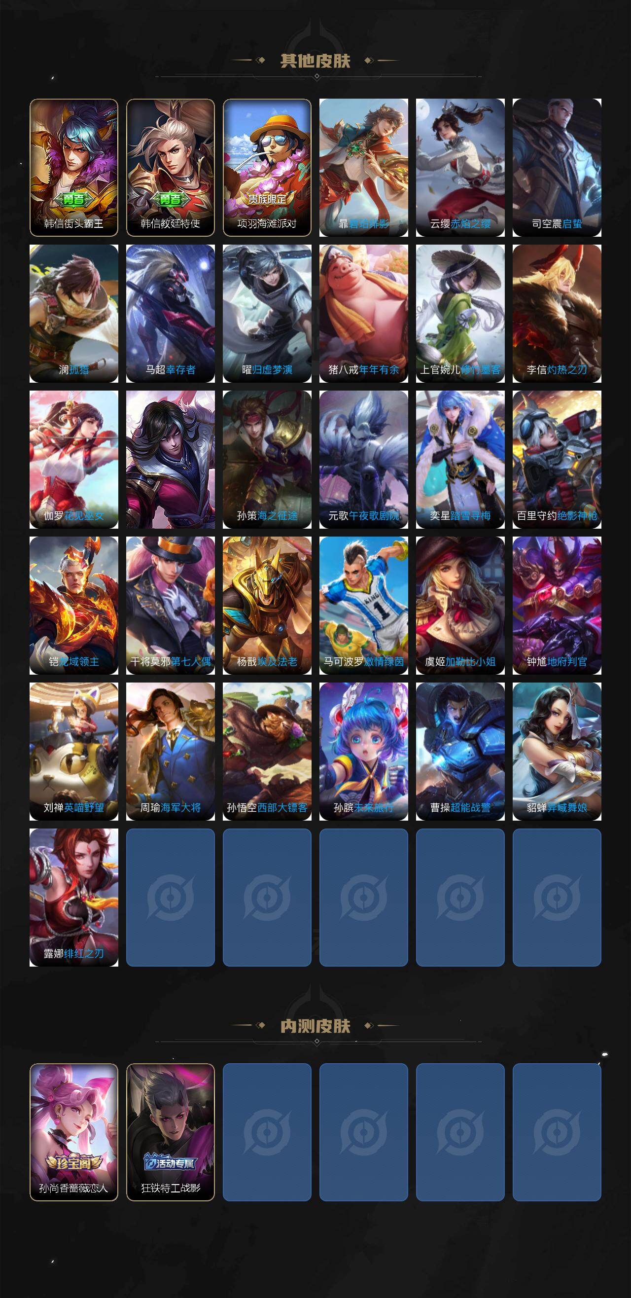 【限定皮肤】:蒙犽顽岩魄,姜子牙天穹之誓,杨戬破阵退雄兵,狄仁杰阴阳师,赵云皇家上将,孙尚香蔷薇恋人,元歌无心,夏侯惇匿光决锋者,马可波罗山海玄木吟,狄仁杰魔术师,达摩