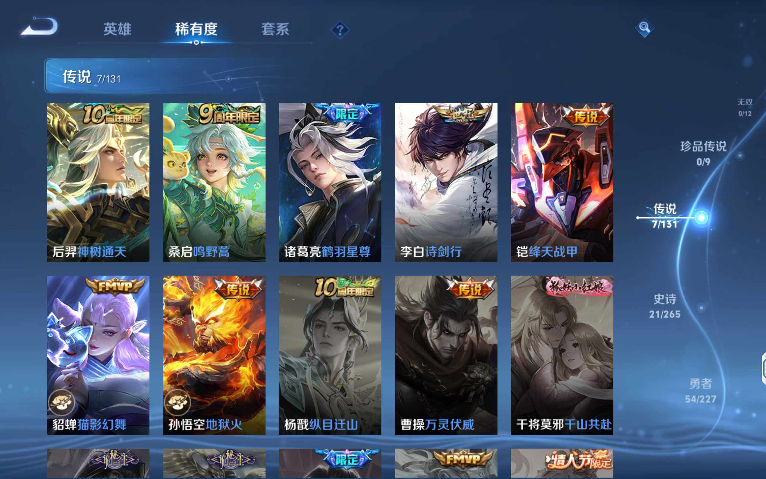 【传说皮肤】:后羿神树通天,桑启鸣野蒿,诸葛亮鹤羽星尊,李白诗剑行,铠绛天战甲,貂蝉猫影幻舞,孙悟空地狱火
