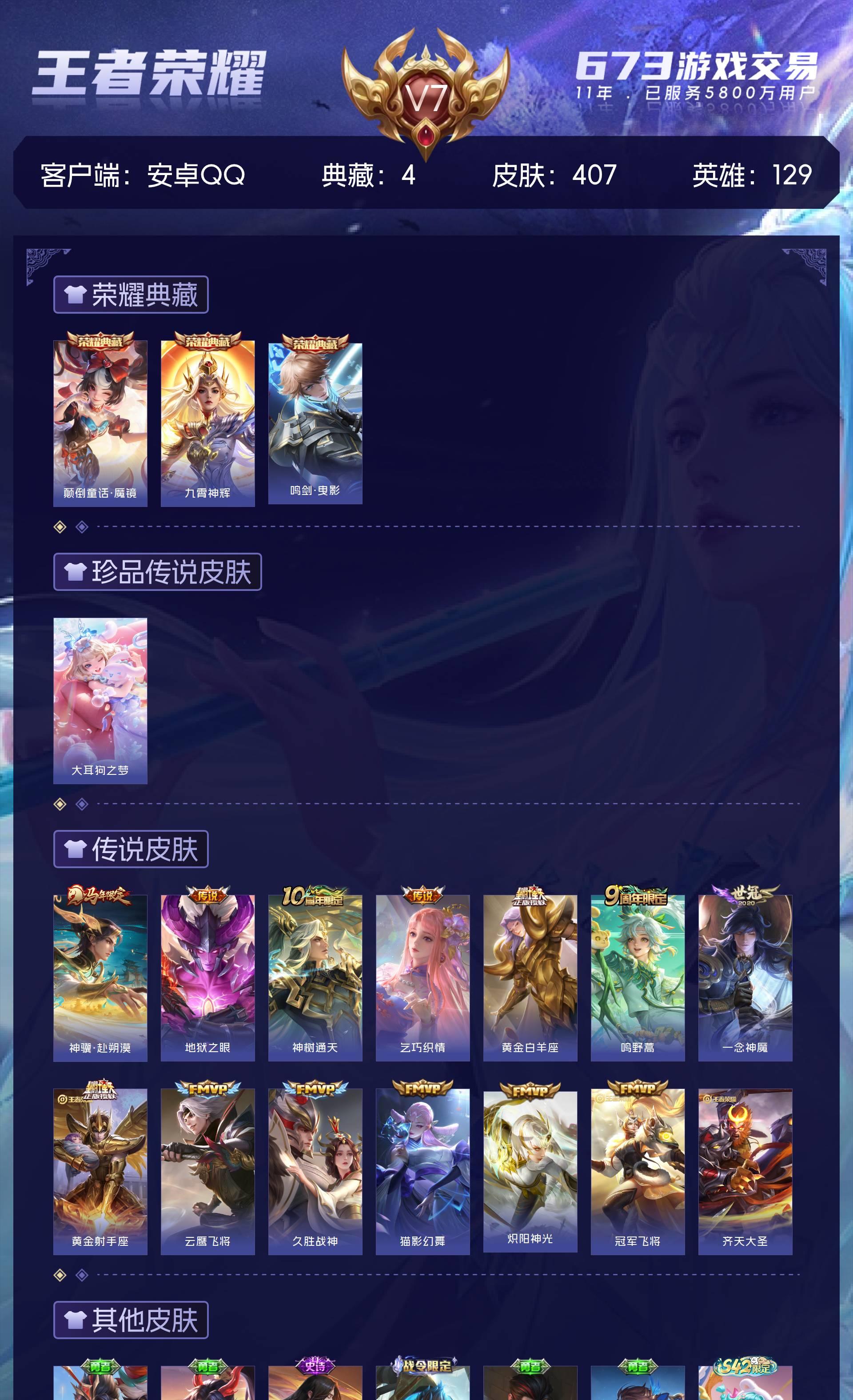 安卓QQ/非凡王者/407皮肤/129英雄/3典藏/0珍品无双/0无双/1珍品传说/13传说/107