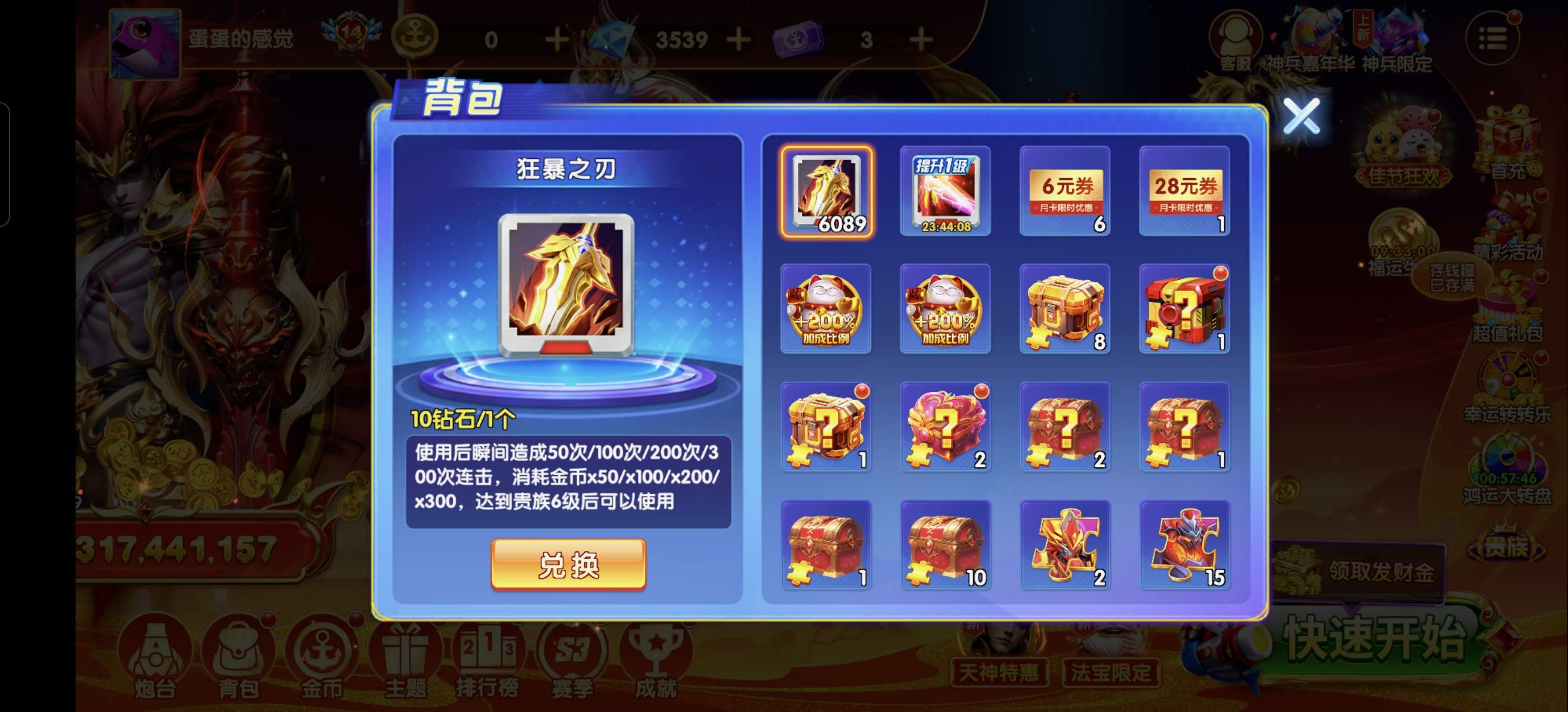 乐乐捕鱼v14空号,好久没玩了,有双倍充值,还有700多的绿卷,有部分神兵,等待有缘人
