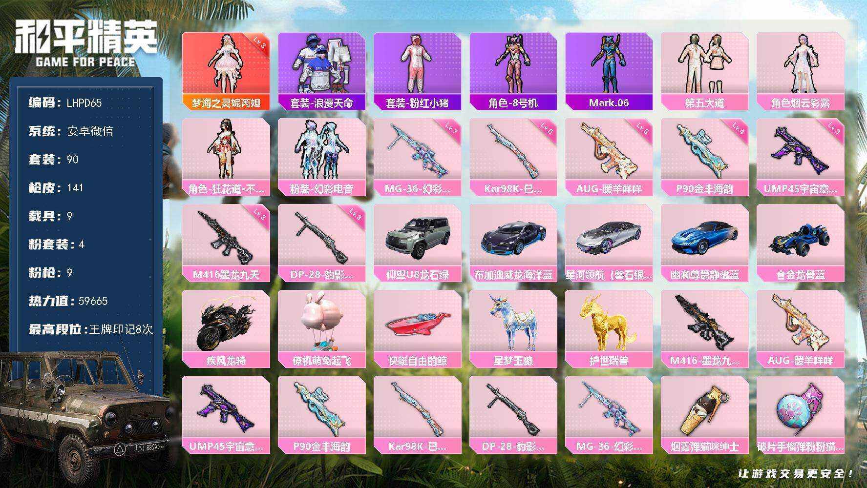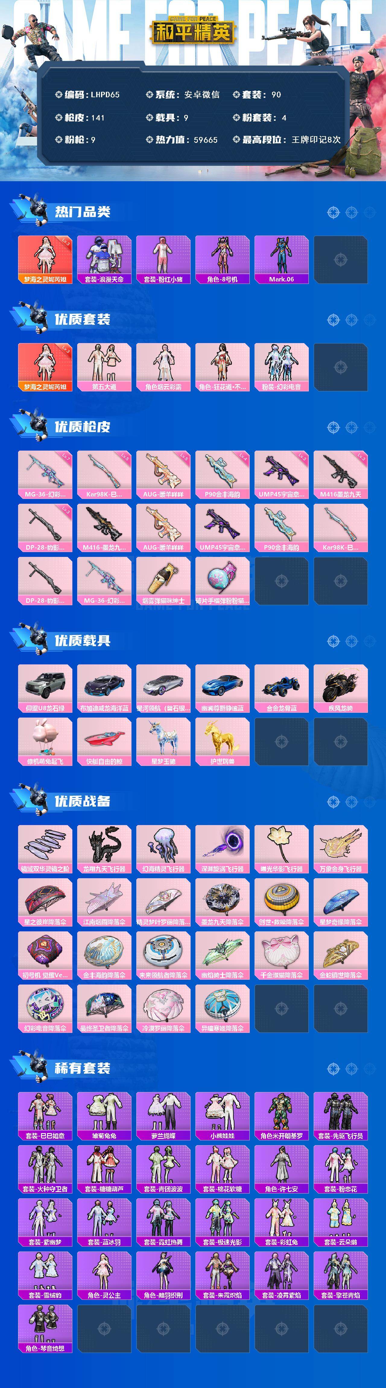 【特价出售/店主推荐】安卓 微信-1神装-4粉装-9特效枪-9载具-7粉色飞行器-59665热力值-8王牌印记-90套装-141枪皮【红色神装等级】:梦海之灵-妮芮妲(三级)【红色角色神装】:梦海之灵-妮芮妲【热门品类】:套装-浪漫天命,套装-粉红小猪,角色-8号机,角色-Mark.06【粉色套装】:粉装-第五大道,角色-烟云彩露,角色-狂花道·不知火舞,粉装-幻彩电音【粉色枪皮等级】:M416