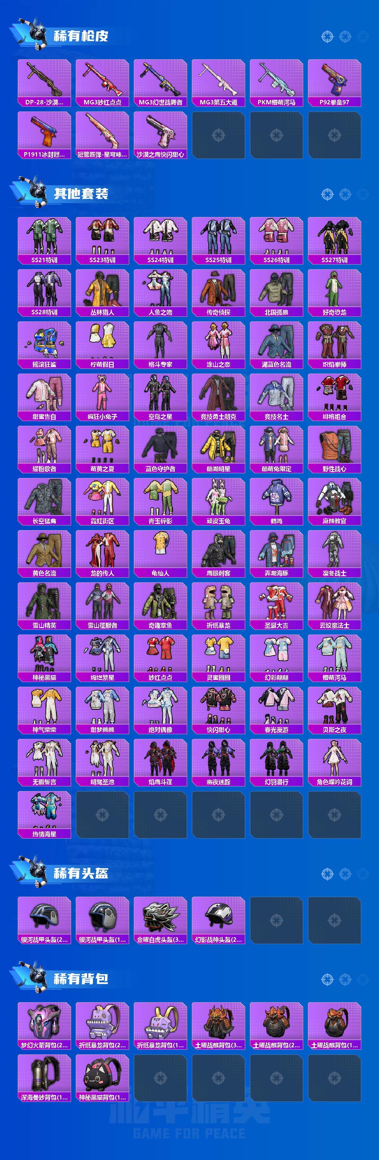 【粉色枪皮】:AKM-炫紫旋律,M416-风花雪月,AUG-圣斗士星矢,ACE32-萌骑漫游,AMR-智耀战神,DP-28-圣堂之誓