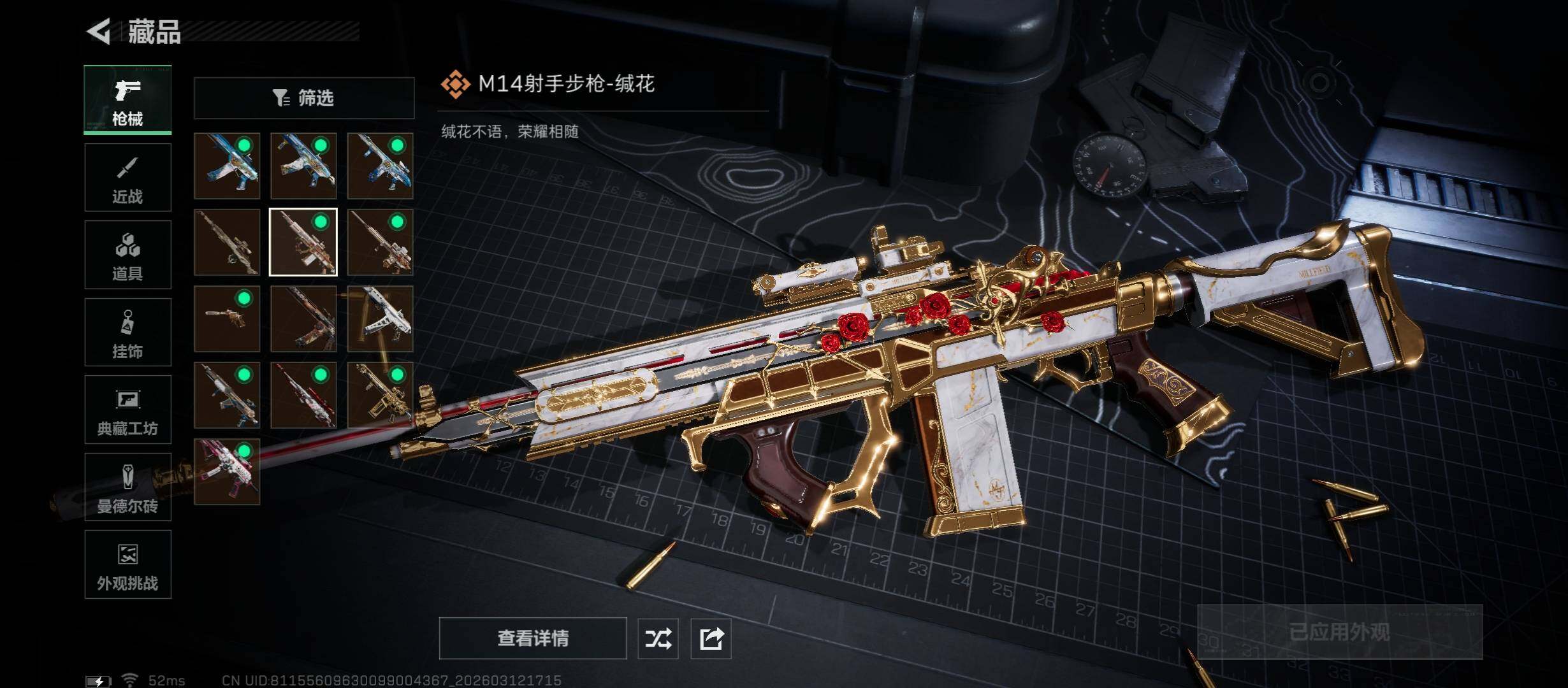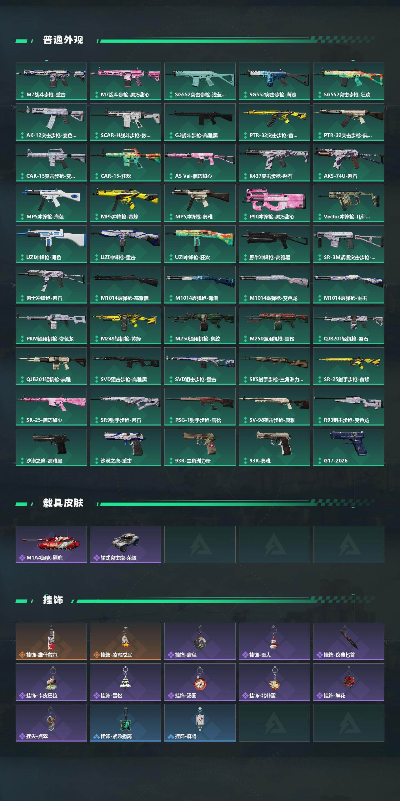 【传说外观】:K416突击步枪-行动记录,SG552突击步枪-运动员,SG552突击步枪-点翠,SCAR-H战斗步枪-启航,KC17突击步枪-点翠,勇士冲锋枪-能天使-午夜邮差,M14射手步枪-蛮荒