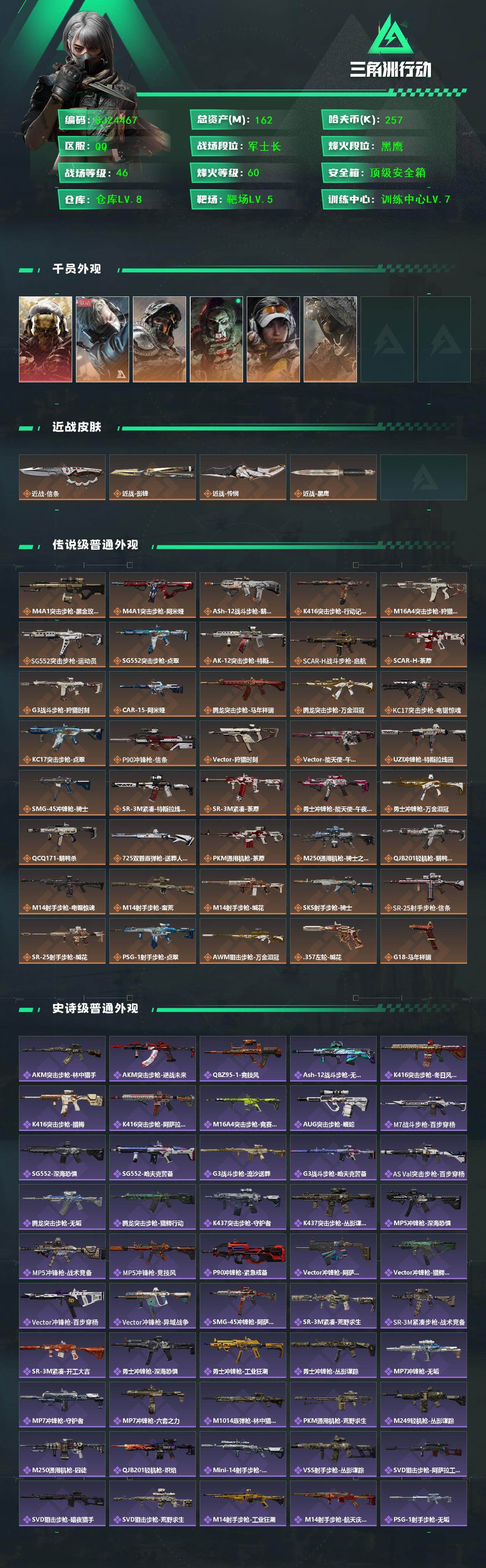 【SJZ4467】总资产(M):162M/哈夫币(K):257K/哈夫币(K):257K/传说枪皮数:40/全面战场等级:46_段位:军士长/烽火地带等级:60_段位:黑鹰/红狼-蚀金玫瑰/蜂医-送葬人·无题密令/深蓝-不破誓约/红狼-电锯惊魂/露娜-金牌射手/乌鲁鲁-荒原猎手/近战-信条/近战-影锋/近战-怜悯/近战-黑鹰/M4A1突击步枪-蚀金玫瑰/M4A1突击步枪-阿米娅/ASh-12战斗步枪-鹅鸭杀/K416突击步枪-行动记录/M16A4突击步枪-狩猎时刻/SG552突击步枪-运动员/S