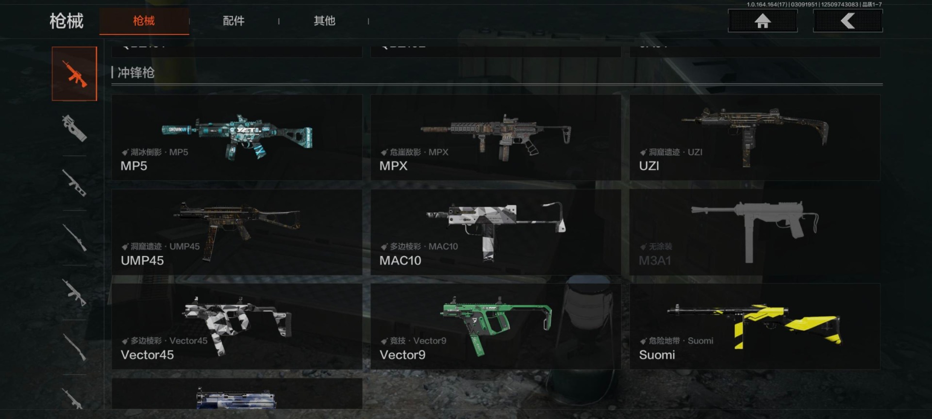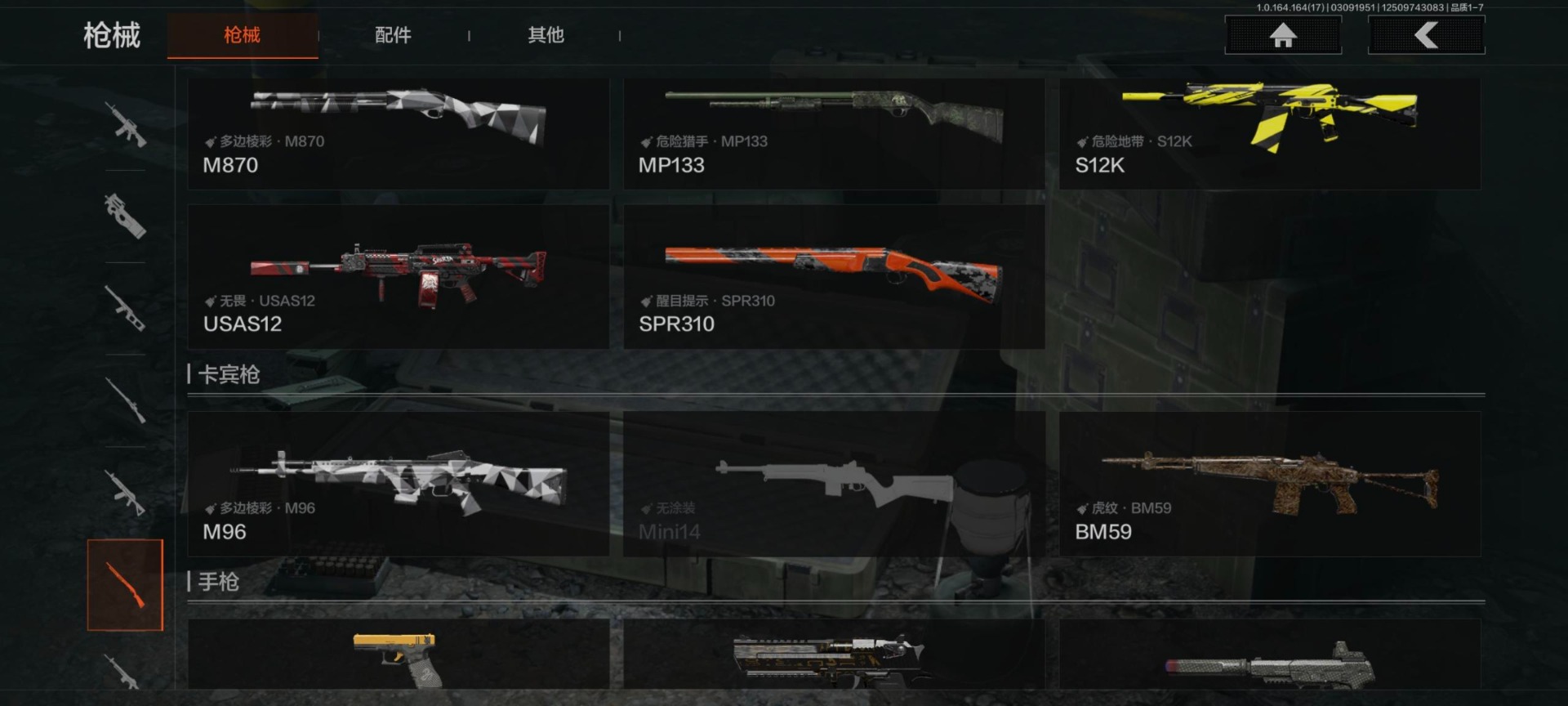 【紫色枪皮】鱼跃丹青·QBU191,典礼武备·MCX,火力倾泻·AUG,棱光裂变·AK102,棱光裂变·莫辛,火力倾泻·RPD,莫克斯·M24,格勒涂装·AK12,战术大师·SJ16,骑士之剑·AKM,深暗星云·M4A1,