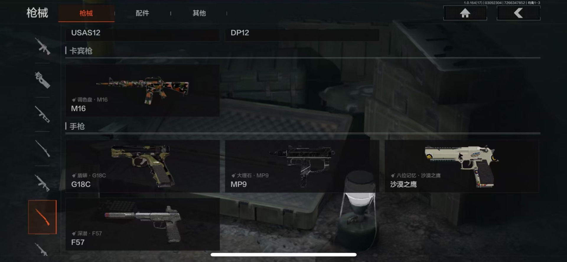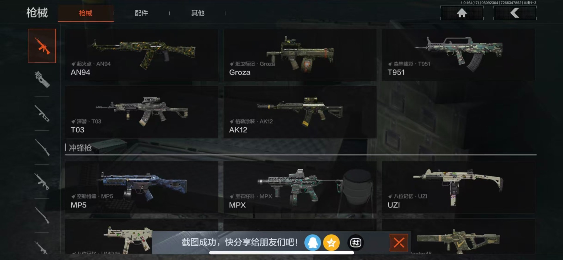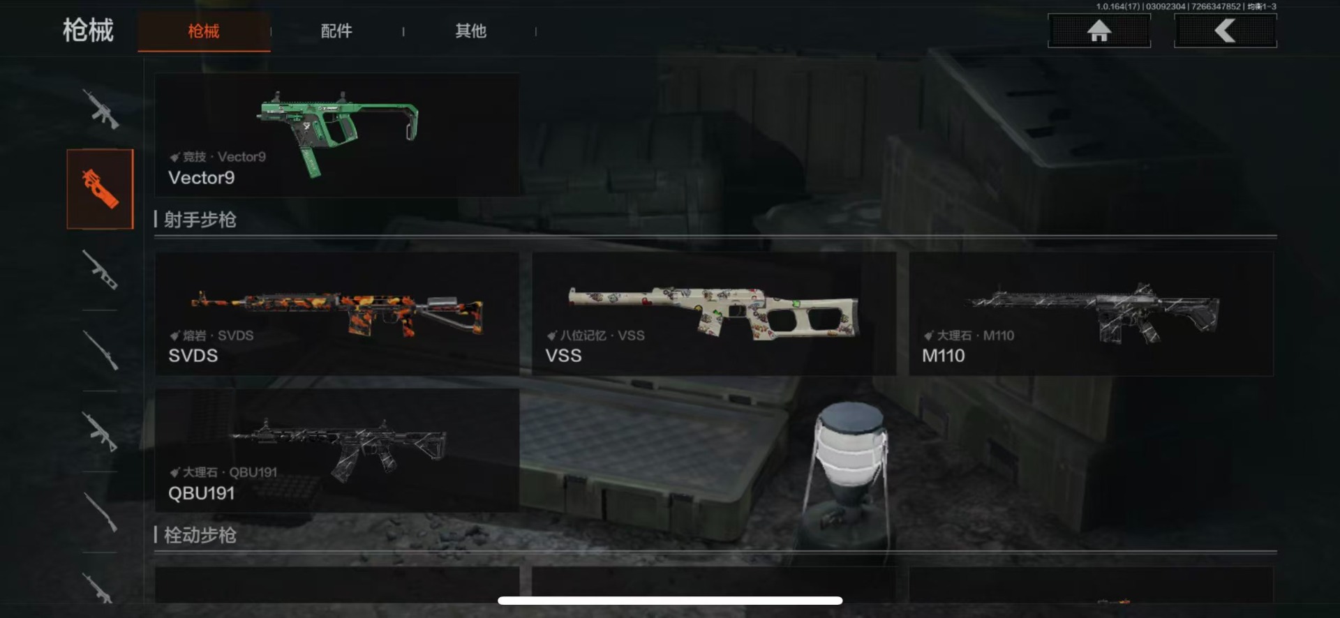 【紫色枪皮】包络战术·USAS12,格勒涂装·AK12,包络战术·莫辛,包络战术·AK74N,宝石籽料·MPX,顶级外设·RPK16,近卫标记·Groza,无声暗月·AX50,无声暗月·AR57,危崖敌影·F2000,深潜·T03