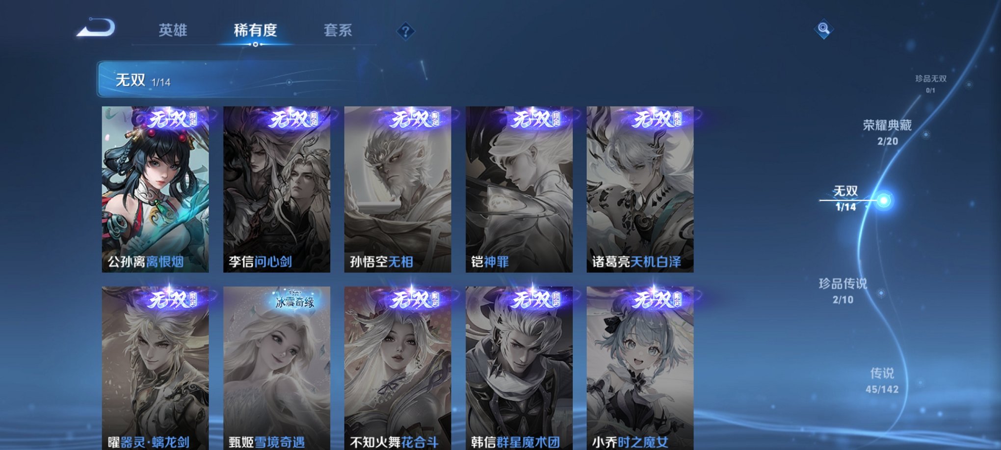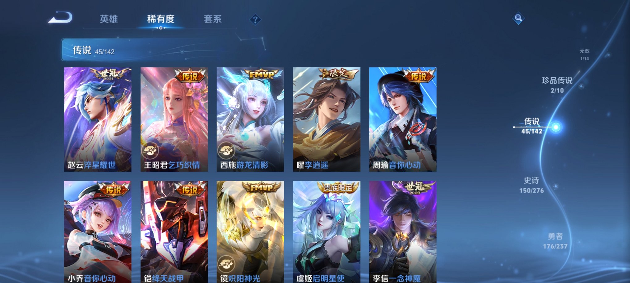 45传说447皮肤2水晶1无双2珍品5星元1金标
