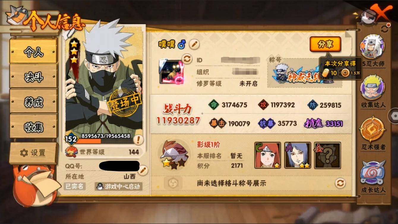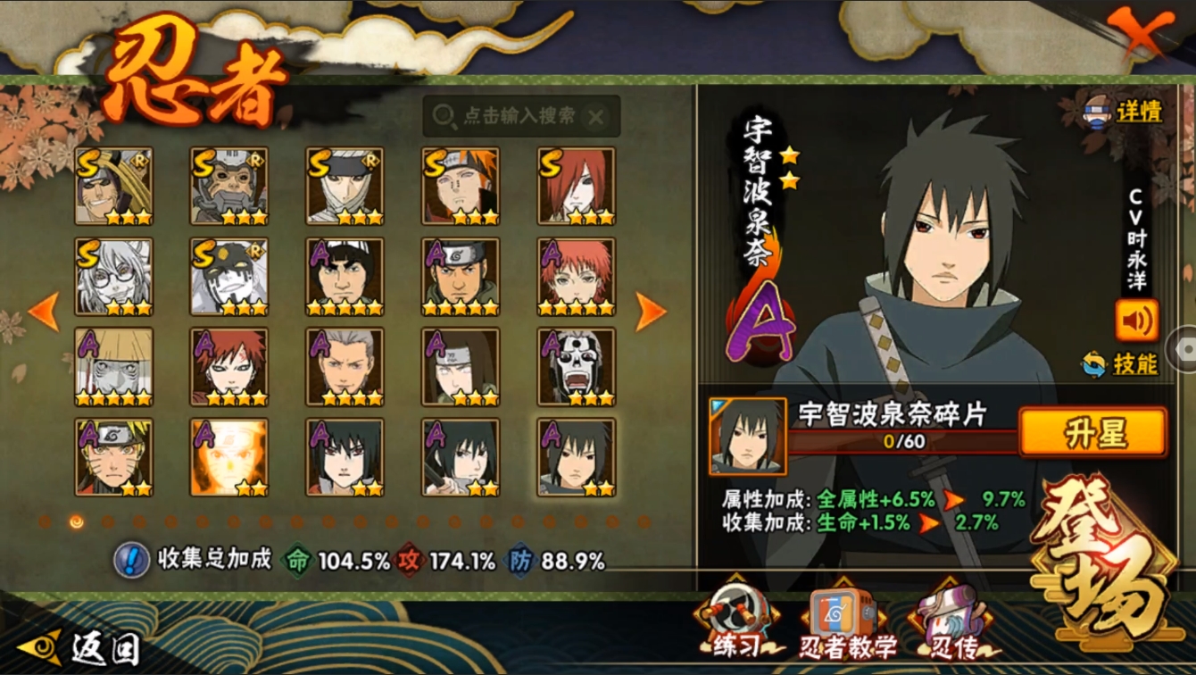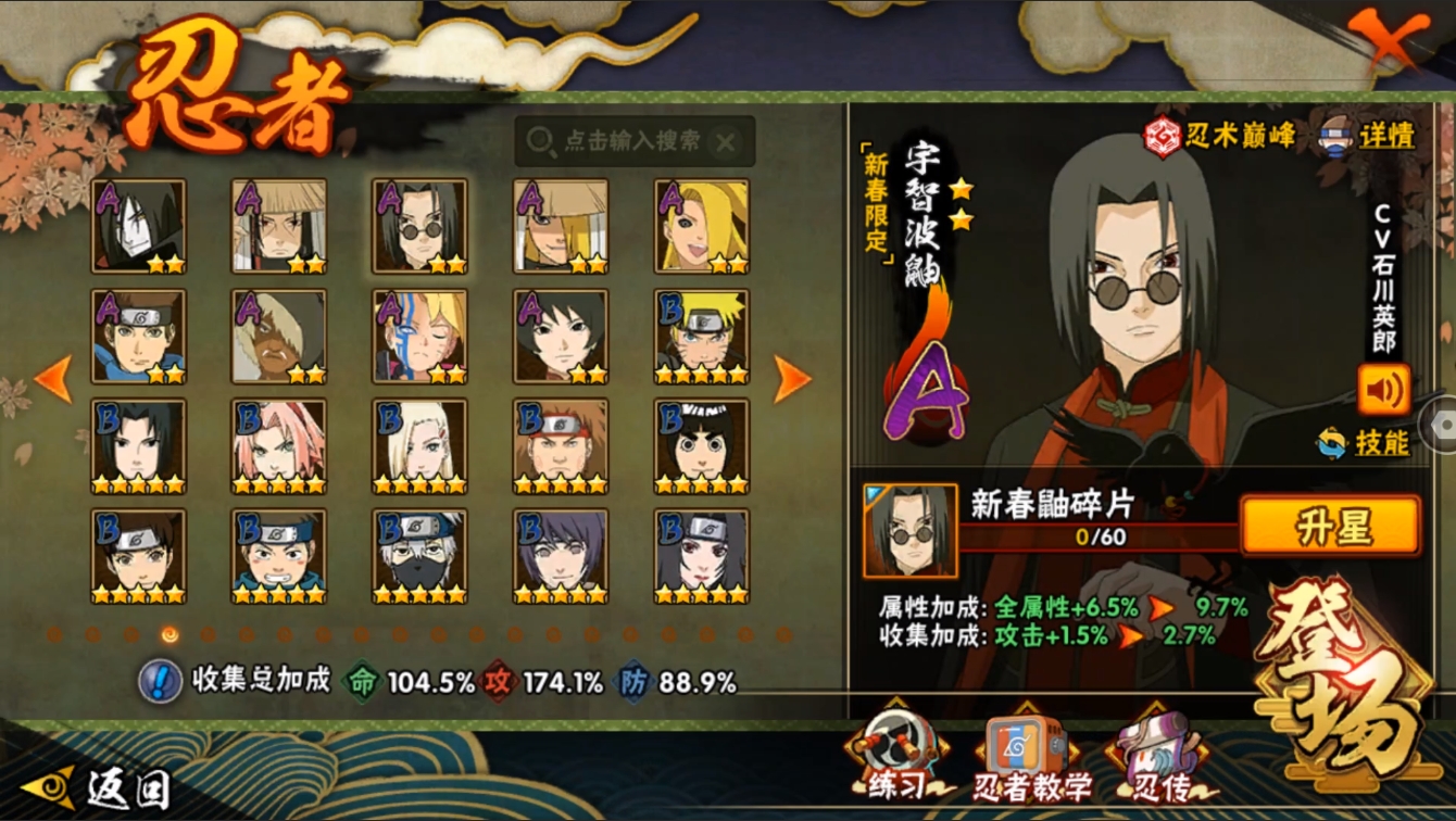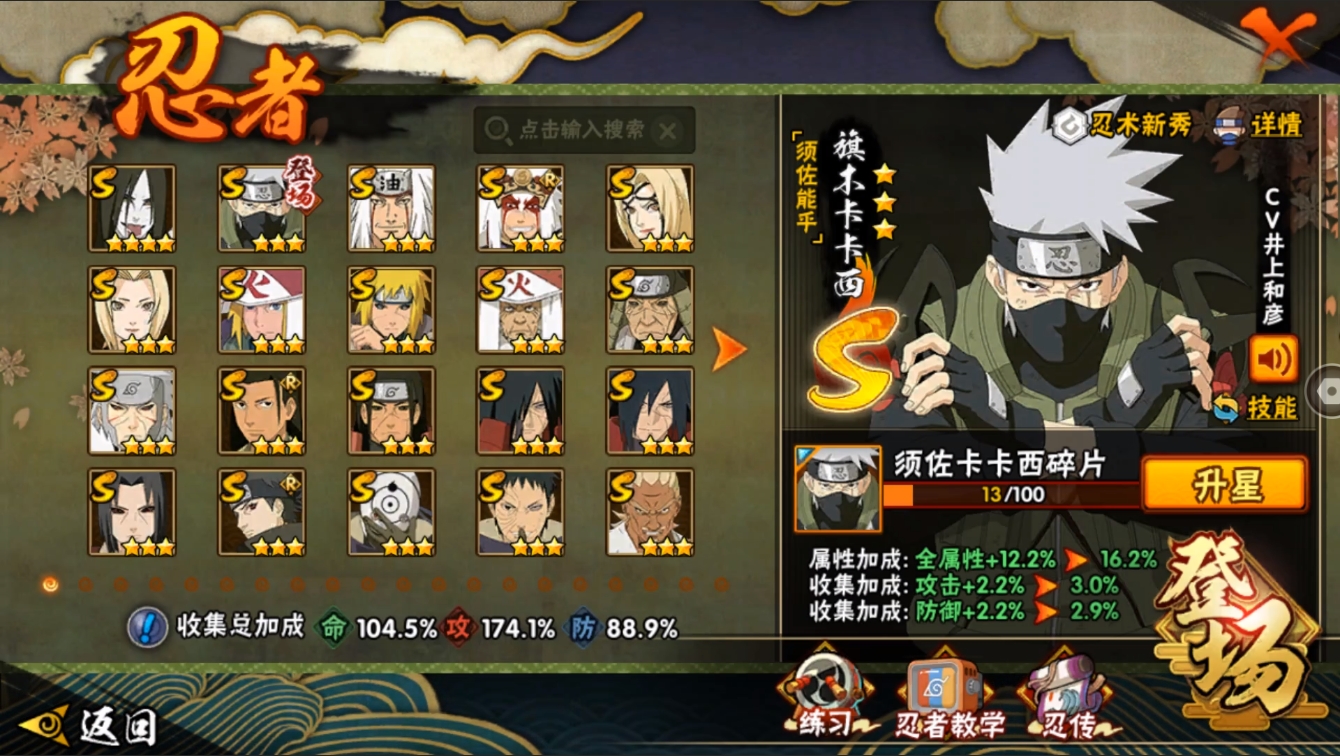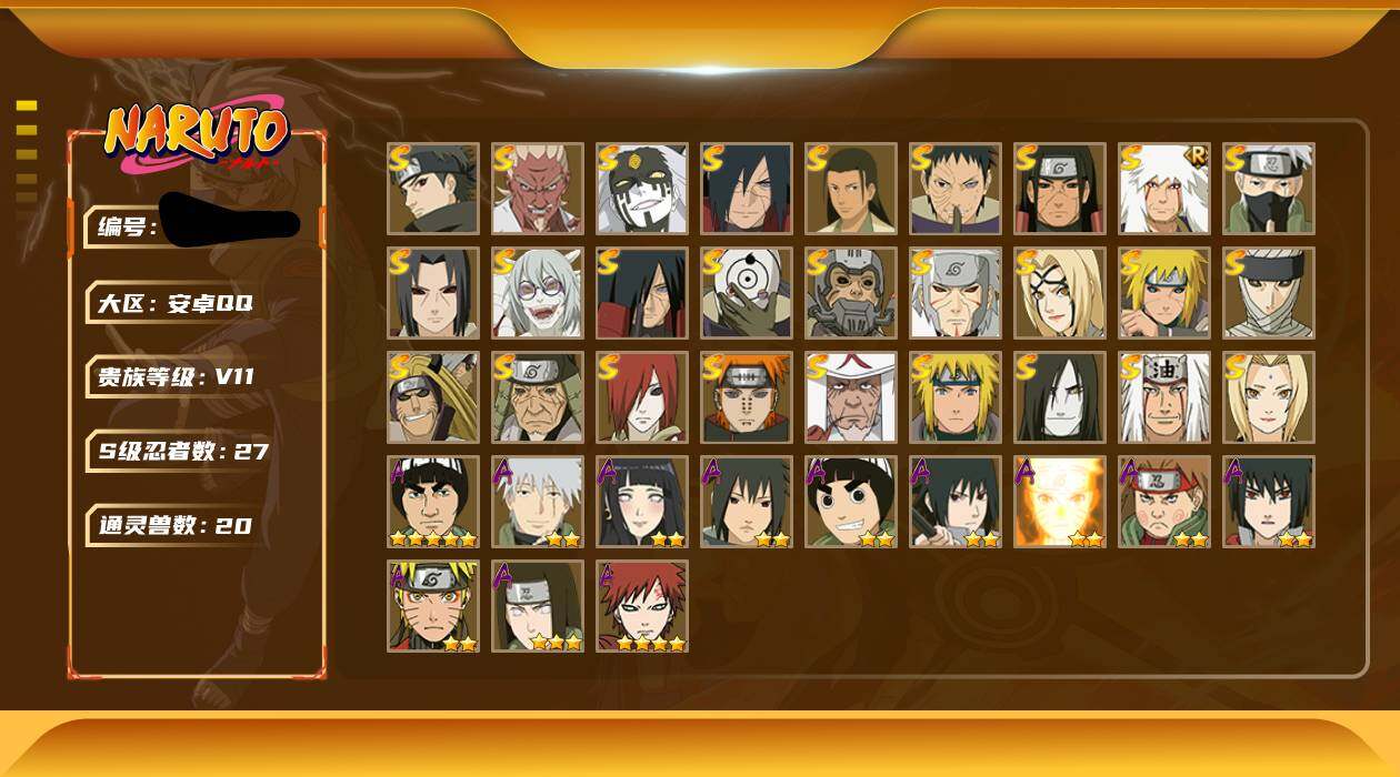 【编号24901可秒换绑】店长推荐特价处理精品号27S级忍者数-42A级忍者数【S级忍者】:长门「秽土转生」(3星),半藏「秽土转生」(3星),金角·银角「秽土转生」(3星),猿飞日斩「秽土转生」(3星),波风水门「秽土转生」(3星),千手扉间「秽土转生」(3星),千手柱间「秽土转生」(3星),宇智波鼬「秽土转生」(3星),宇智波斑「秽土转生」(3星),宇智波斑「秽土转生·解」(3星),宇智波带土「忍界大战」(3星),艾「忍界大战」(3星),宇智波止水「须佐能乎」(3星),旗木卡卡西「须佐能乎」