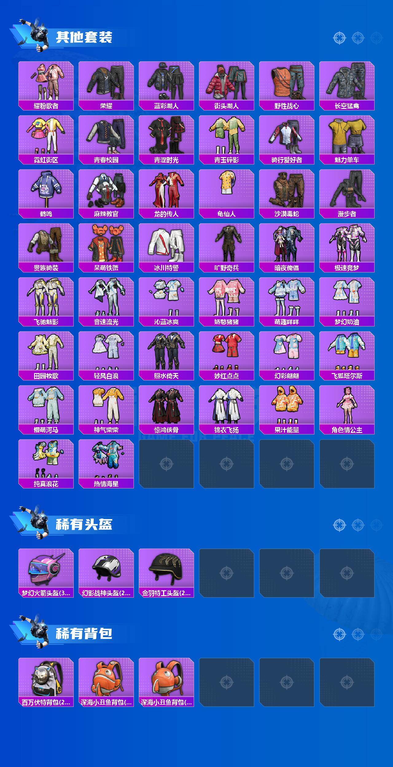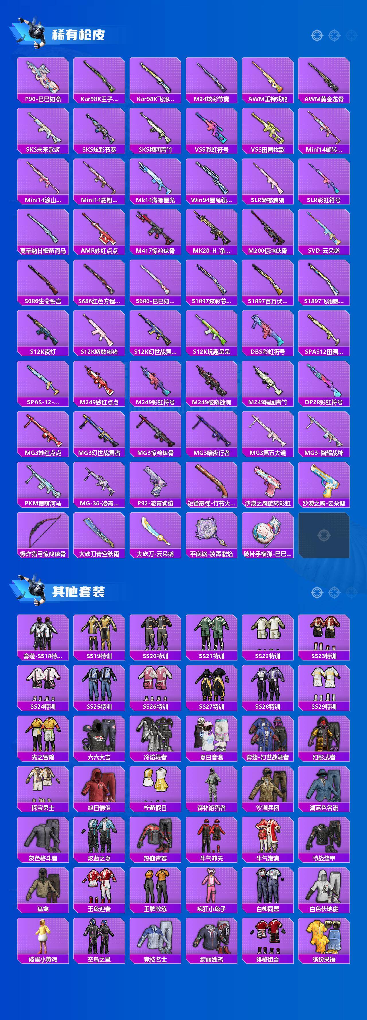 【稀有套装】:套装-龟仙人,套装-巳巳如意,套装-炫彩糖果,角色-米开朗基罗,角色-俏兔智灵,套装-燕燕于飞,套装-鱼渊荷华,套装-闪电轻猫,套装-云朵鹅,套装-雪绒豹,套装-蜜露汐语,套装-朱霞炽焰,套装-凌霄紫焰