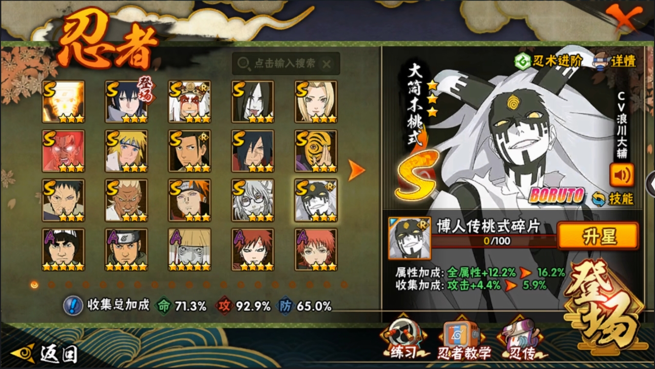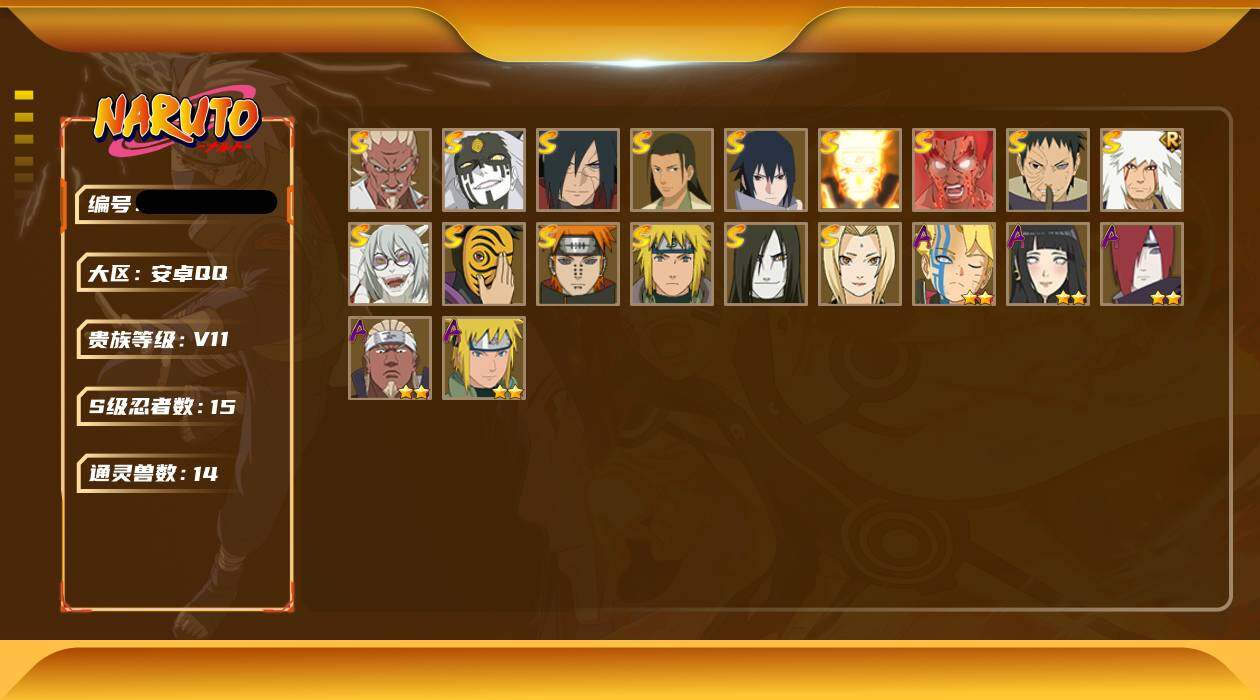 【编号06513】店长推荐特价处理精品号15S级忍者数-25A级忍者数【S级忍者】:宇智波斑「秽土转生·解」(3星),宇智波带土「忍界大战」(3星),艾「忍界大战」(3星),千手柱间「木叶创立」(3星),自来也「舞之豪杰」(3星),大蛇丸(3星),纲手(3星),波风水门(3星),药师兜「仙人模式」(3星),神秘面具男(3星),漩涡鸣人「九喇嘛连结」(3星),迈特凯「死门」(3星),佩恩「天道」(3星),宇智波佐助「永恒万花筒」(3星),大筒木桃式(3星)【A级忍者】:艾「青年」(2星),长门「青
