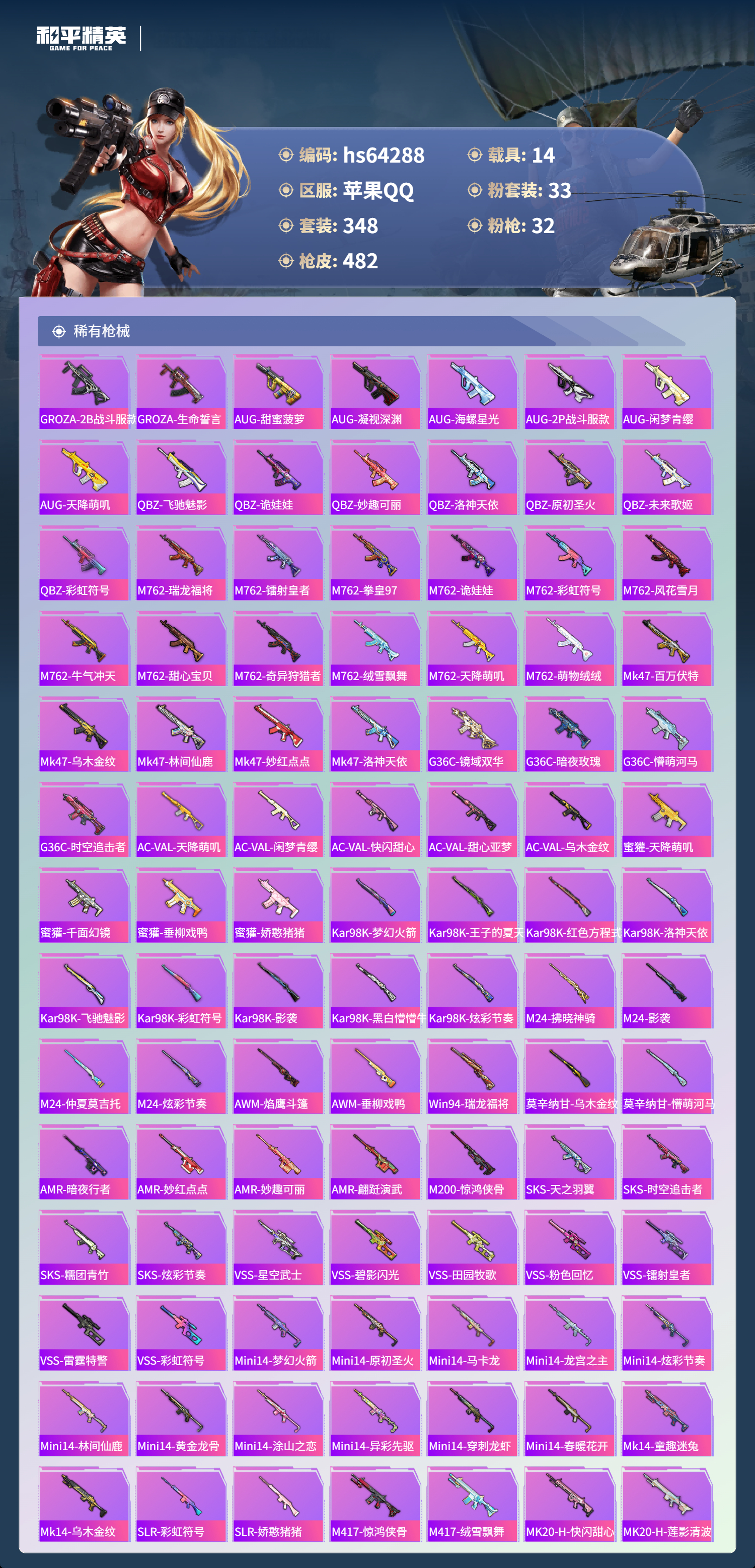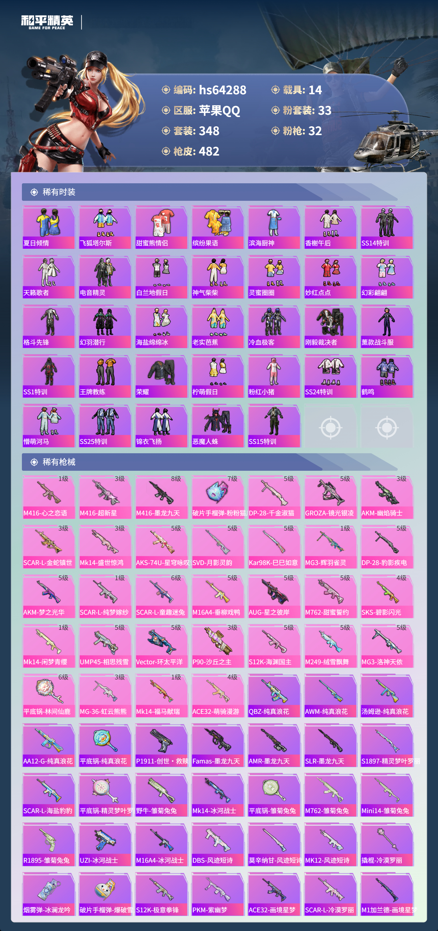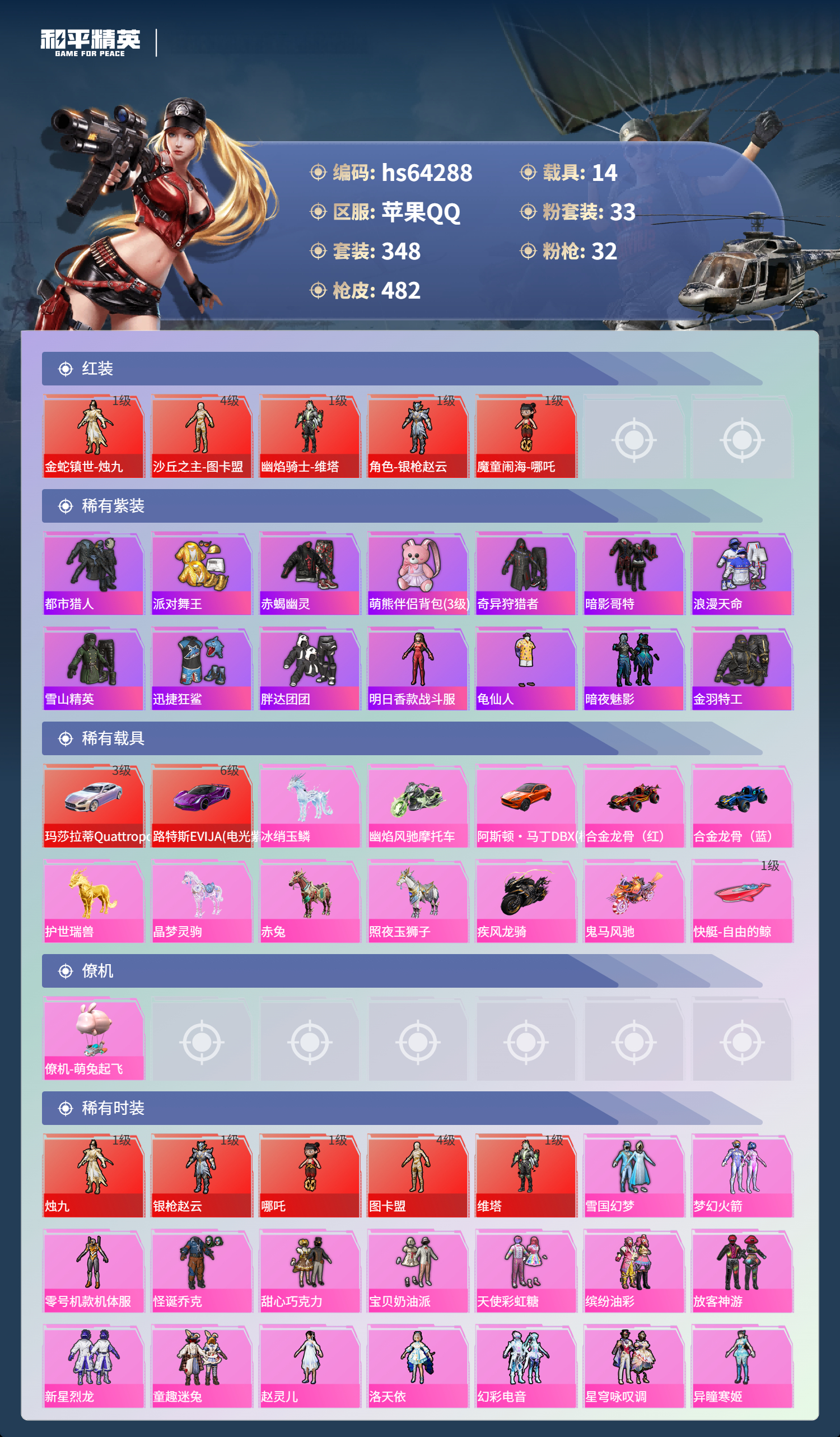 hs64288 苹果手Q-20王牌印记-有战神框-5红装-33粉装-32特效枪-14载具-热力值-348套装-482枪皮-12卓越印记-7传奇印记