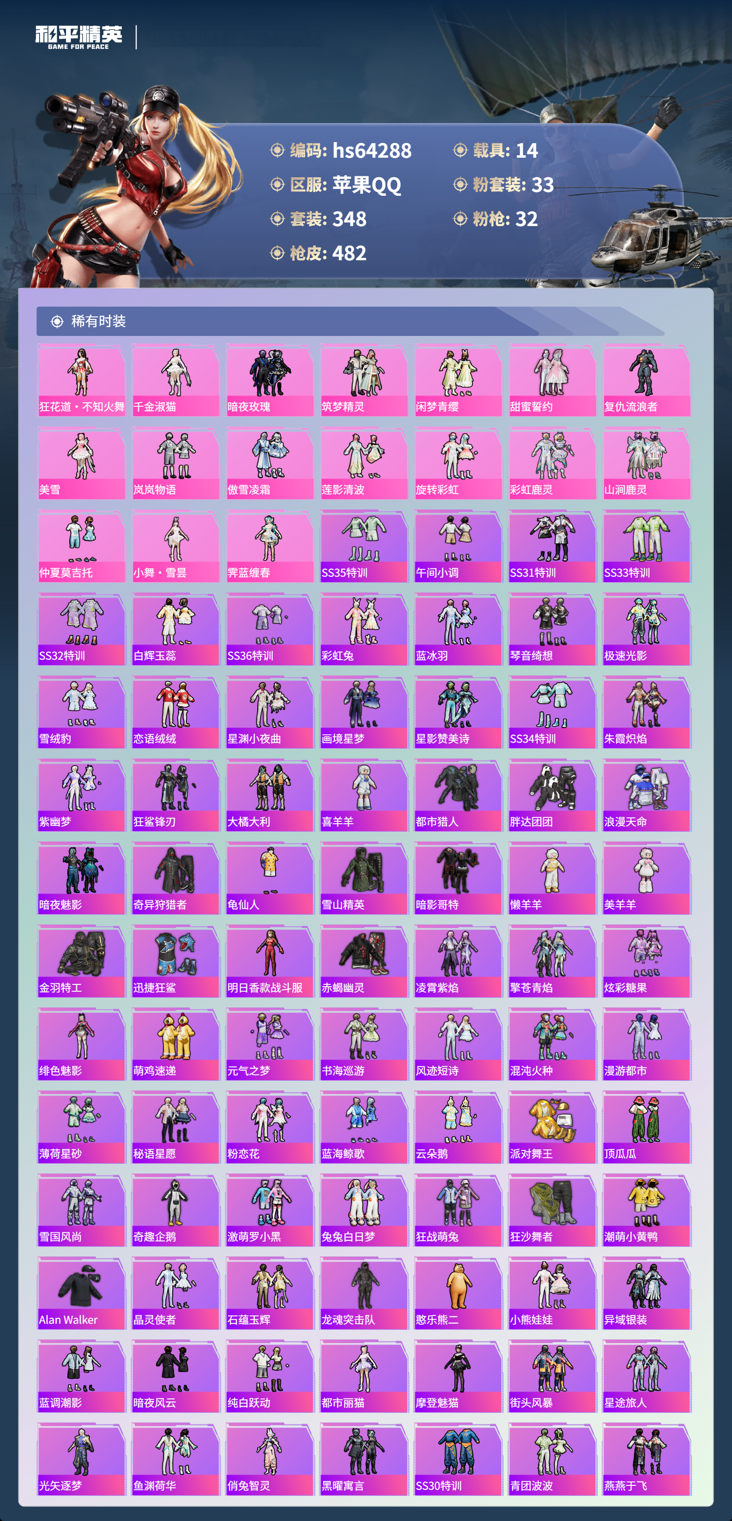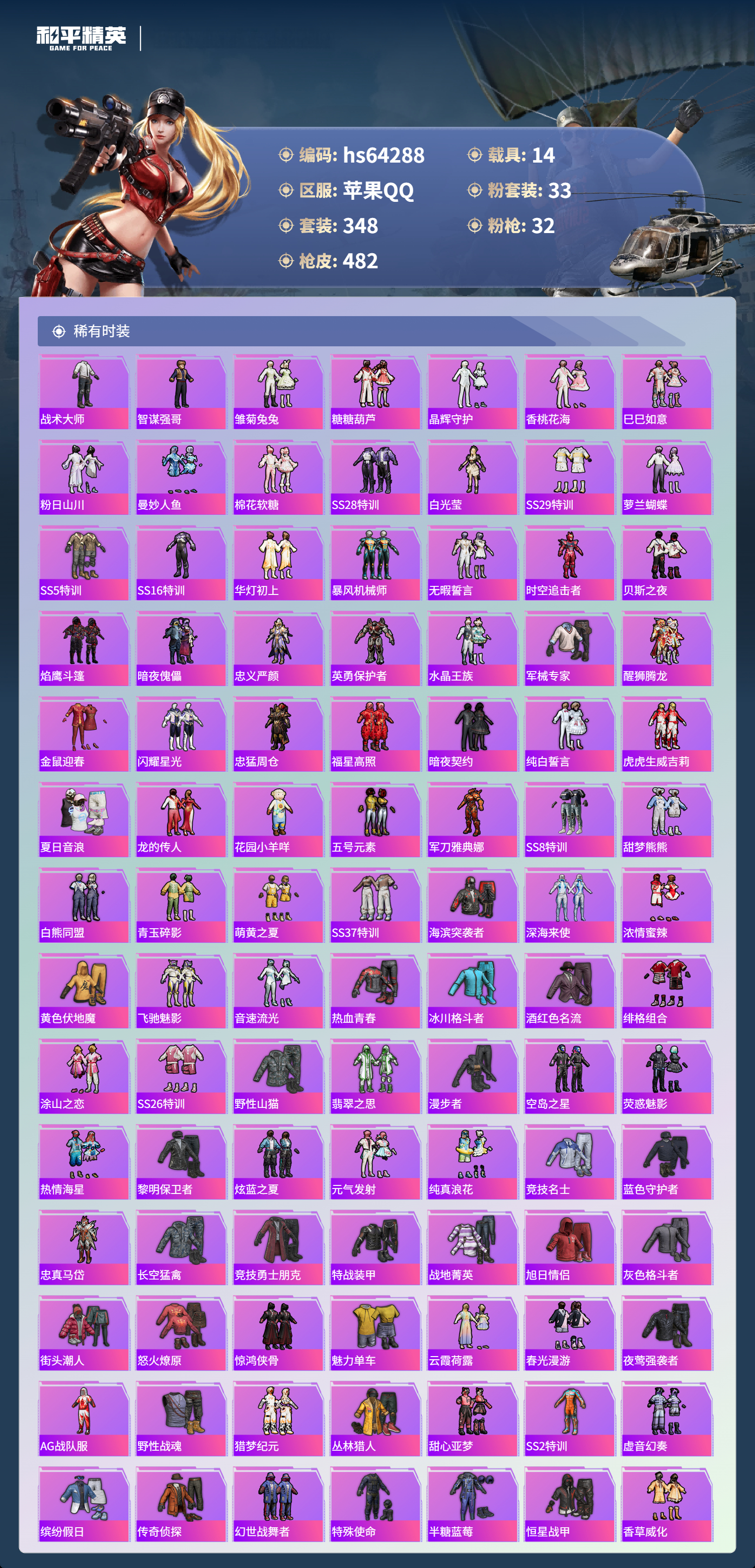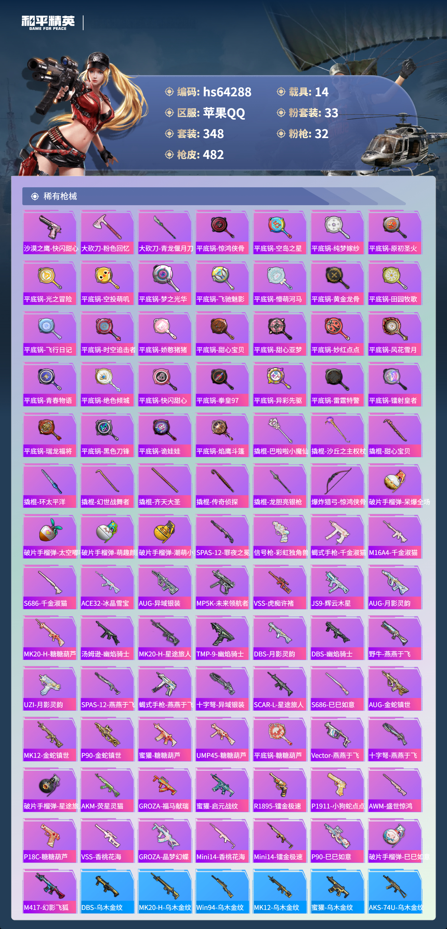 hs64288 苹果手Q-20王牌印记-有战神框-5红装-33粉装-32特效枪-14载具-热力值-348套装-482枪皮-12卓越印记-7传奇印记