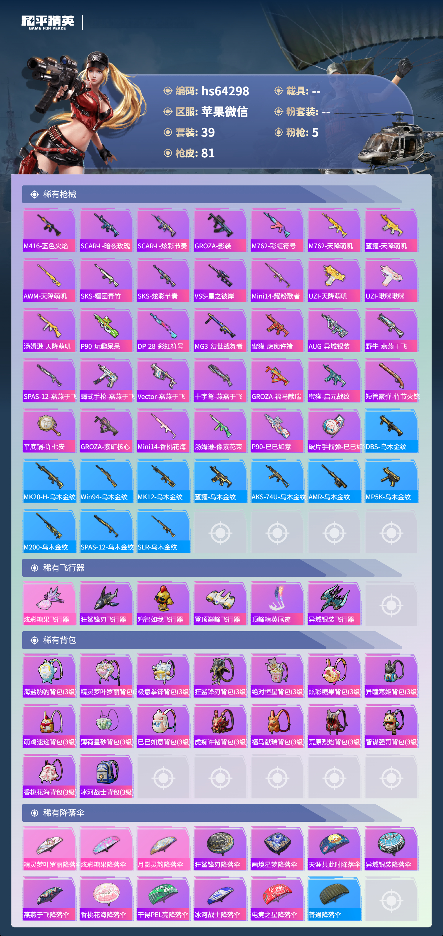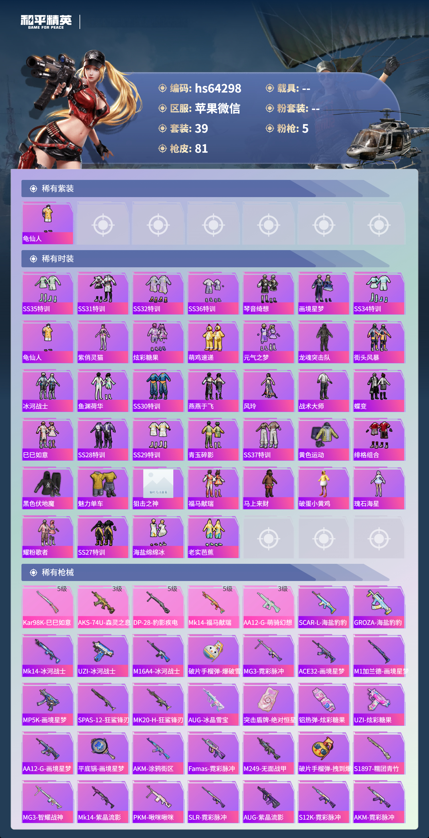 hs64298 苹果微信-0王牌印记-5特效枪-21153热力值-39套装-81枪皮