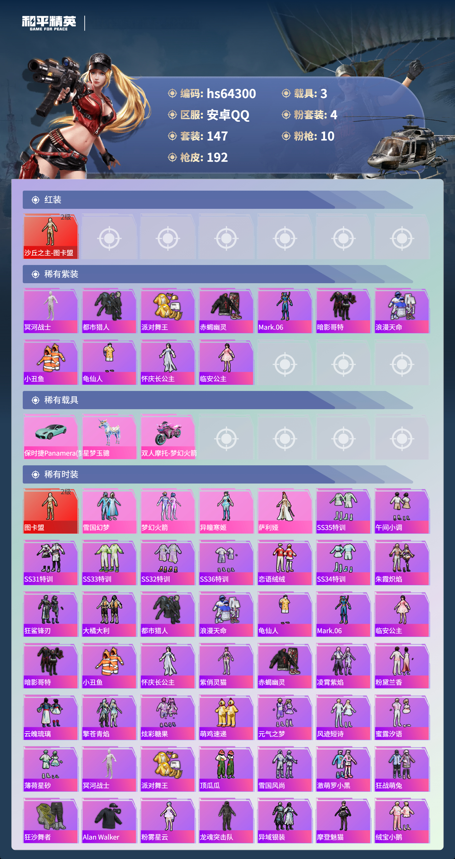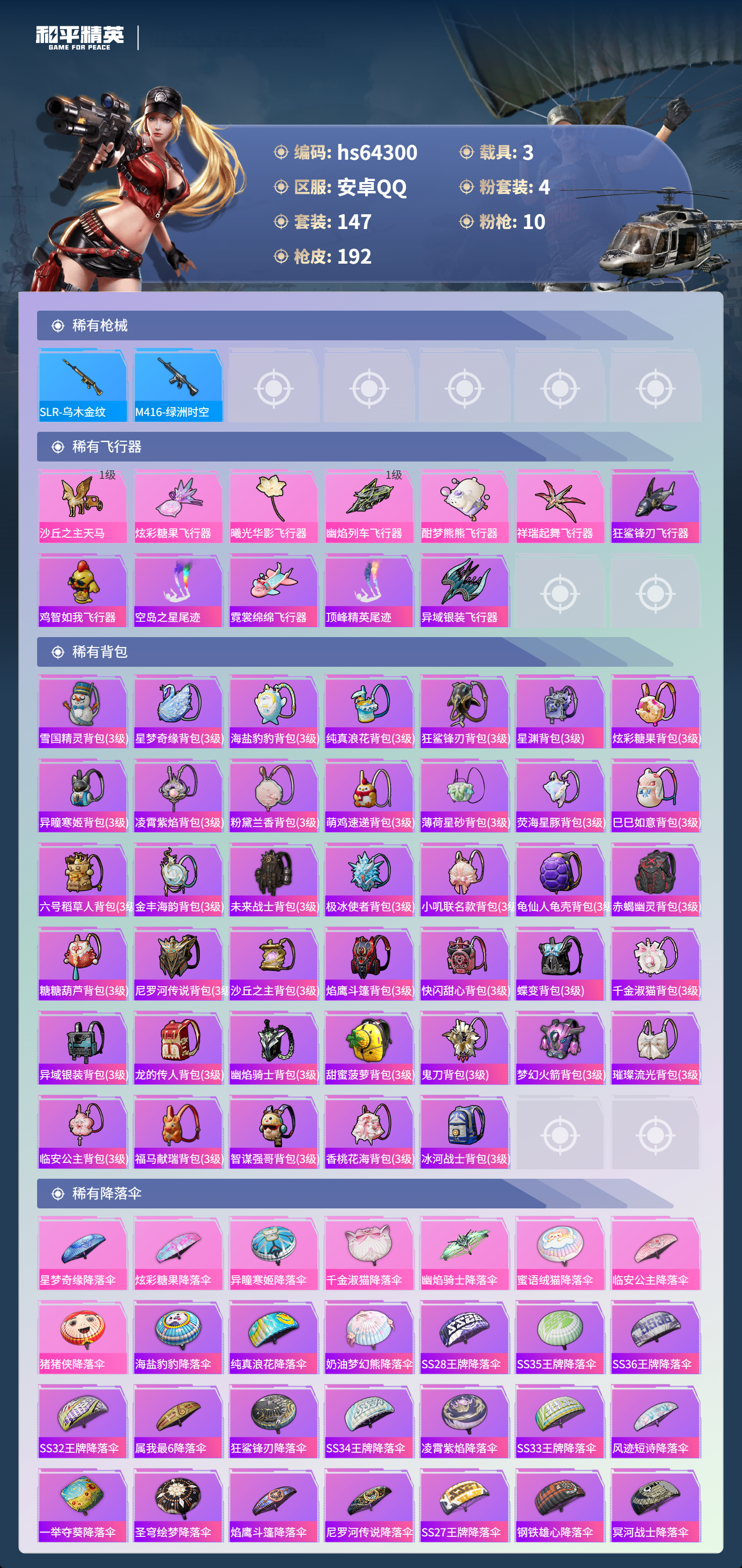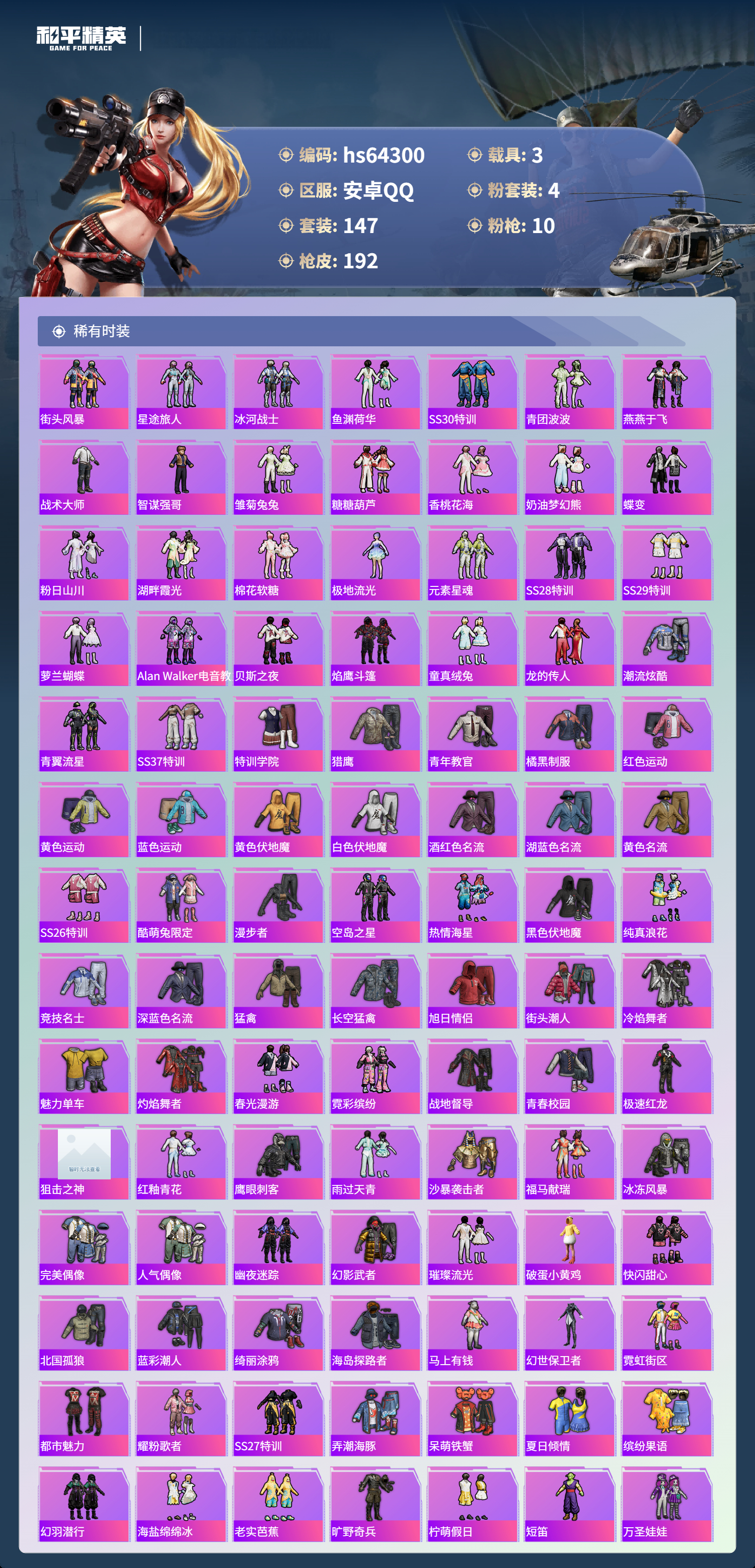 hs64300 安卓手Q-11王牌印记-1红装-4粉装-10特效枪-3载具-63514热力值-147套装-192枪皮-5卓越印记