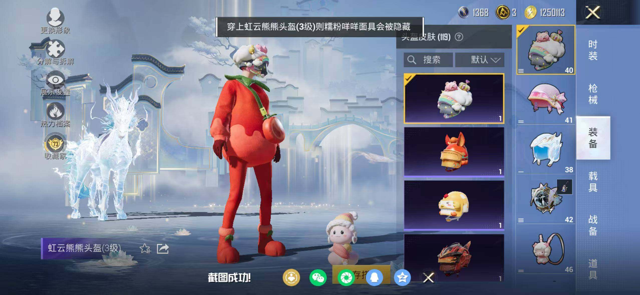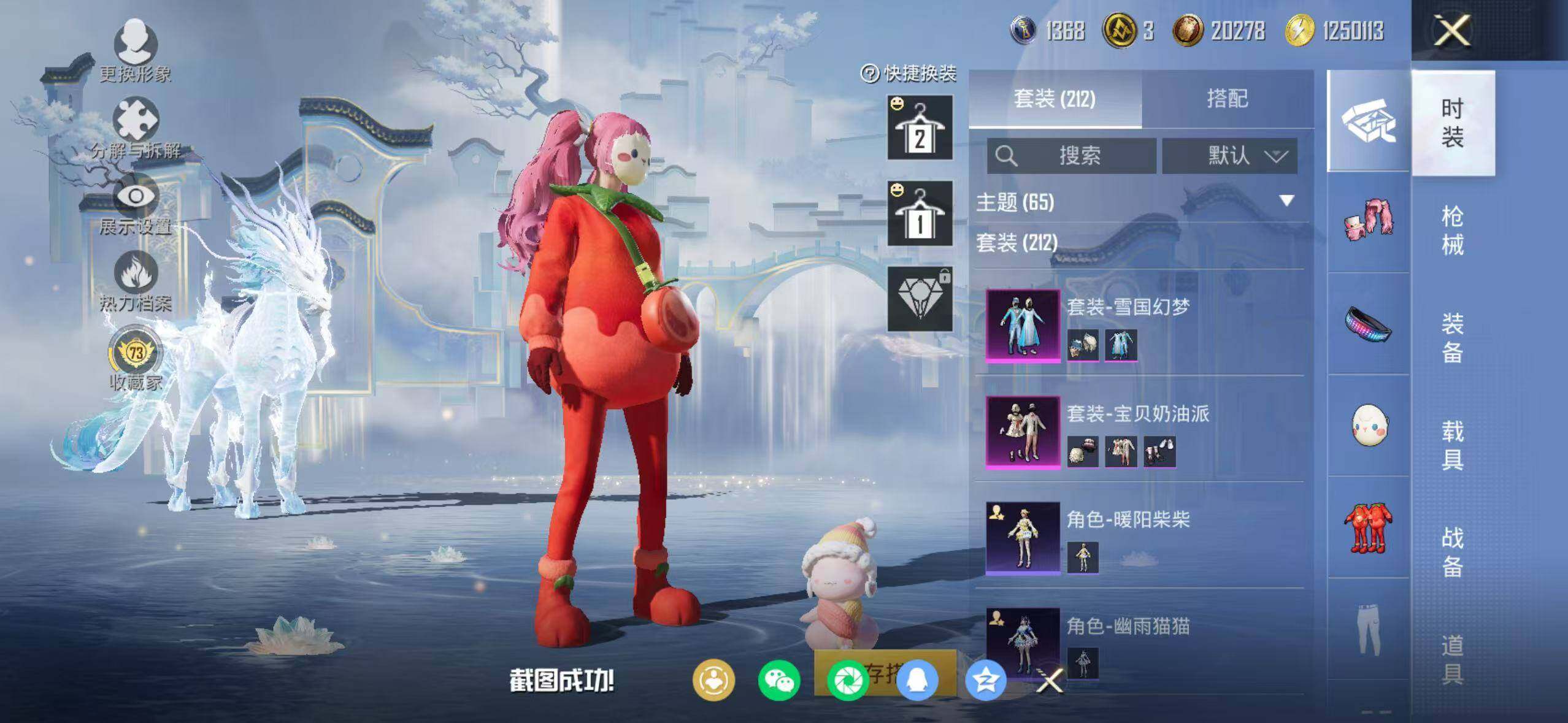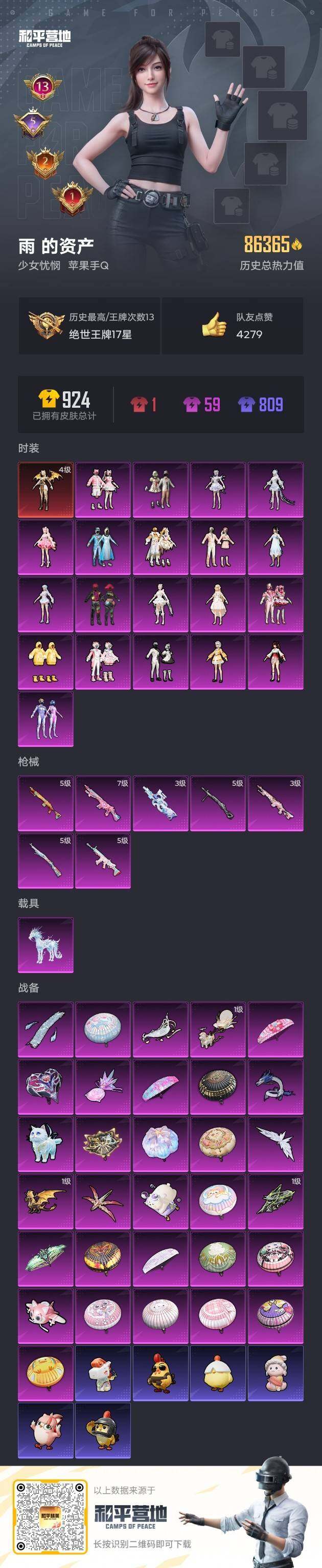 苹果 手Q-1神装-20粉装-7特效枪-1载具-12粉色飞行器-86365热力值-13王牌印记-211套装-223枪皮